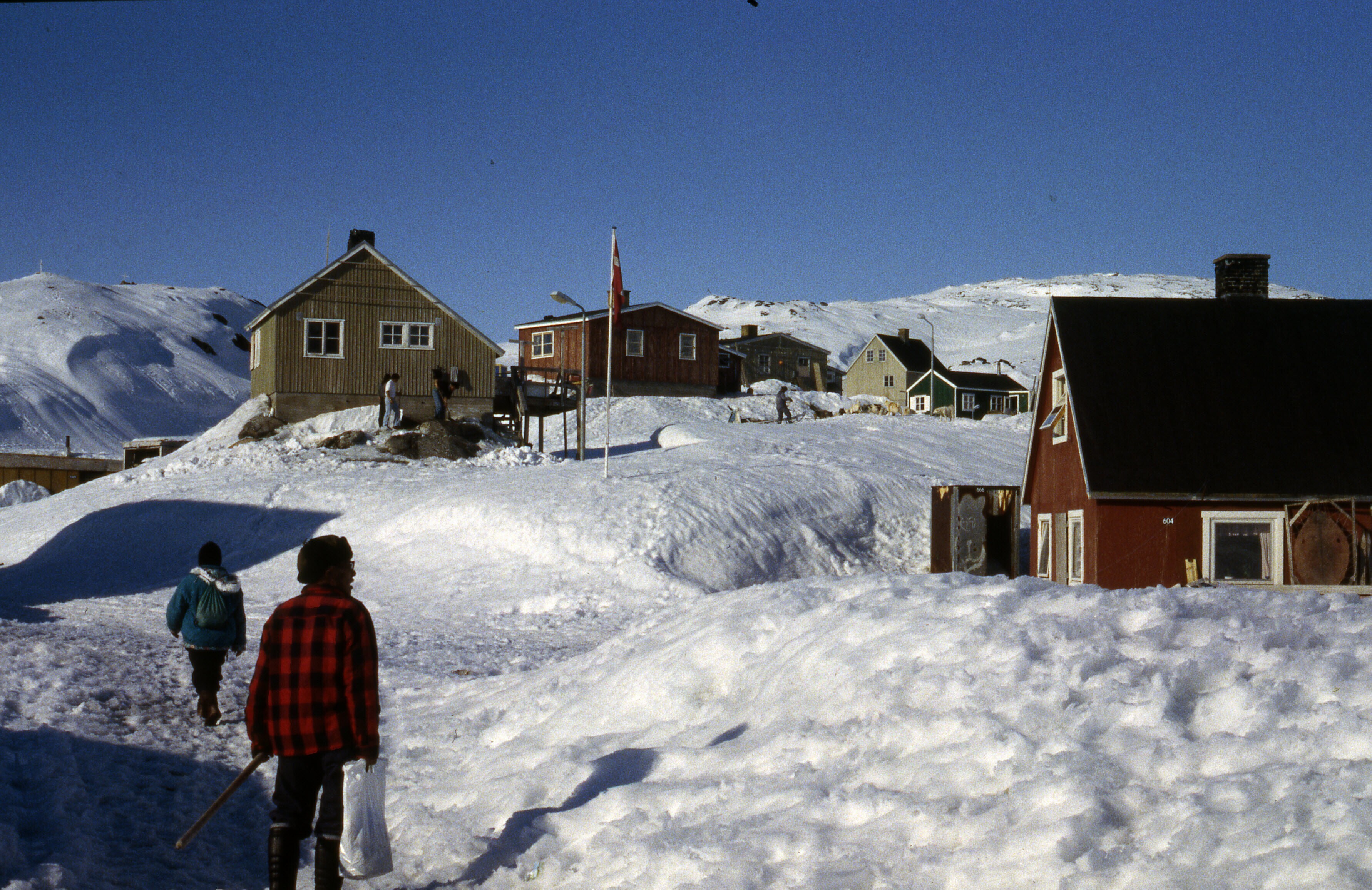 - Lars en Asta Jonathansen zijn op weg door het dorp. Ze komen terug van de visvangst, te zien aan het plastic tasje met vis en de ijspriem om een wak te kunnen maken. Tiniteqilaaq, maart-april