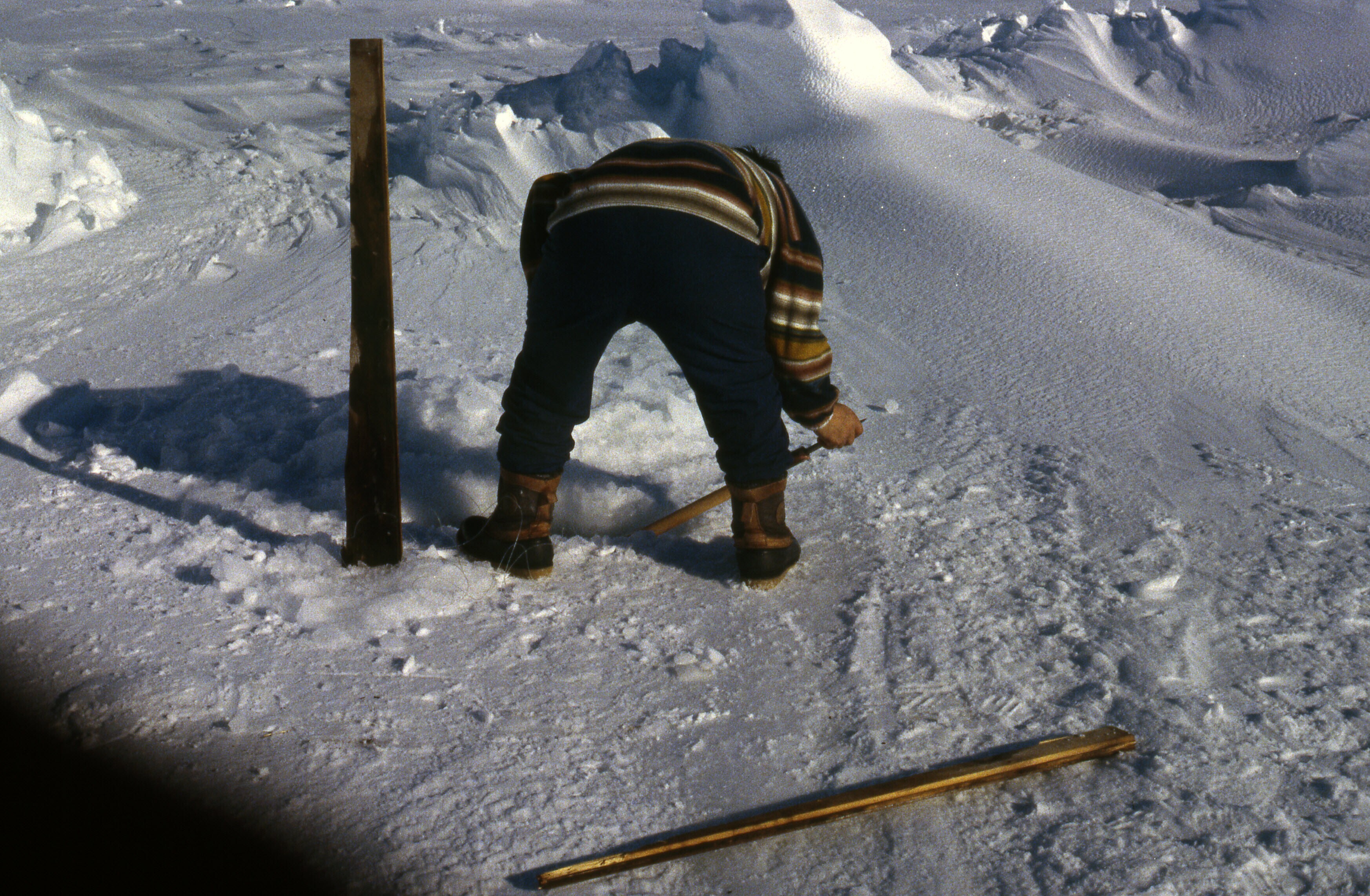 - Thobias Ignathiussen (schoonzoon van Lars Jonathansen) steekt een stokje onder het ijs van het ene wak naar het andere waaraan het zeehondenet bevestigd is. Deze handeling is onderdeel van het plaatsen van het zeehondennet onder het ijs. Tiniteqilaaq, m