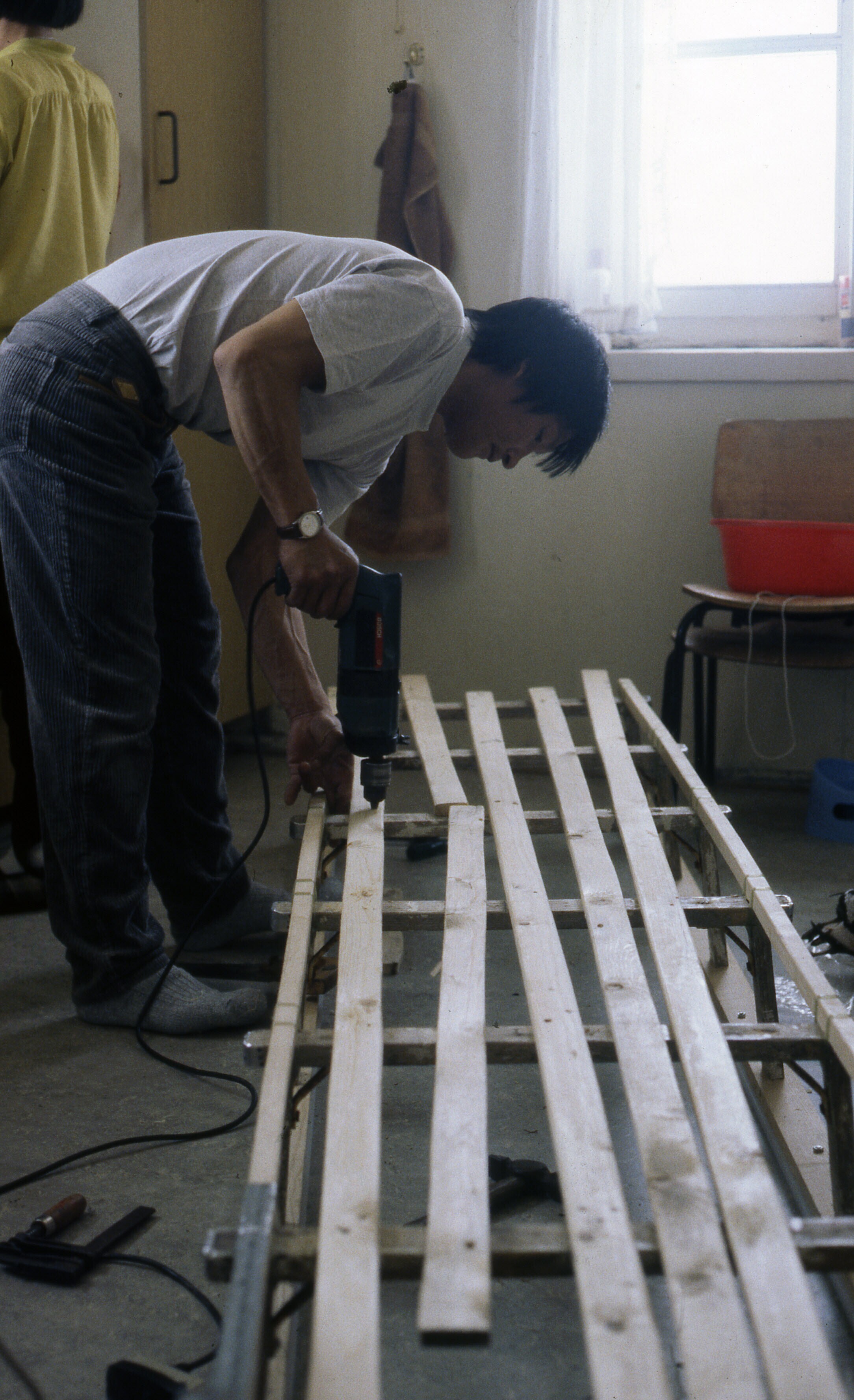 - Zoon van Vitus Kajammat is in zijn ouderlijk huis bezig een slee te bouwen. Hij is bezig de lange houten dragers op de slee vast te schroeven met een electrische boor/schroevedraaier. Tiniteqilaaq, maart-april .