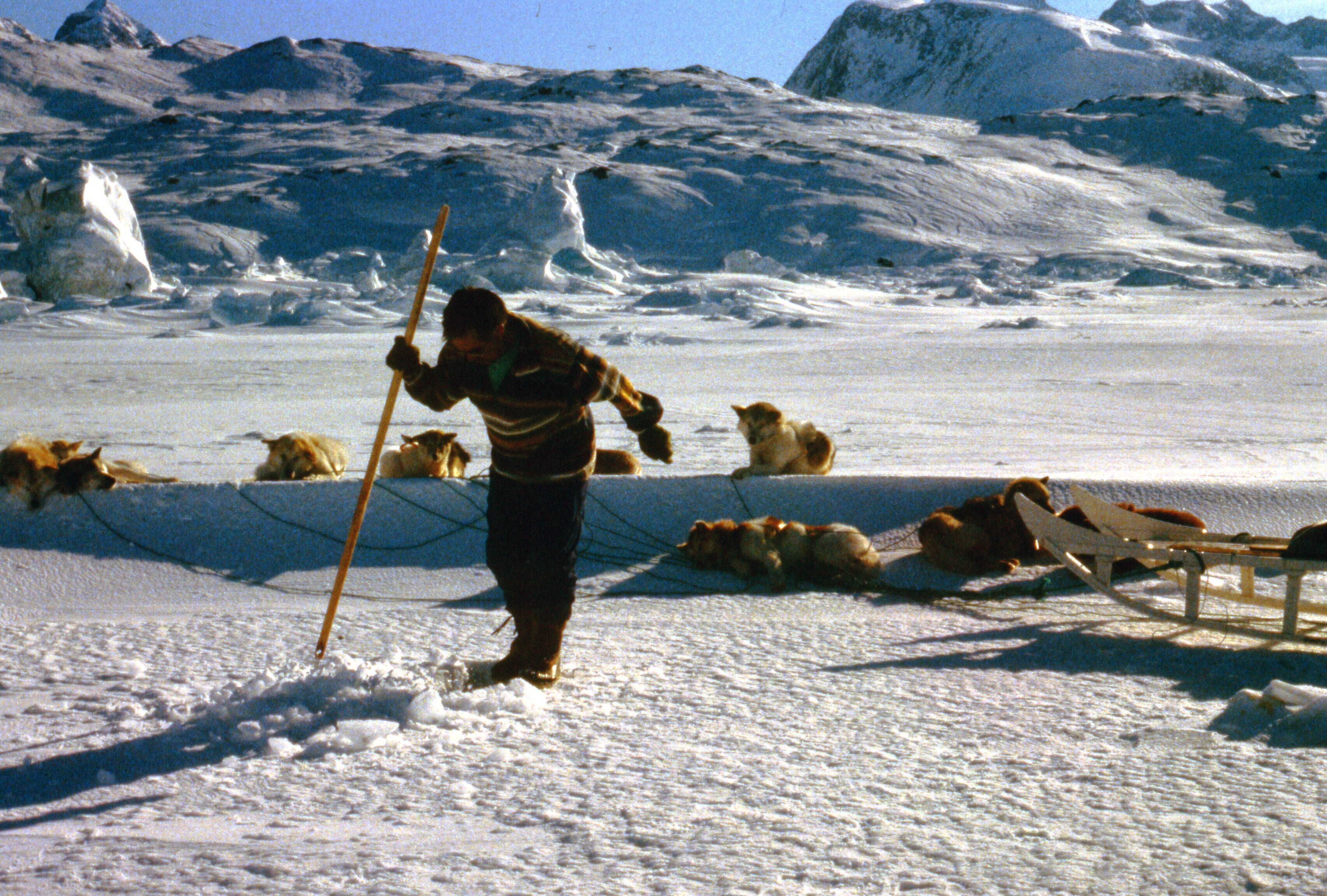 - Tobias Ignathiussen is op het ijs bezig een zeehondennet uit te zetten. (zie -). Tiniteqilaaq, Sermilikfjord, maart .