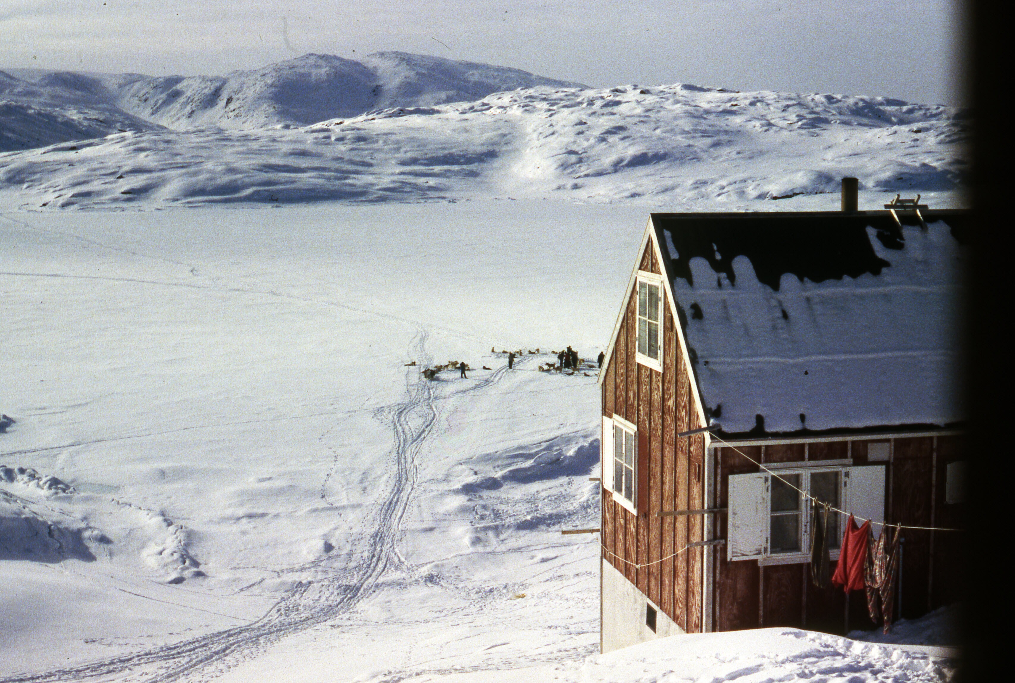 - Twee hondensleden verzamelen zich aan de voet van het dorp om gezamelijk te vertrekken naar Ammassalik. Tiniteqilaaq, maart .