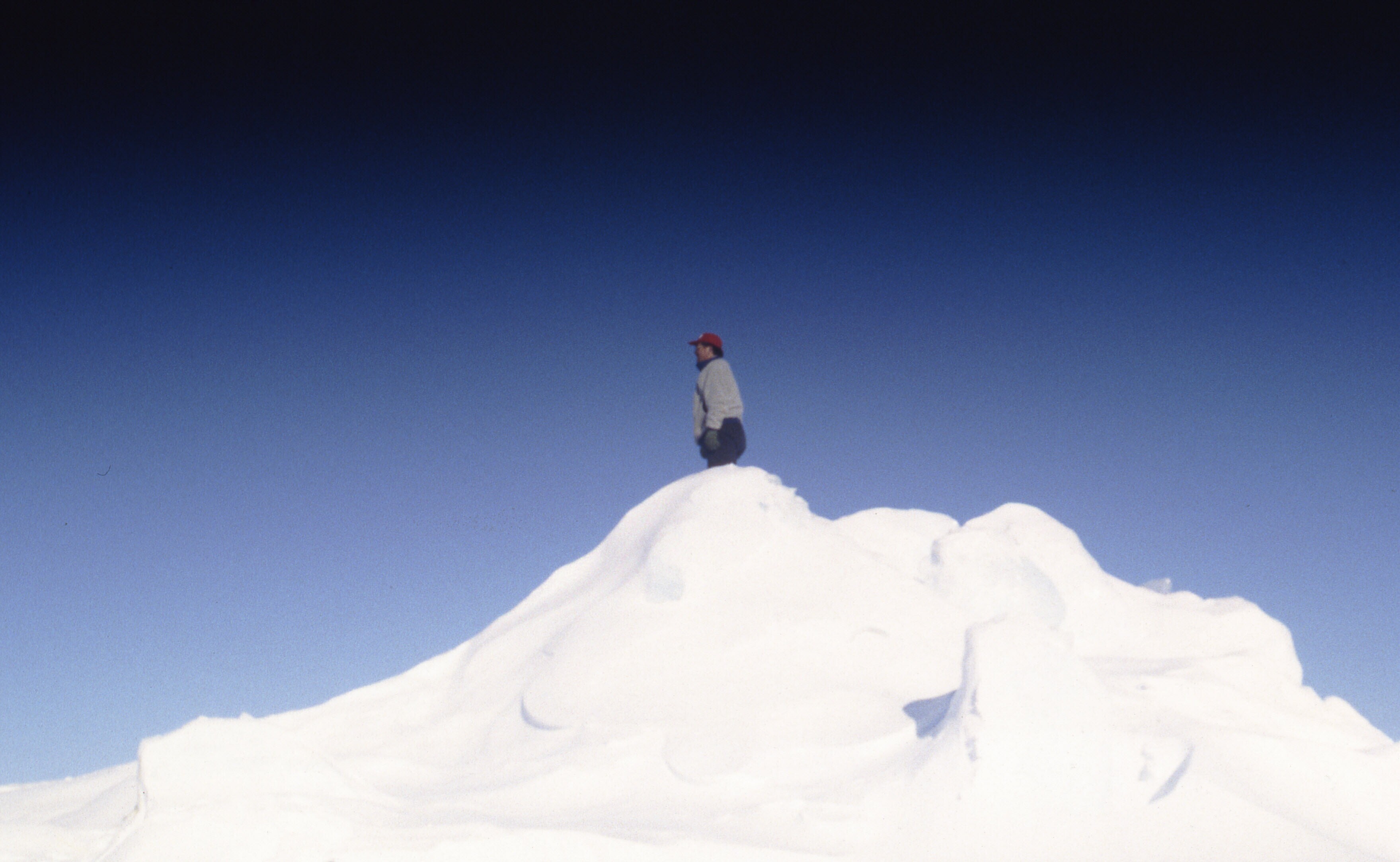- Tobias Ignathiussen staat op de uitkijk op een ijsberg in de Sermilik-fjord. Tiniteqilaaq, maart-april .