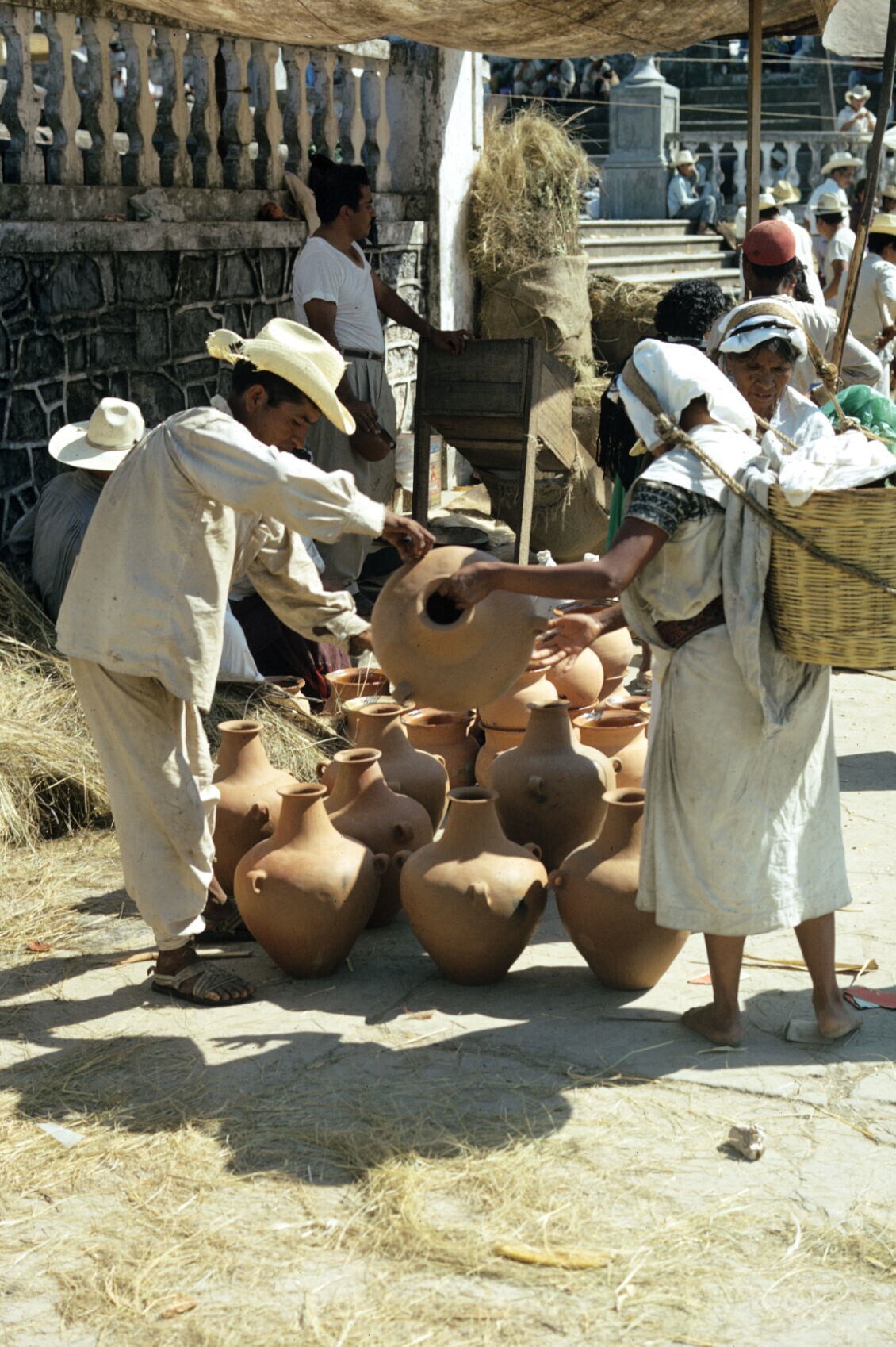 vrouwen, manden dragend m.b.v. mecapal (draagband) bij aardewerk potten op straatmarkt