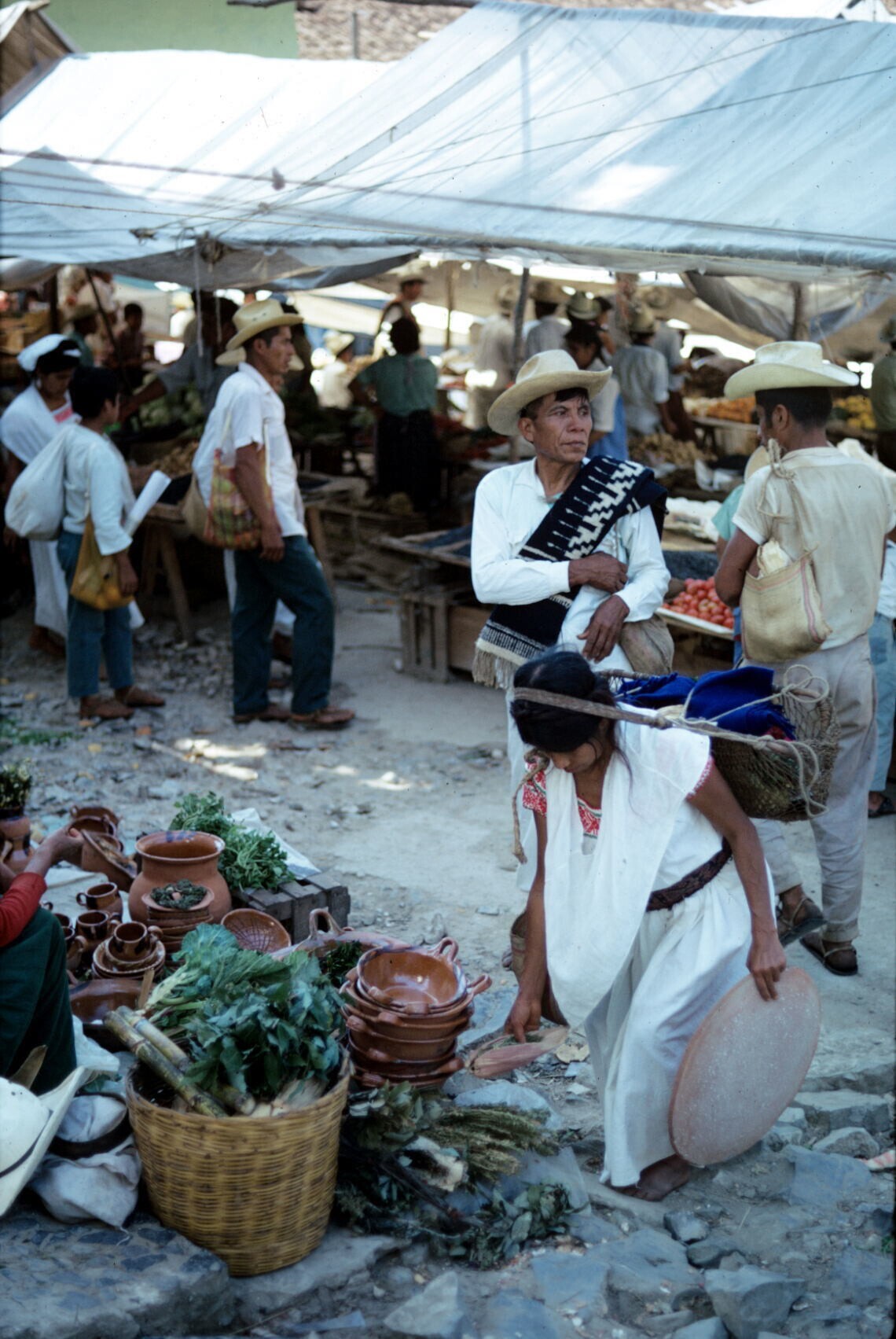 straatscène; NB vrouw met "maxtahual" (tulbandachtige haardracht)