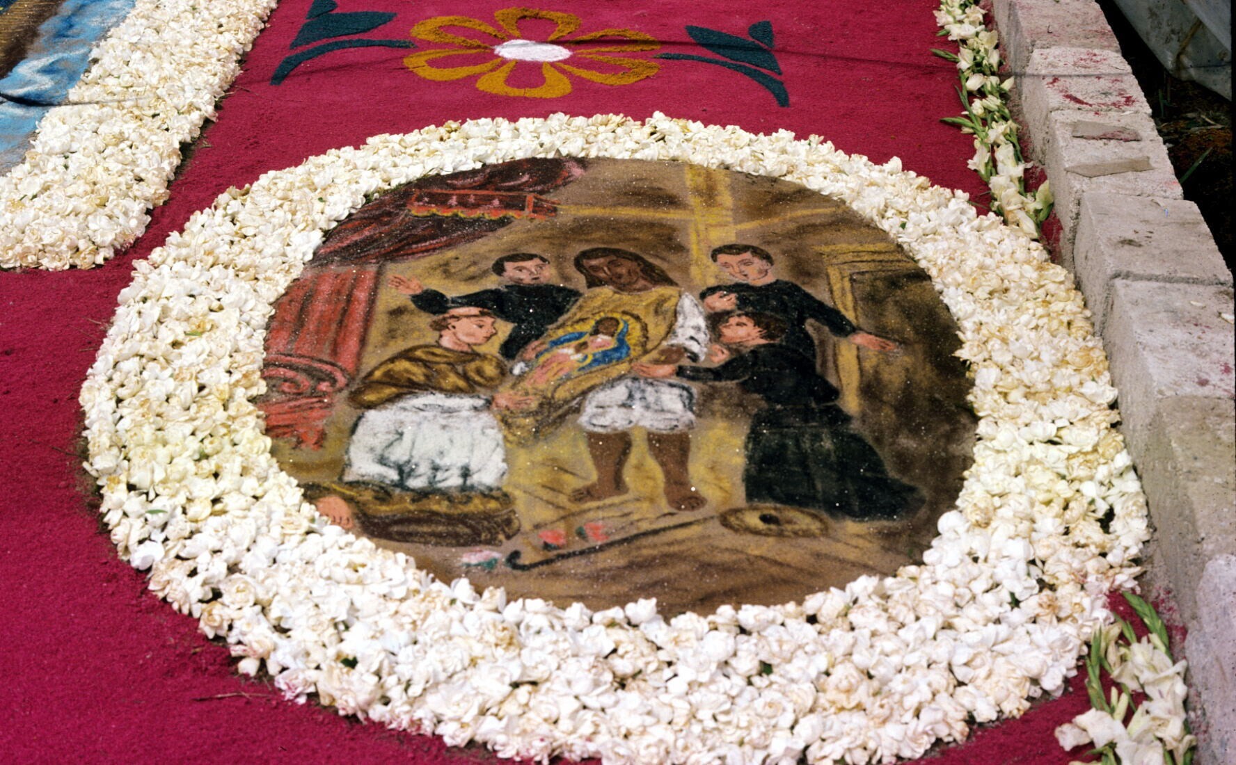 bloemenmozaïek met voorstelling van Juan Diego bij bisschop Zumarraga