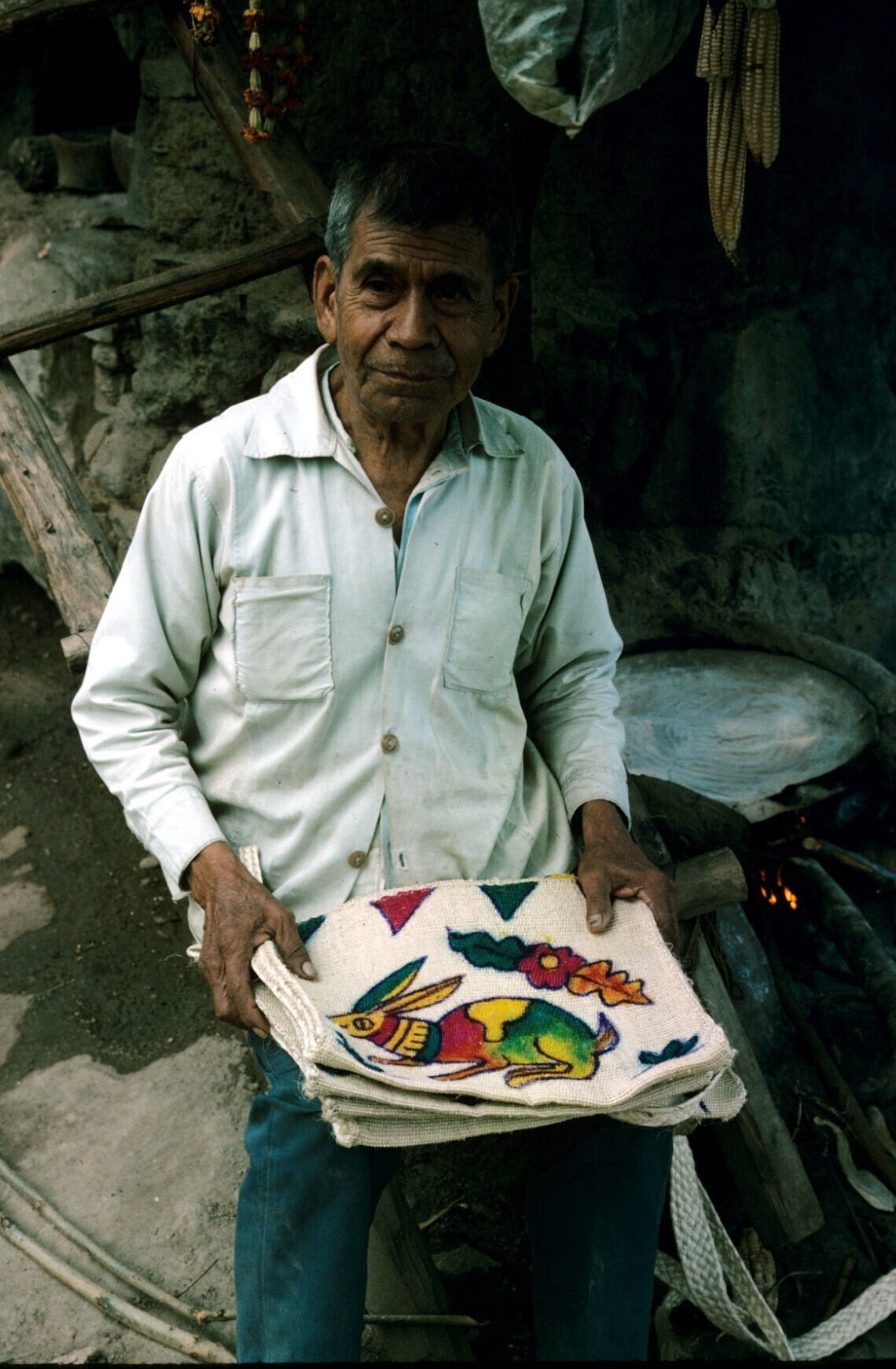 vader van wever Celacio Jiménez met gedecoreerde ixtle-(agavevezel-)tassen