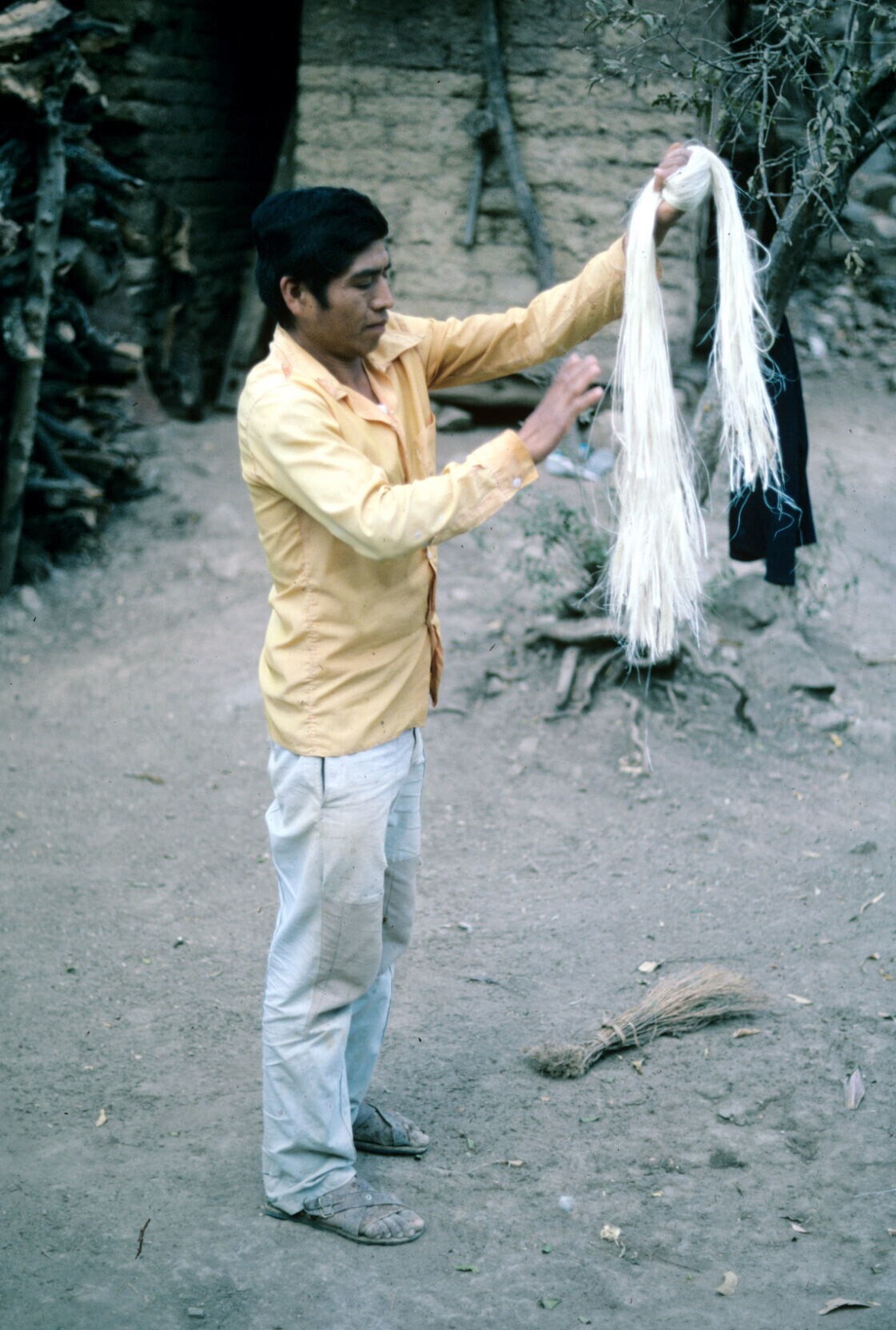 Celacio Jiménez bereidt weven van 'morral' (tas) van agavevezels voor