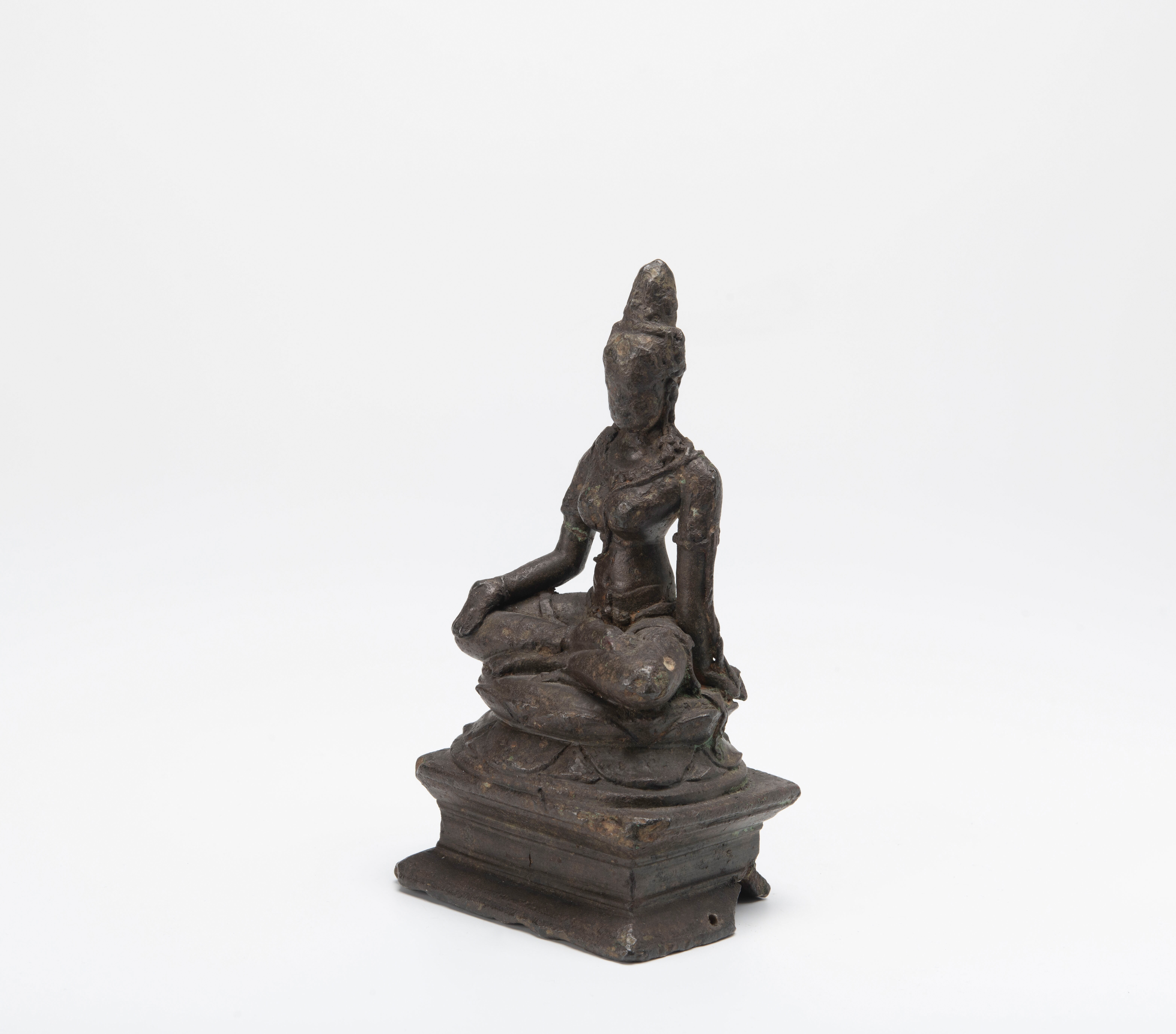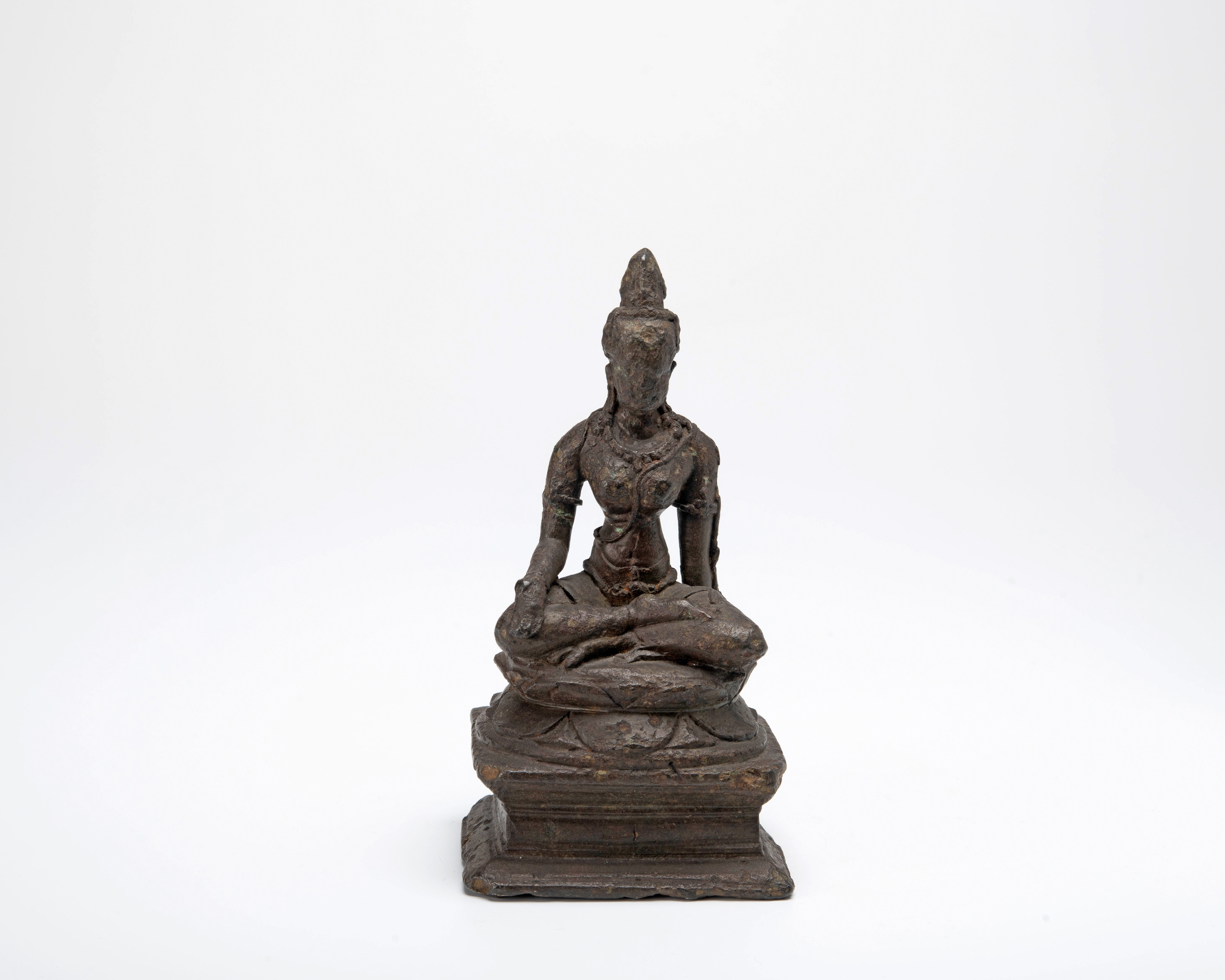 Dit beeldje van een vrouwelijke bodhisattva heeft de handhouding van geruststelling, abhaya-mudra. Ze zit met haar rechterbeen op haar linkerbeen.
