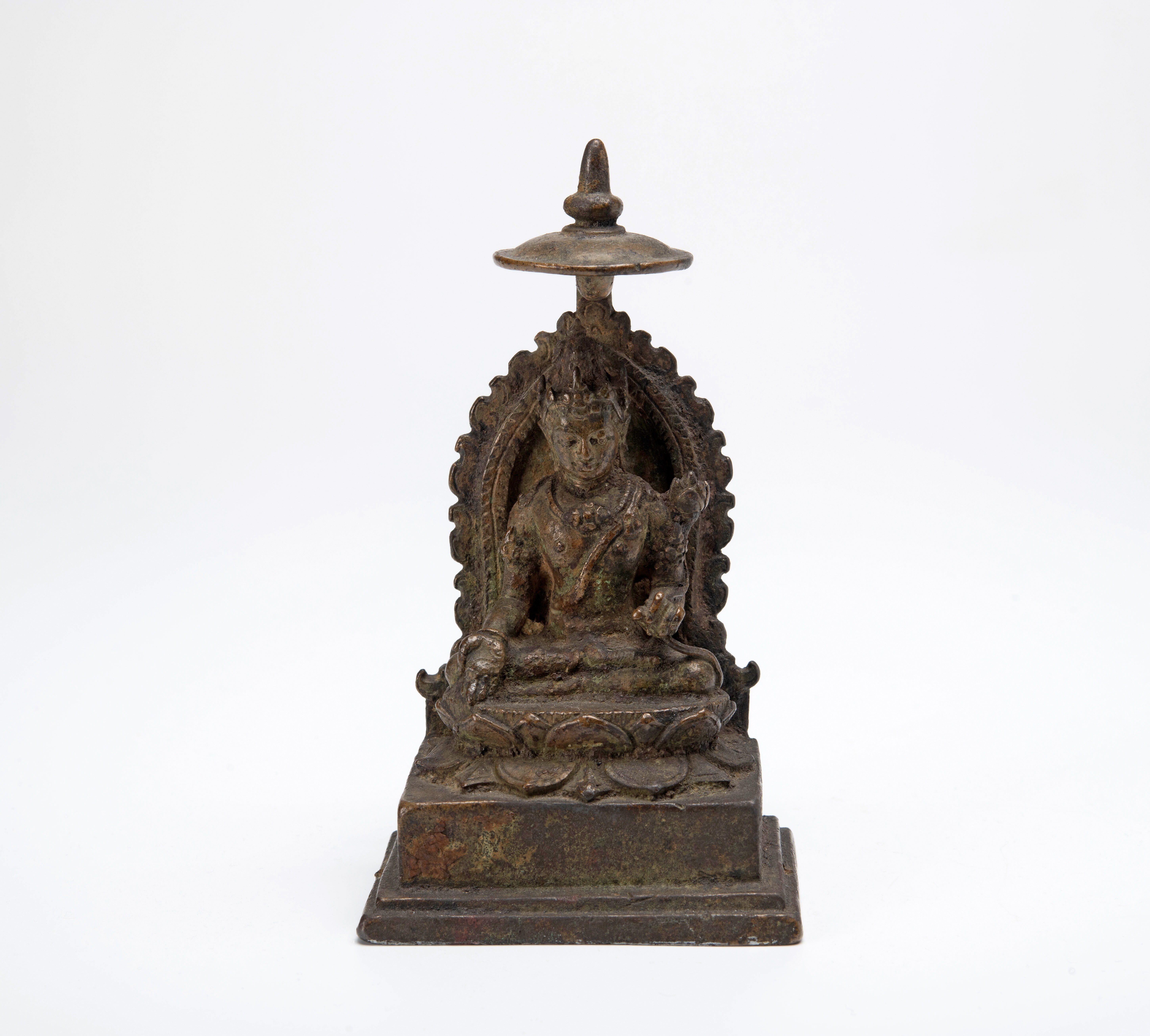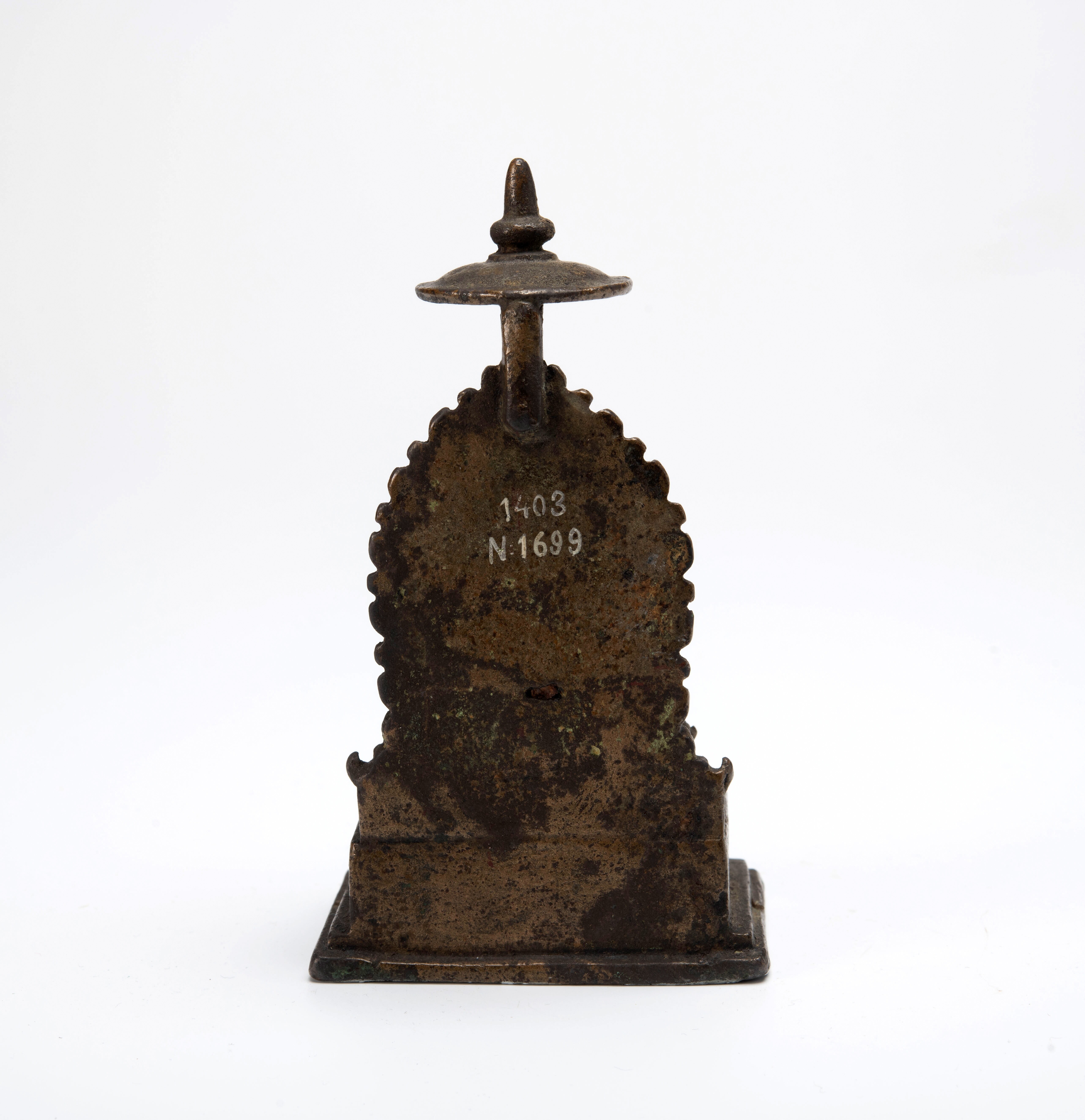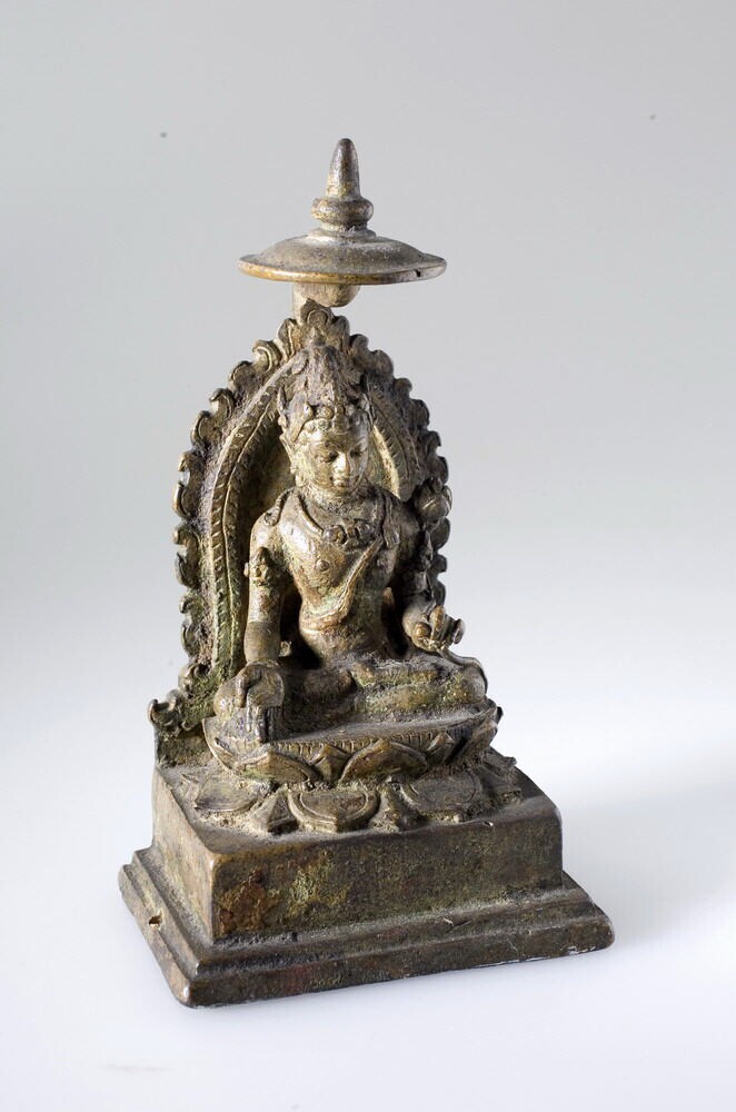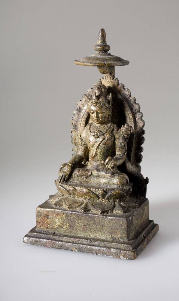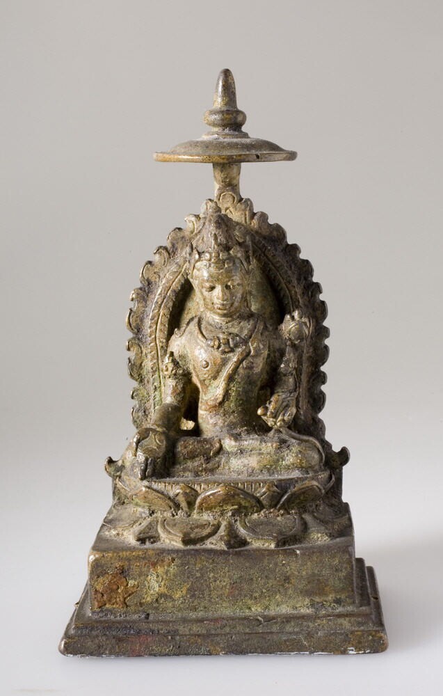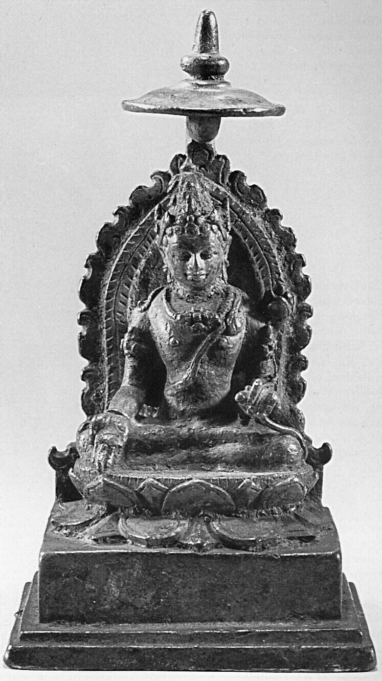 Avalokiteshvara heeft hier twee armen. De ene hand is in de houding van geven, varada-mudra, de andere houdt een lotusbloem vast. De halo heeft een visgraatmotief en een rand van simpele bladmotieven, zoals kenmerkend voor Javaanse beeldjes uit de negende eeuw.