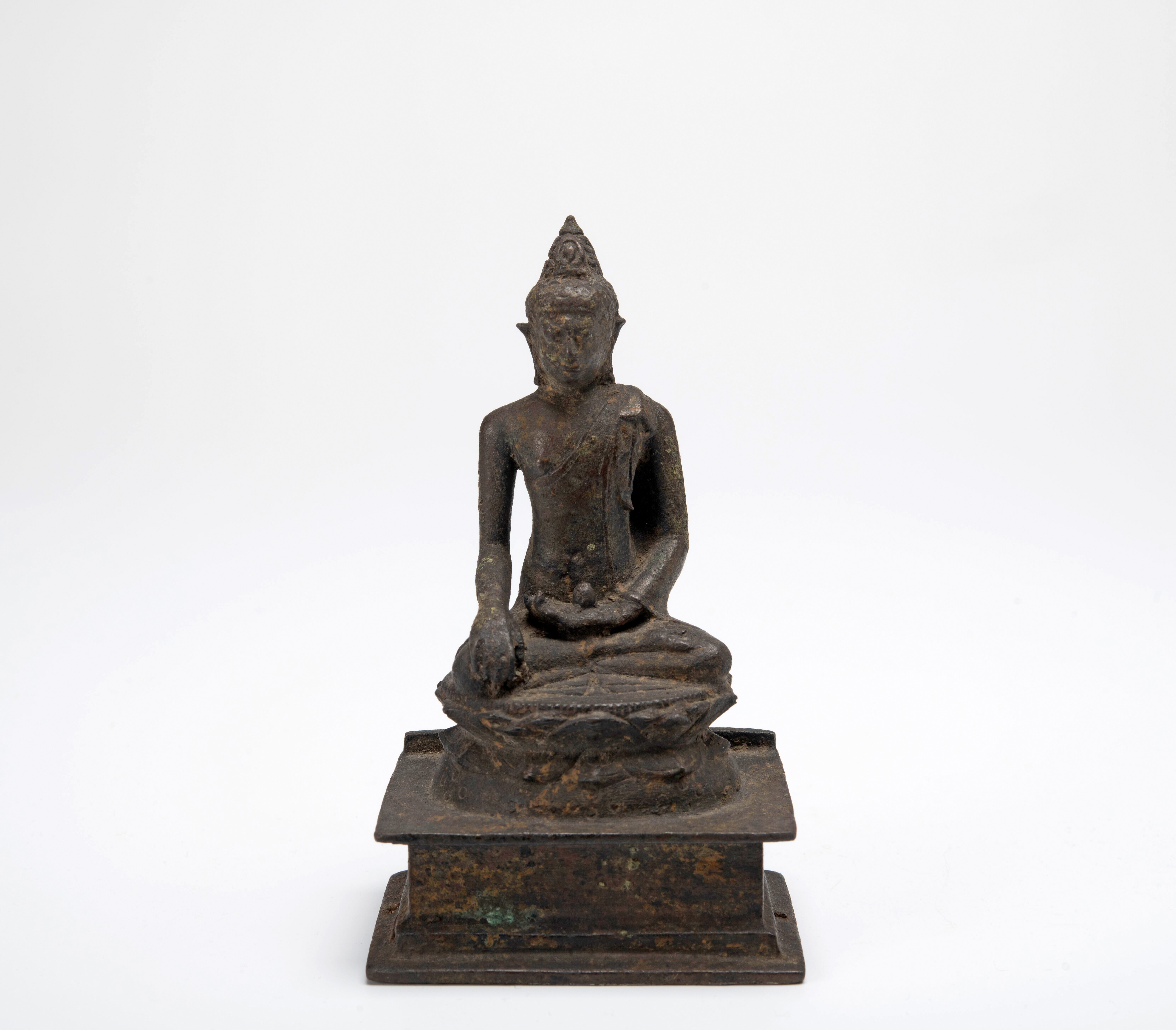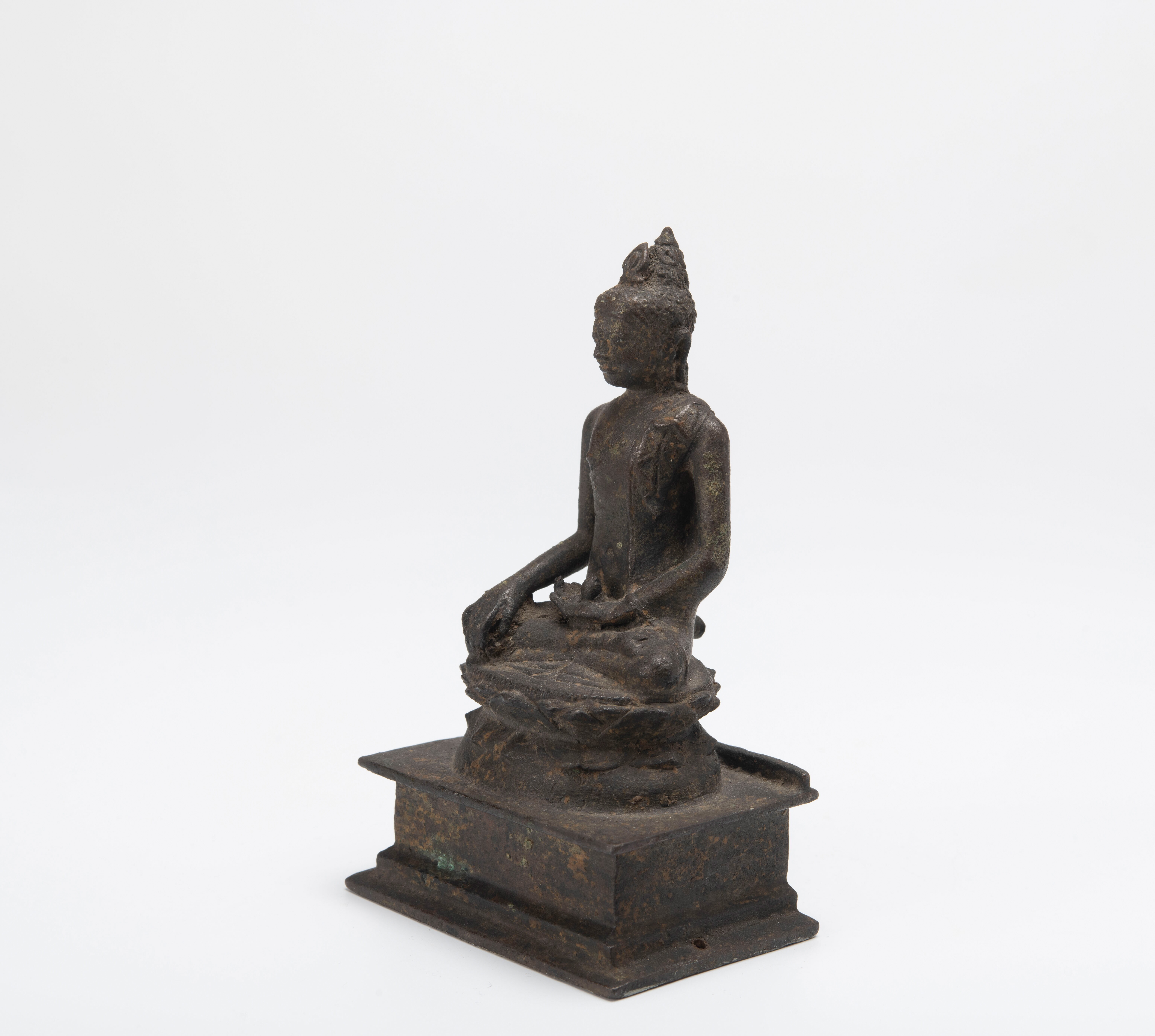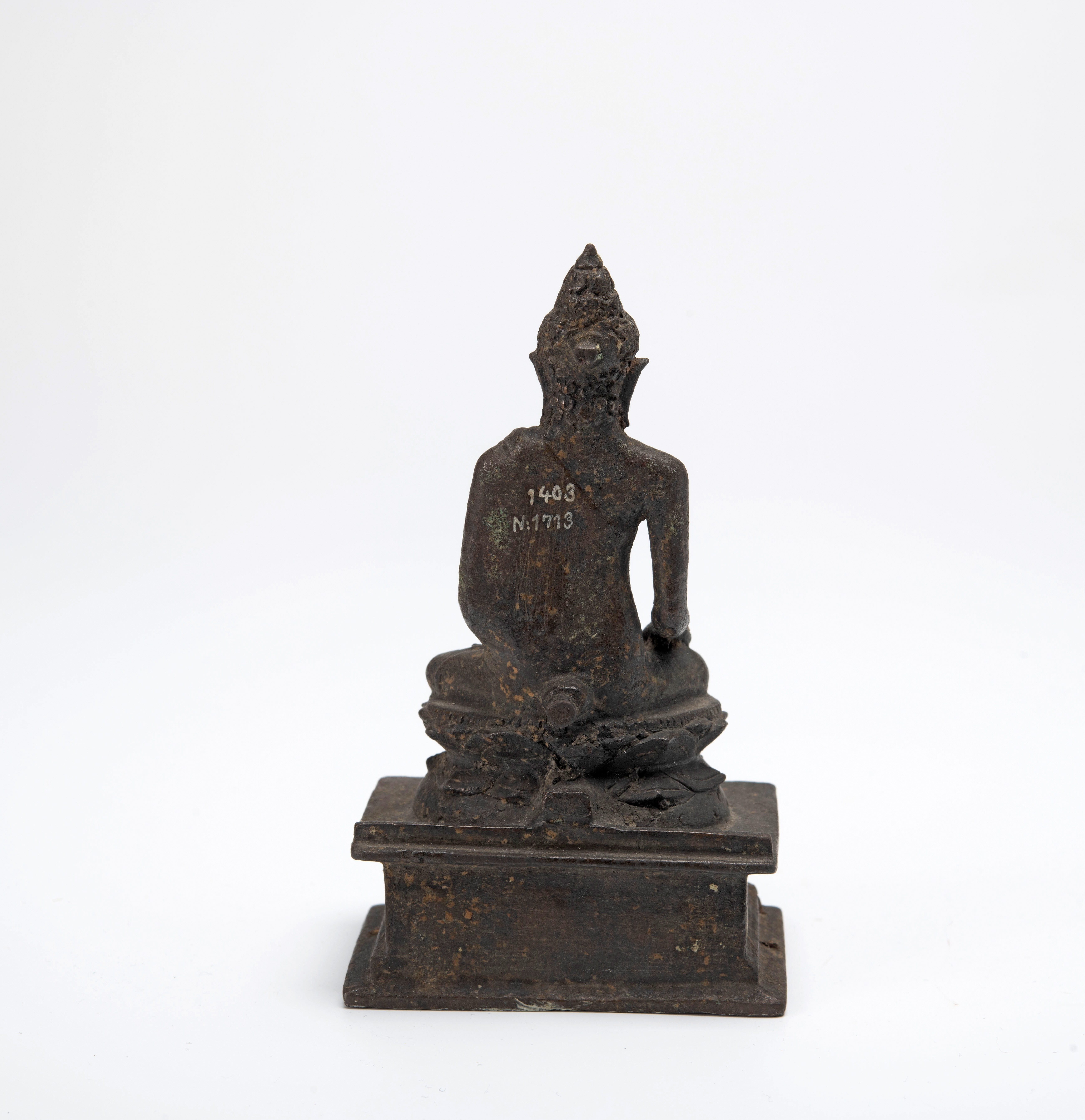 Er lijkt een kleine Boeddha of een klein ornament voor op de haarkrullen van deze Boeddha te zitten. Dat is zeer ongebruikelijk.