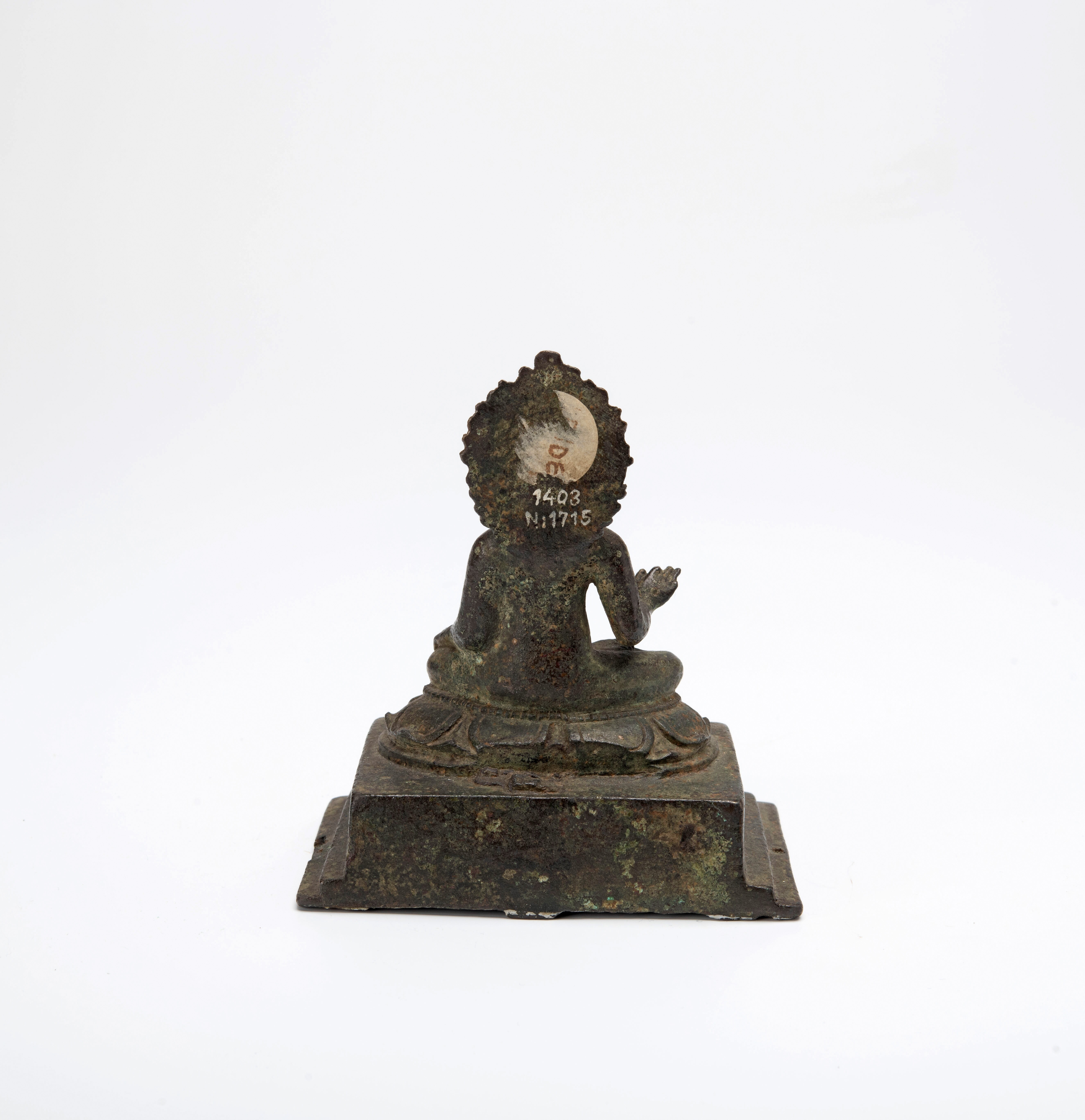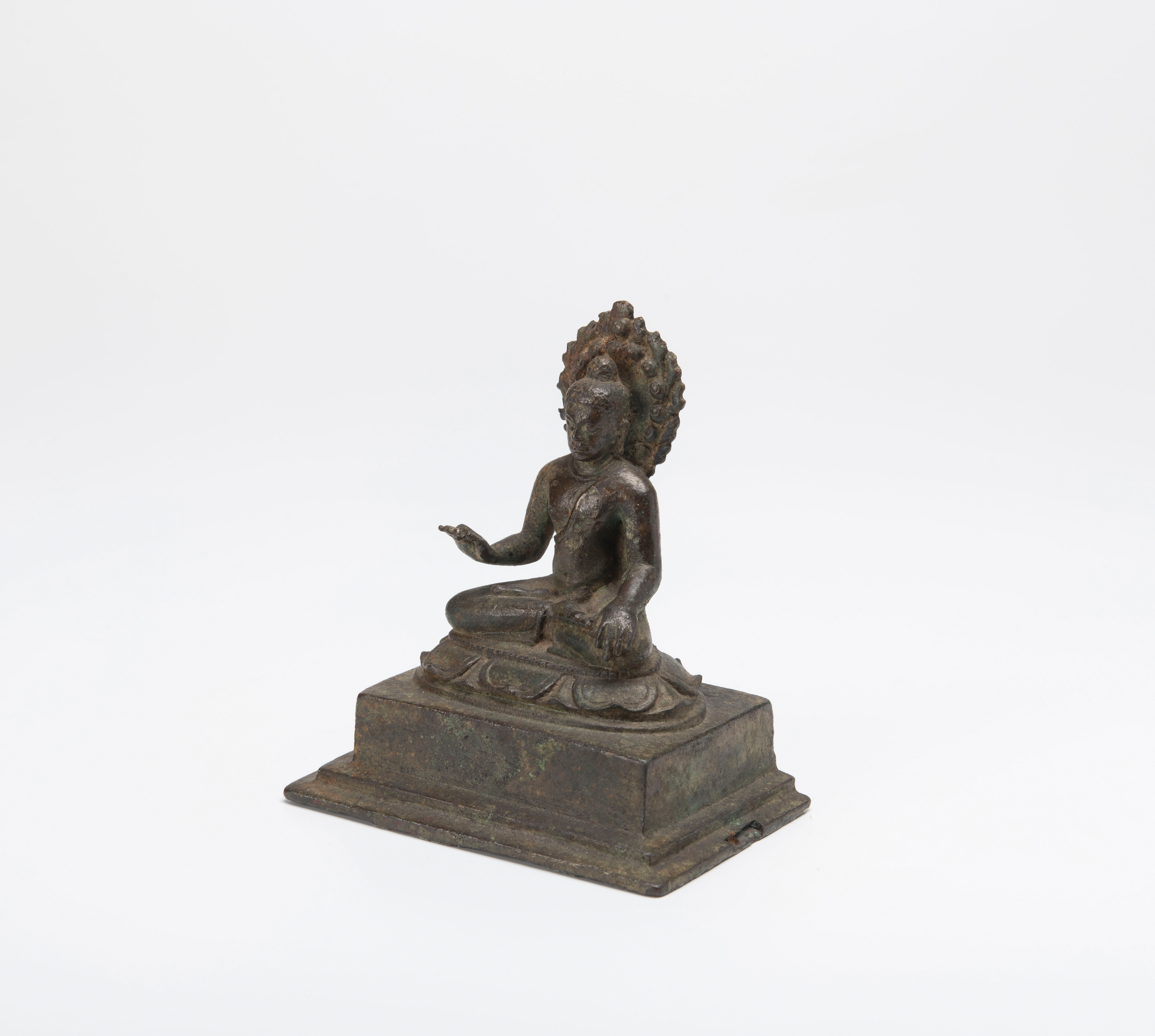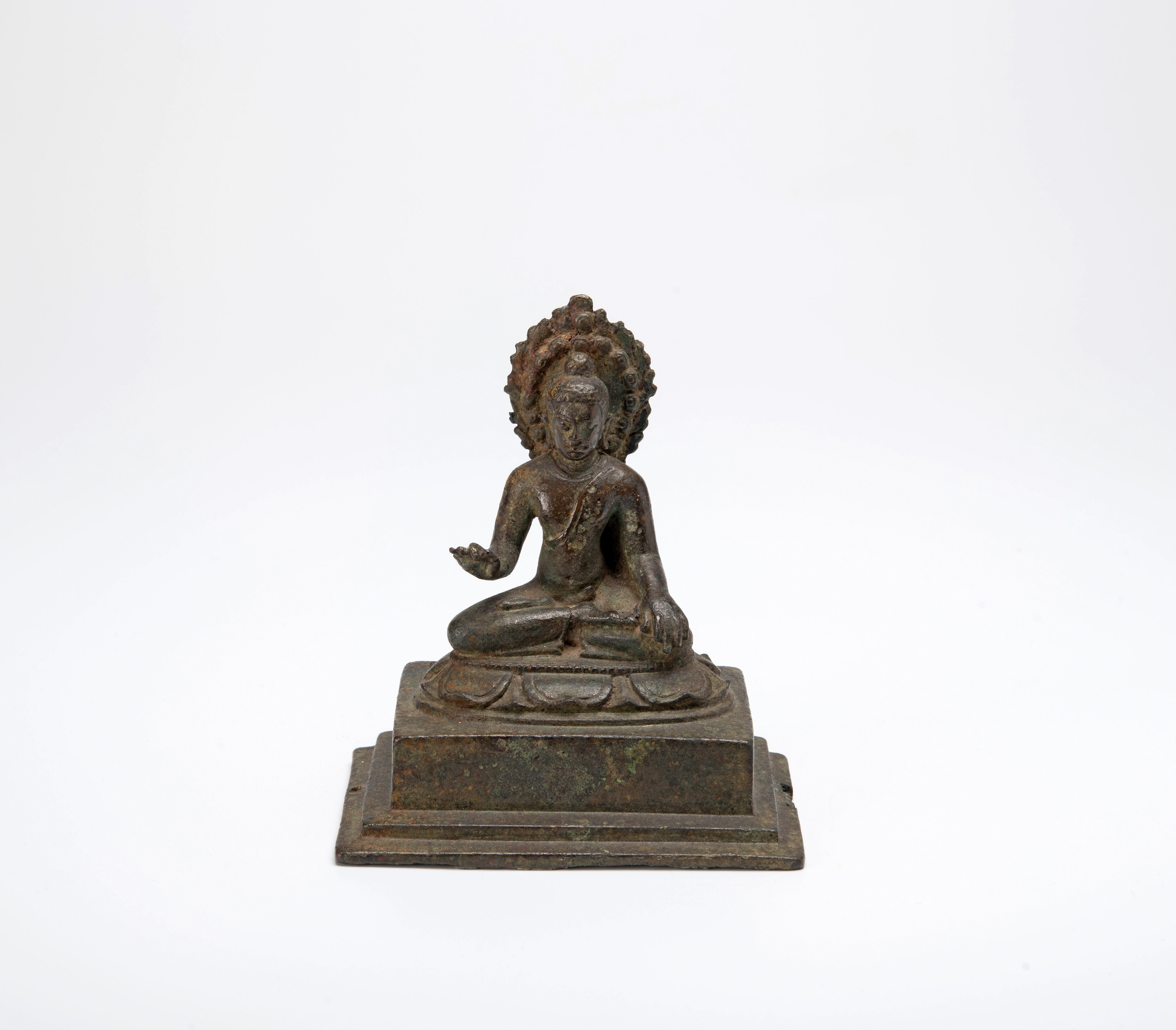 De Boeddha zit met gekruiste benen. Zijn hand is in de houding van onderwijzen, vitarka-mudra.