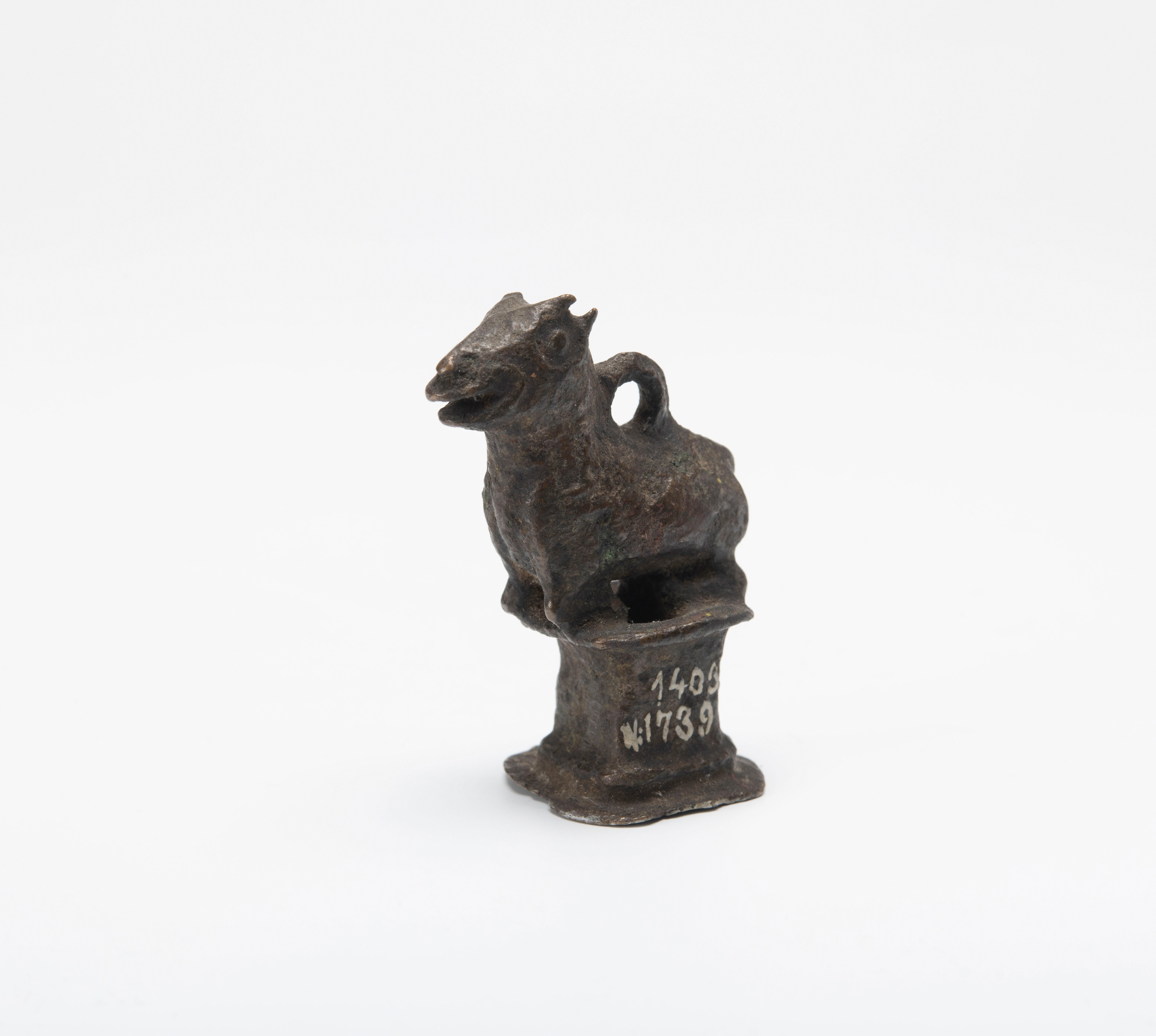 Op de rug van de stier is een ring, waardoor een ketting kon worden gehaald om het object op te hangen. Waarschijnlijk was dit het topstuk van een bel.