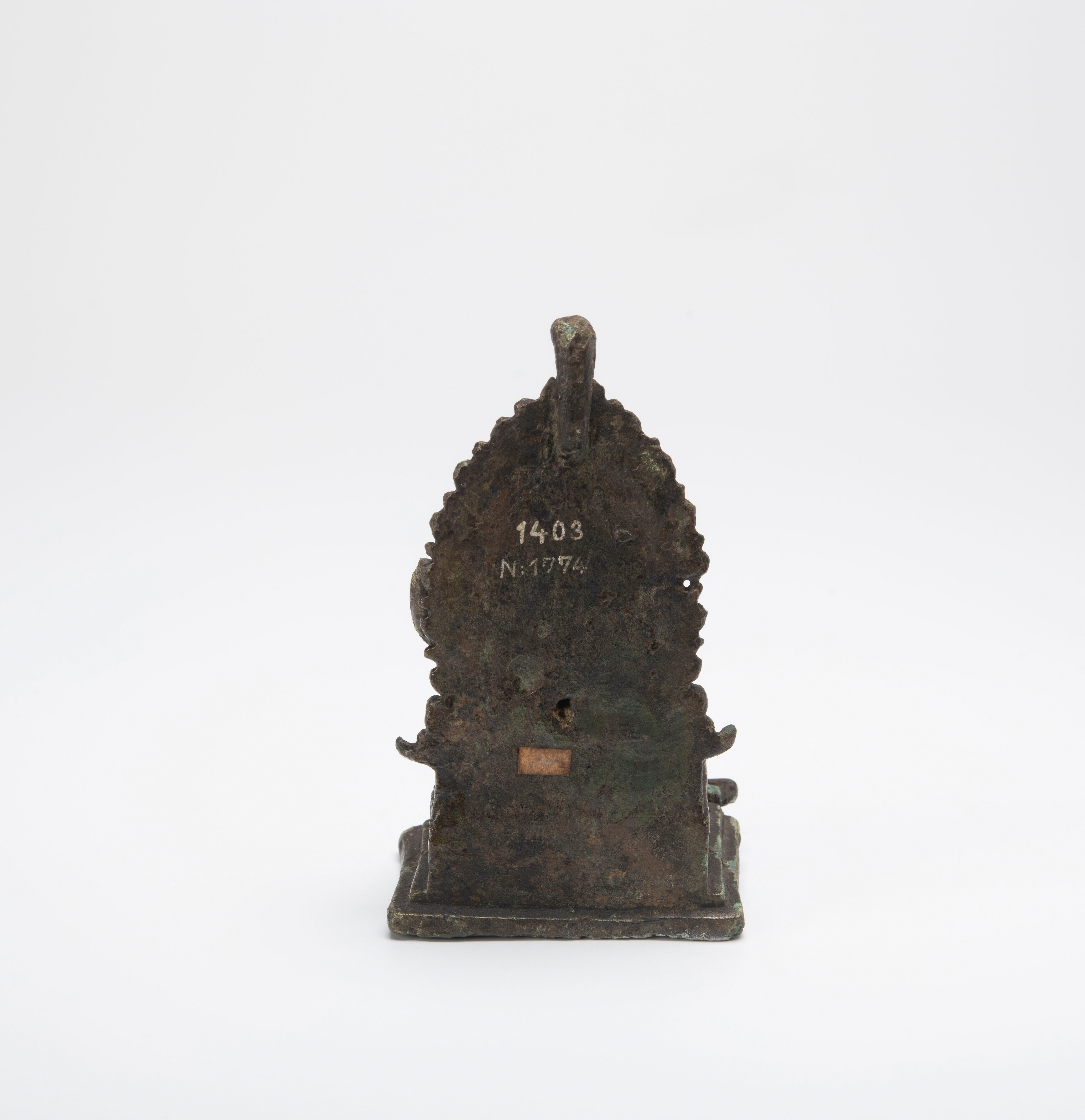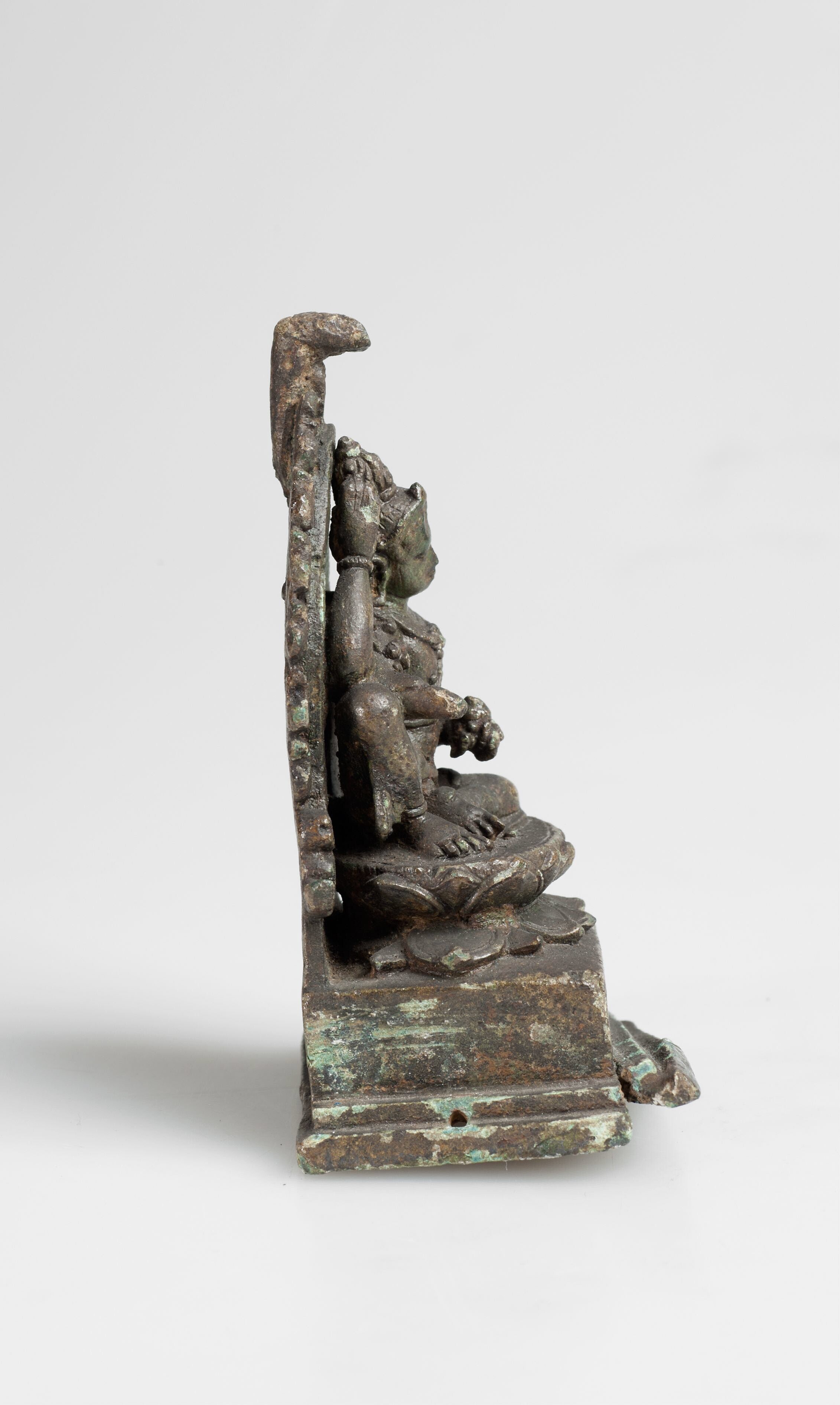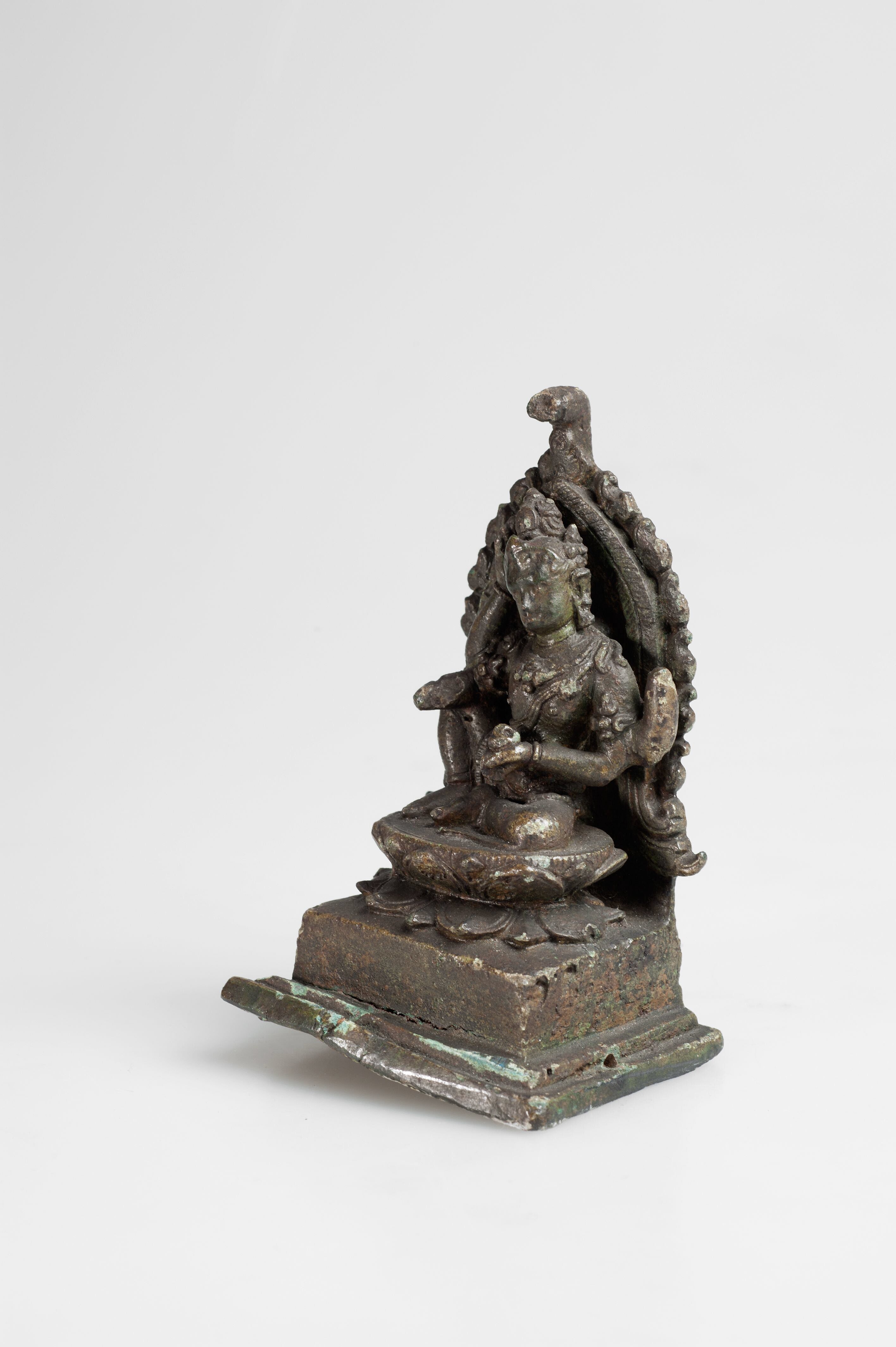 Deze vorm van Avalokiteshvara is niet zo gebruikelijk in India. De Javaanse beeldjes hebben meestal vier armen. Het hoofd van de Bodhisattva steunt op de bovenste rechterhand. Het achterstuk is voorzien van een band met een visgraatpatroon en een rand met simpele blaadjes. Het dateert daarom waarschijnlijk van de negende eeuw.