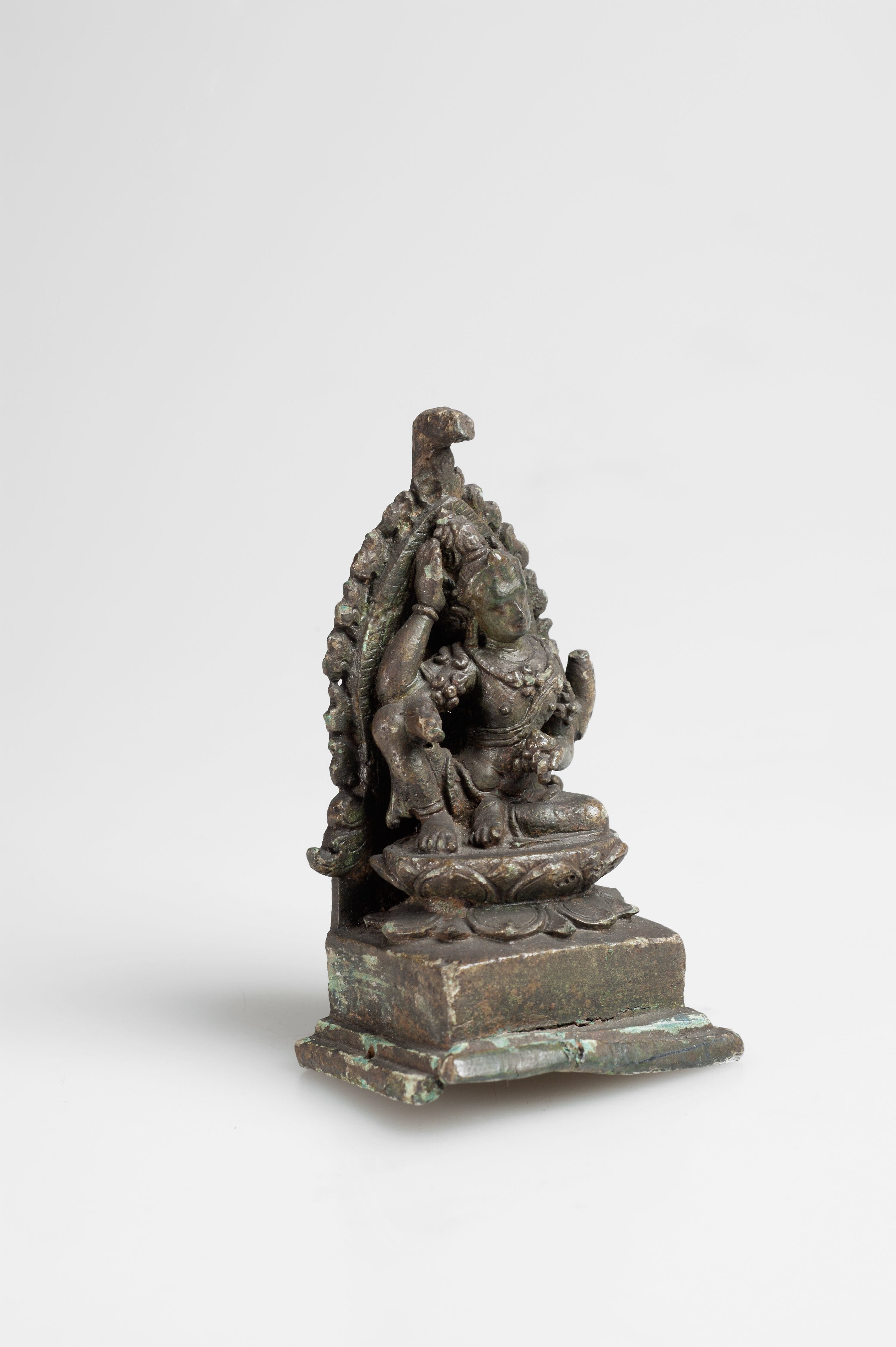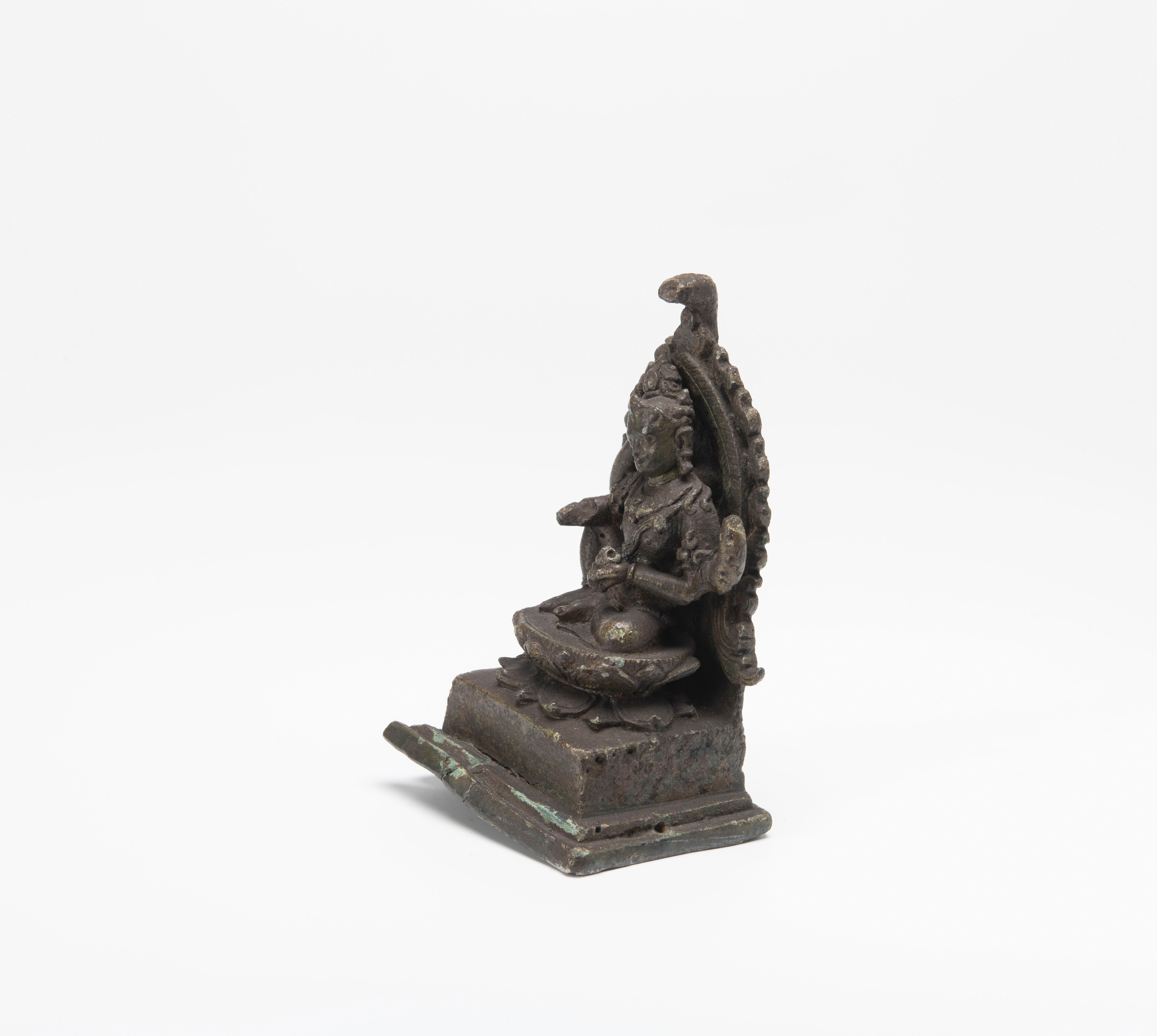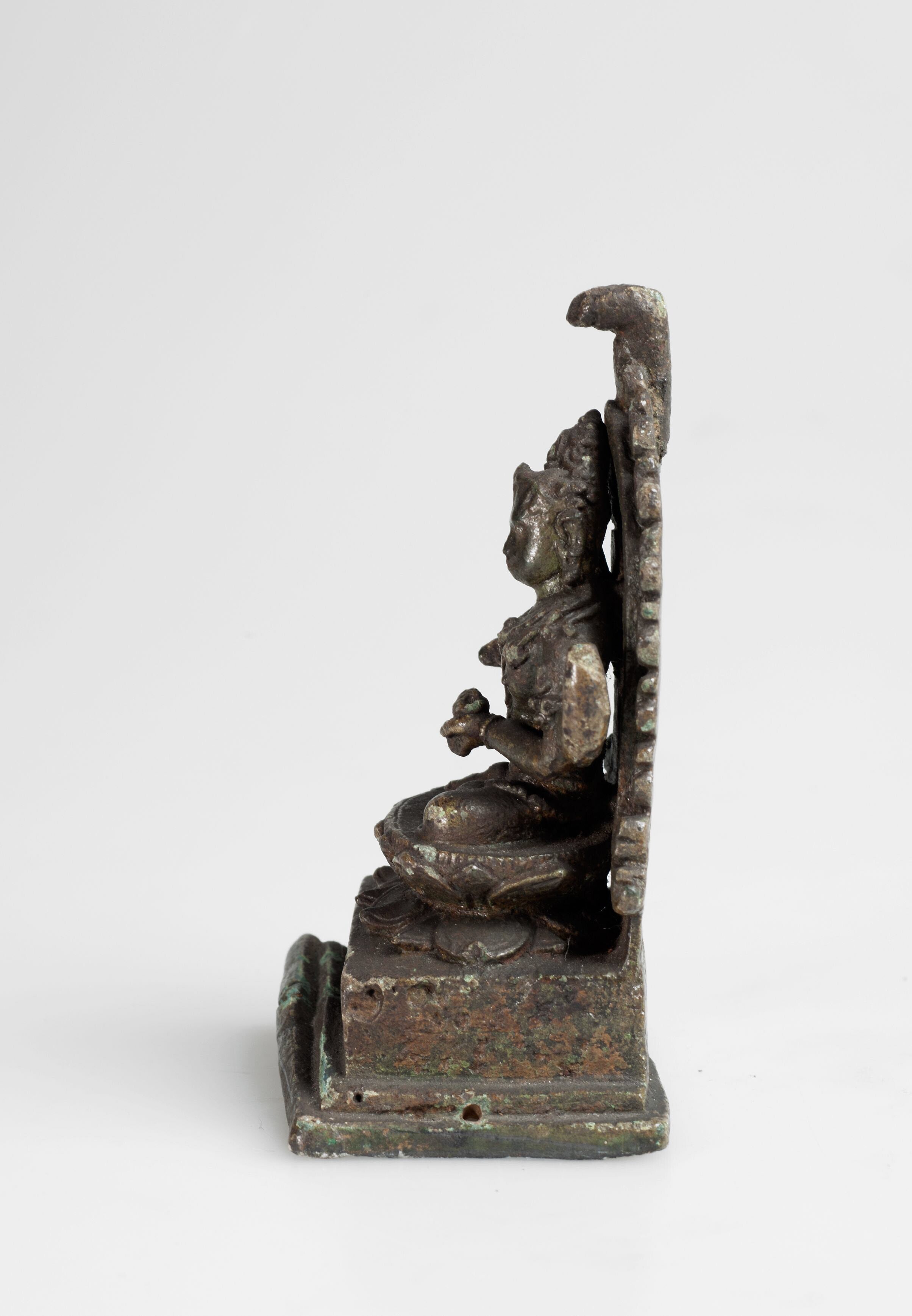 Deze vorm van Avalokiteshvara is niet zo gebruikelijk in India. De Javaanse beeldjes hebben meestal vier armen. Het hoofd van de Bodhisattva steunt op de bovenste rechterhand. Het achterstuk is voorzien van een band met een visgraatpatroon en een rand met simpele blaadjes. Het dateert daarom waarschijnlijk van de negende eeuw.
