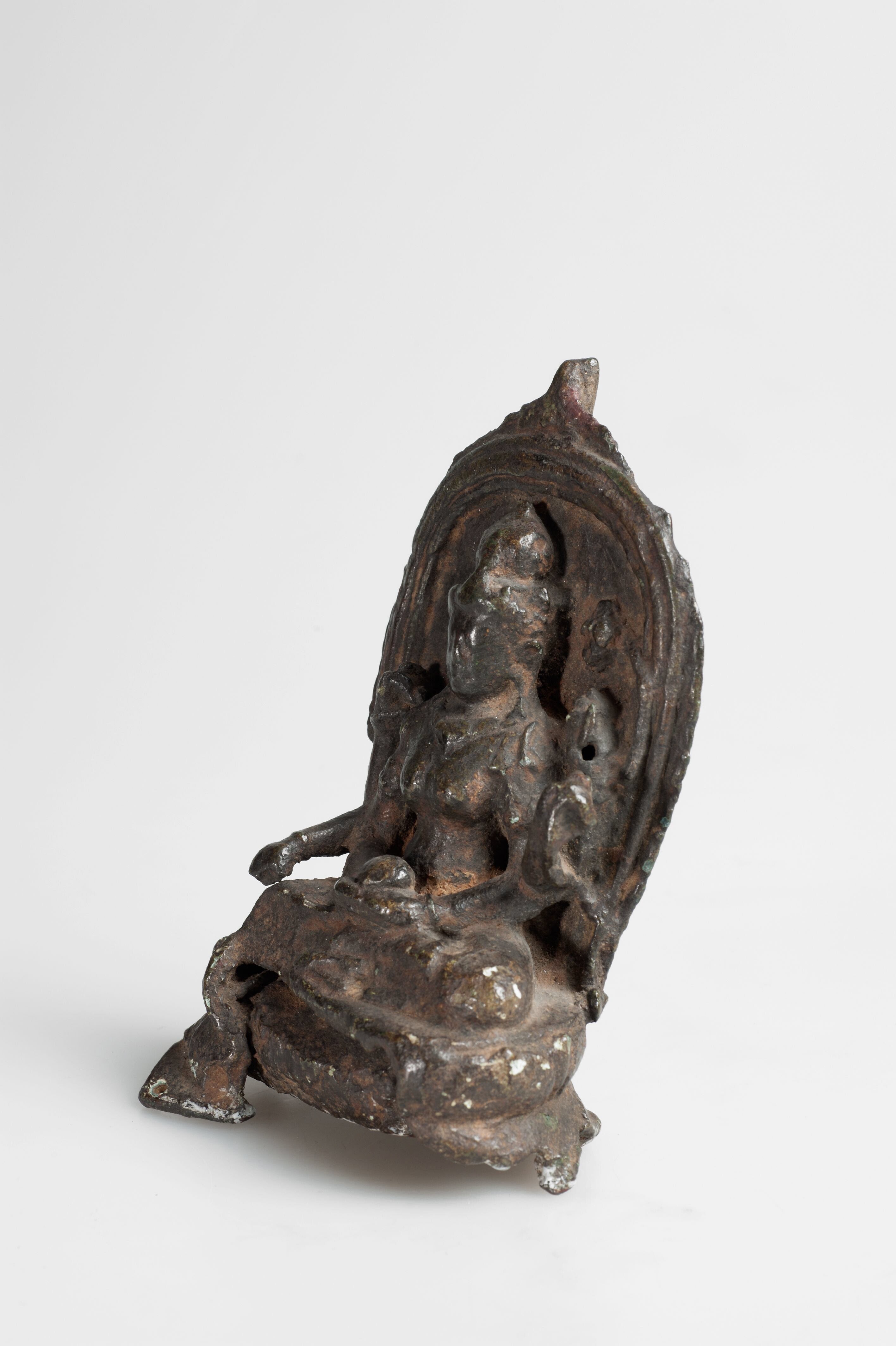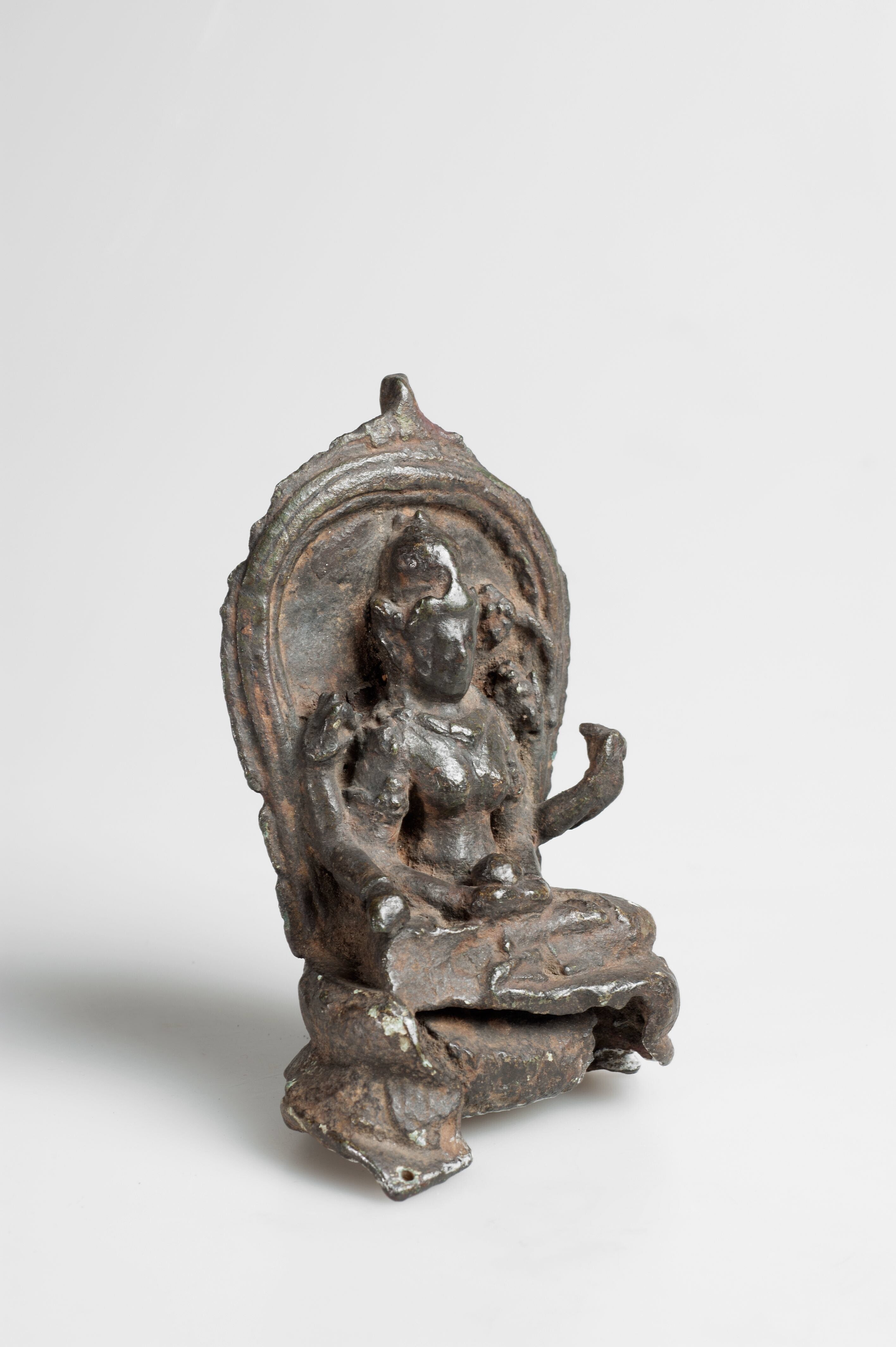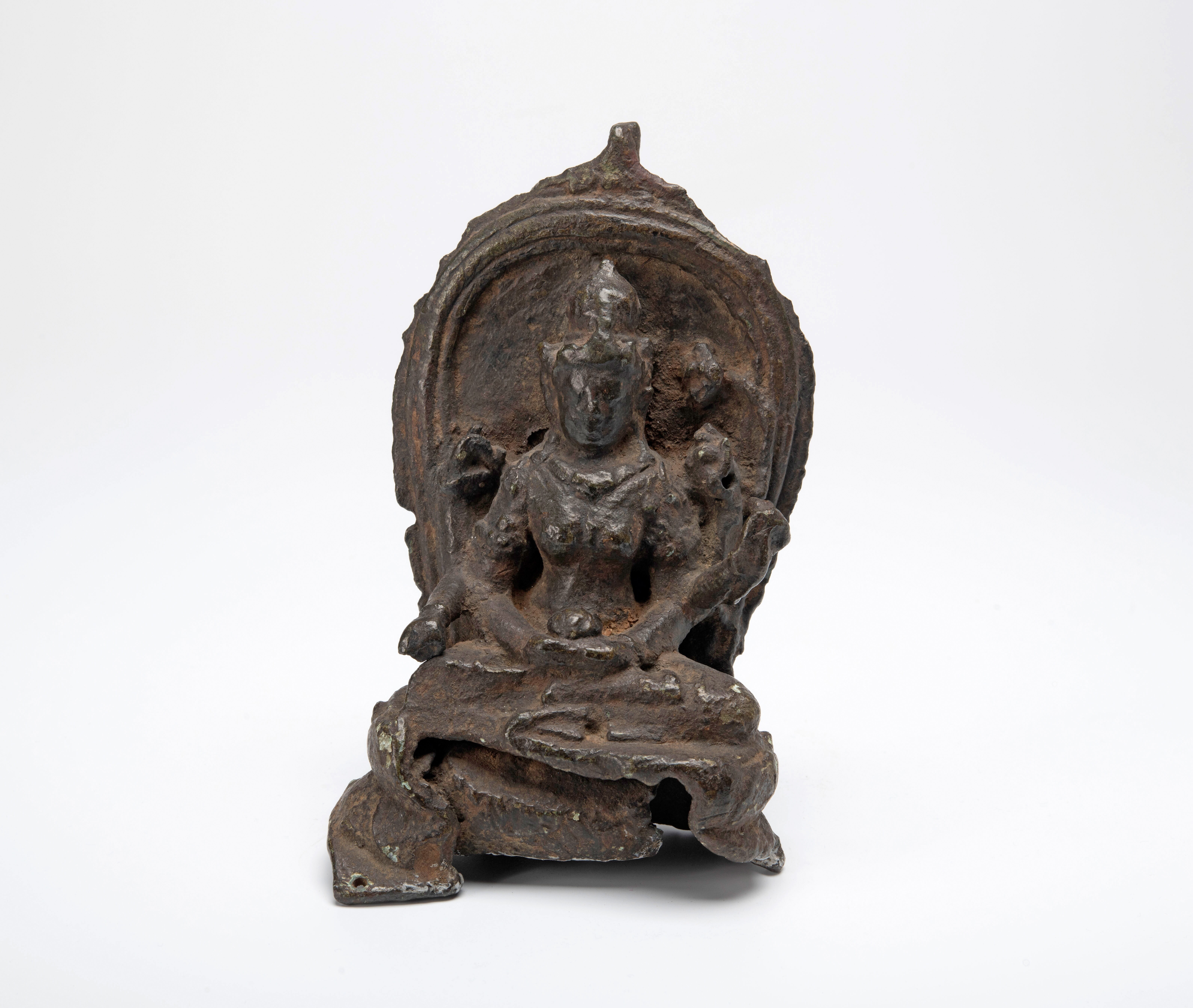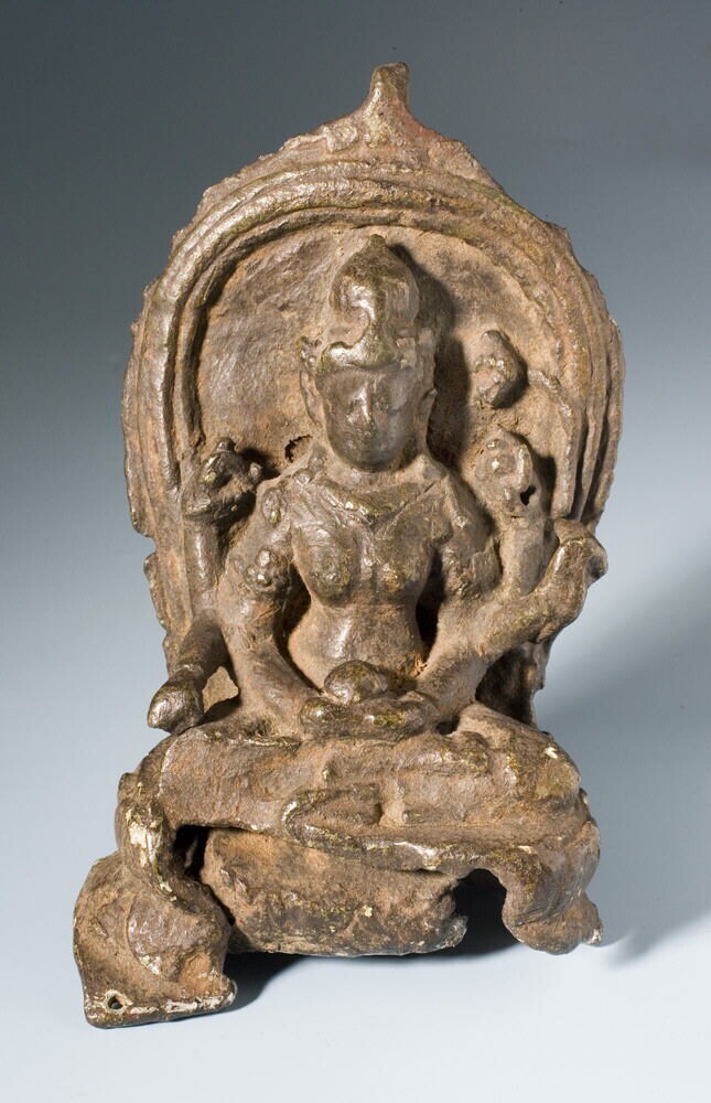 Het is moeilijk te zien welke attributen deze zesarmige godin in haar handen droeg. Een van haar linkerhanden draagt een lotusbloem. Dat is een attribuut van de godin Lakshmi.