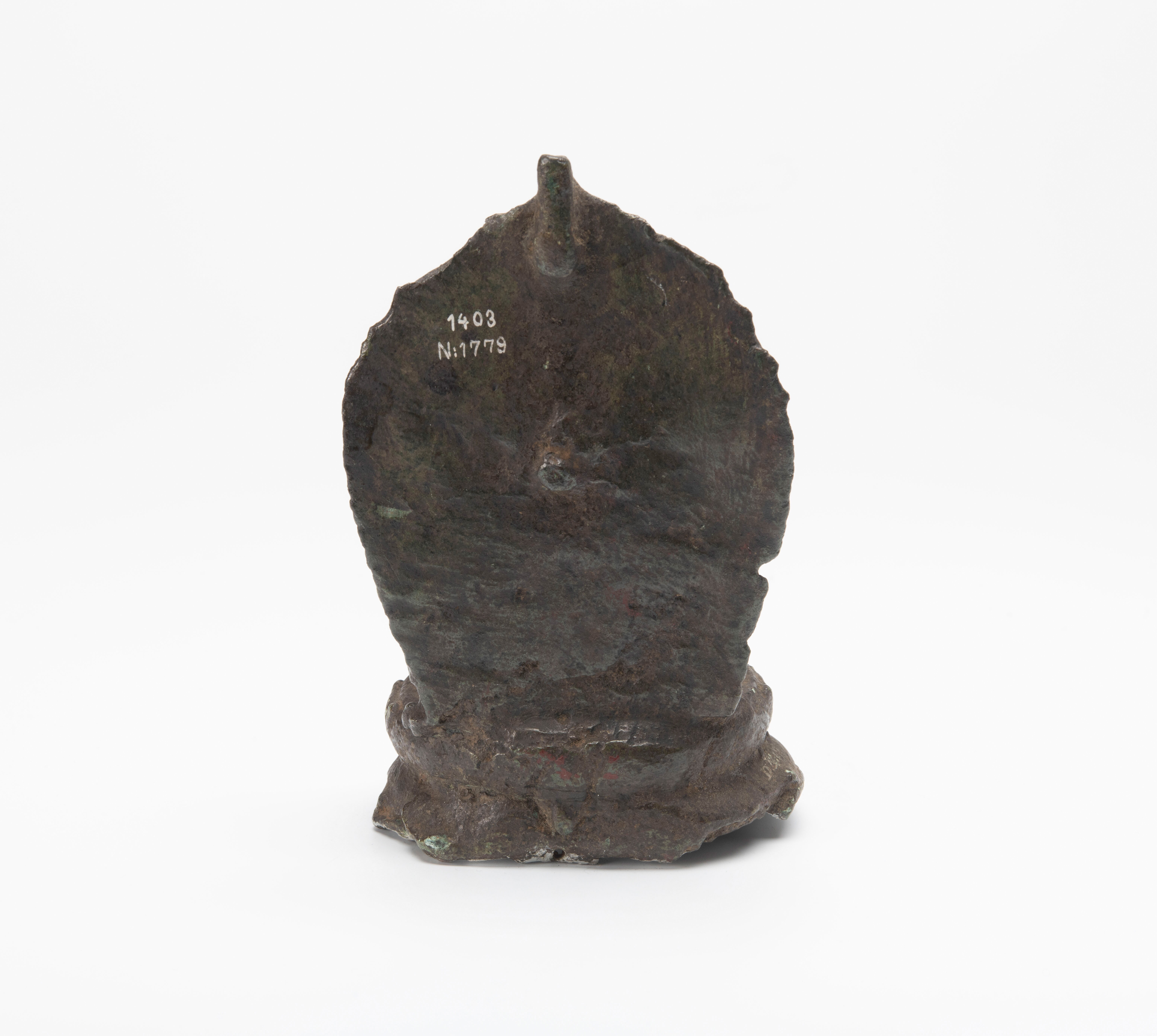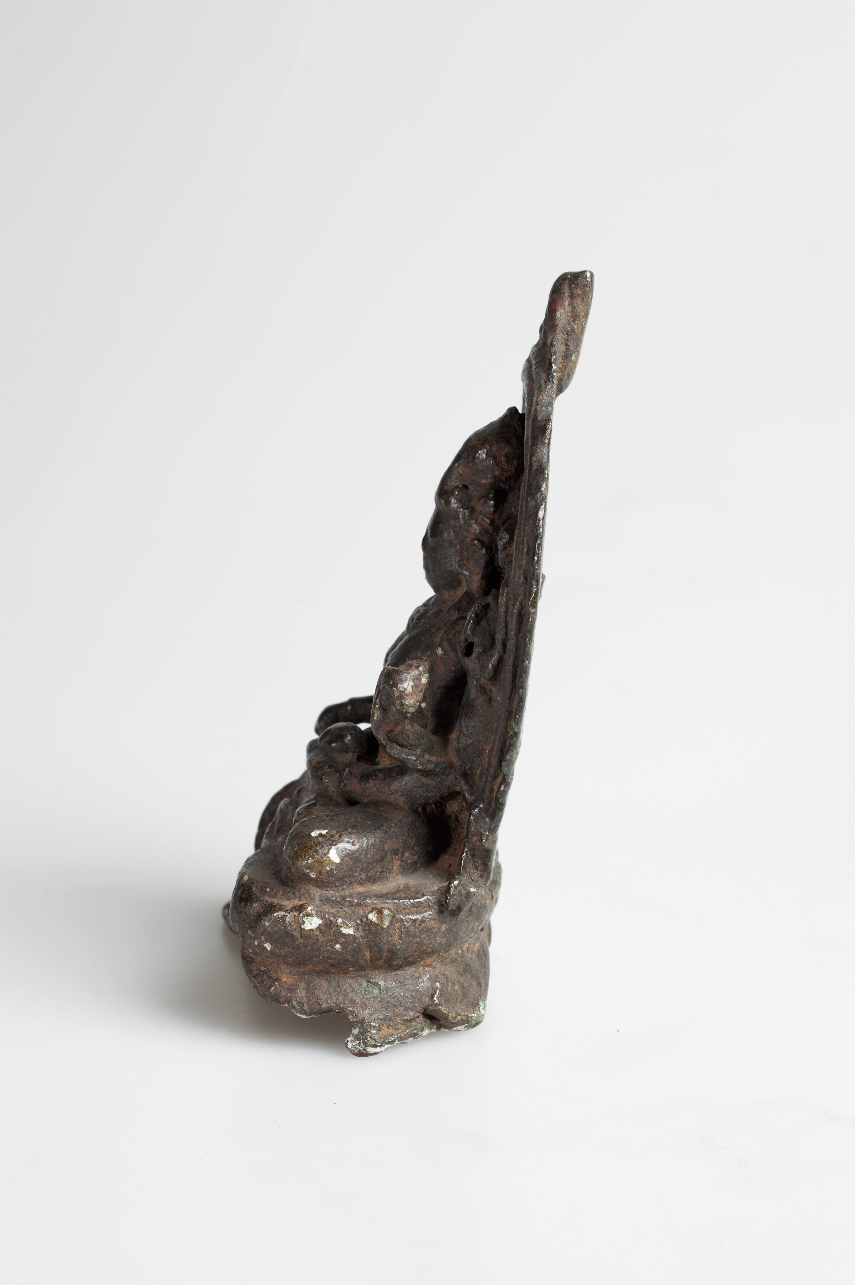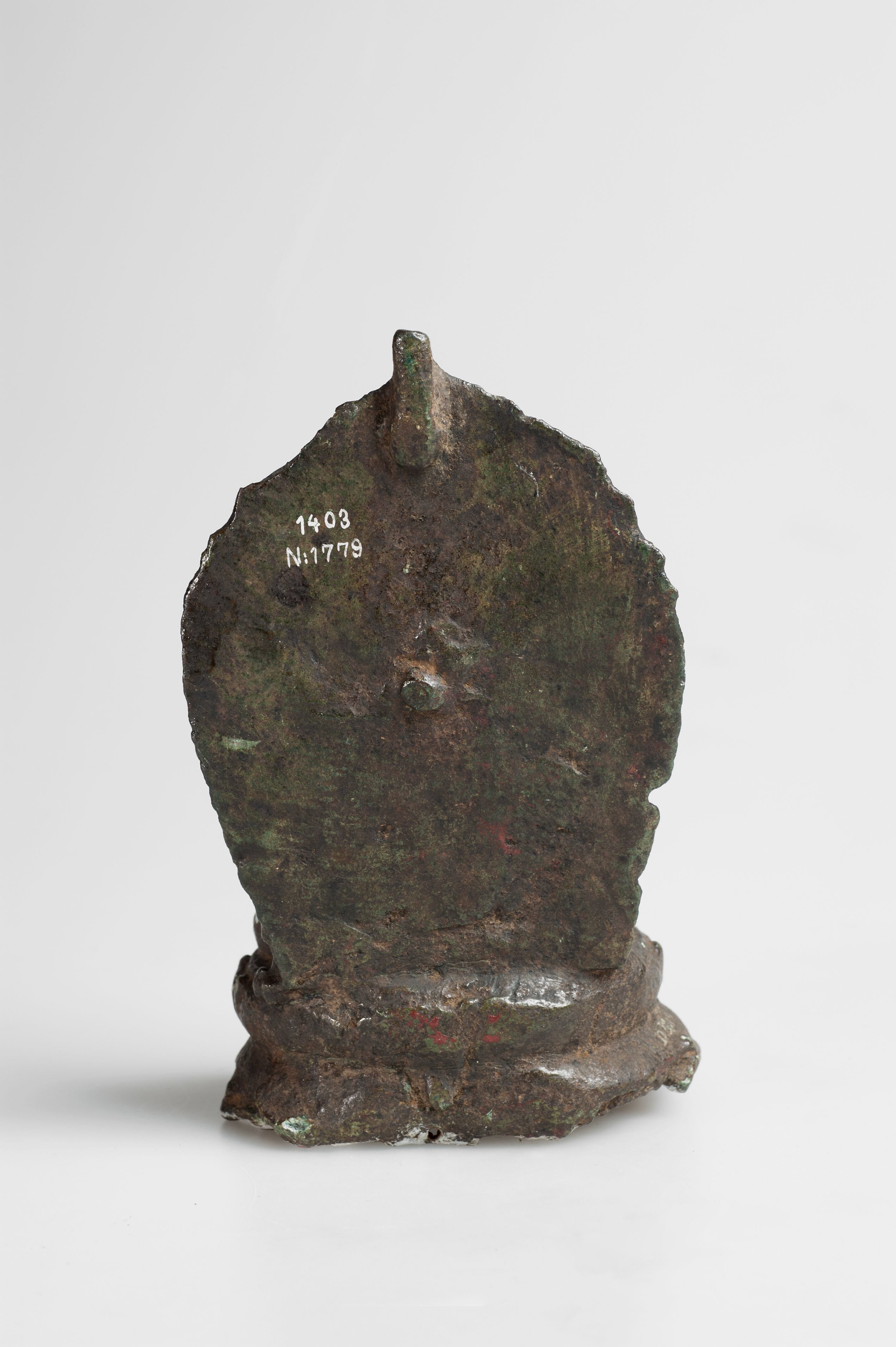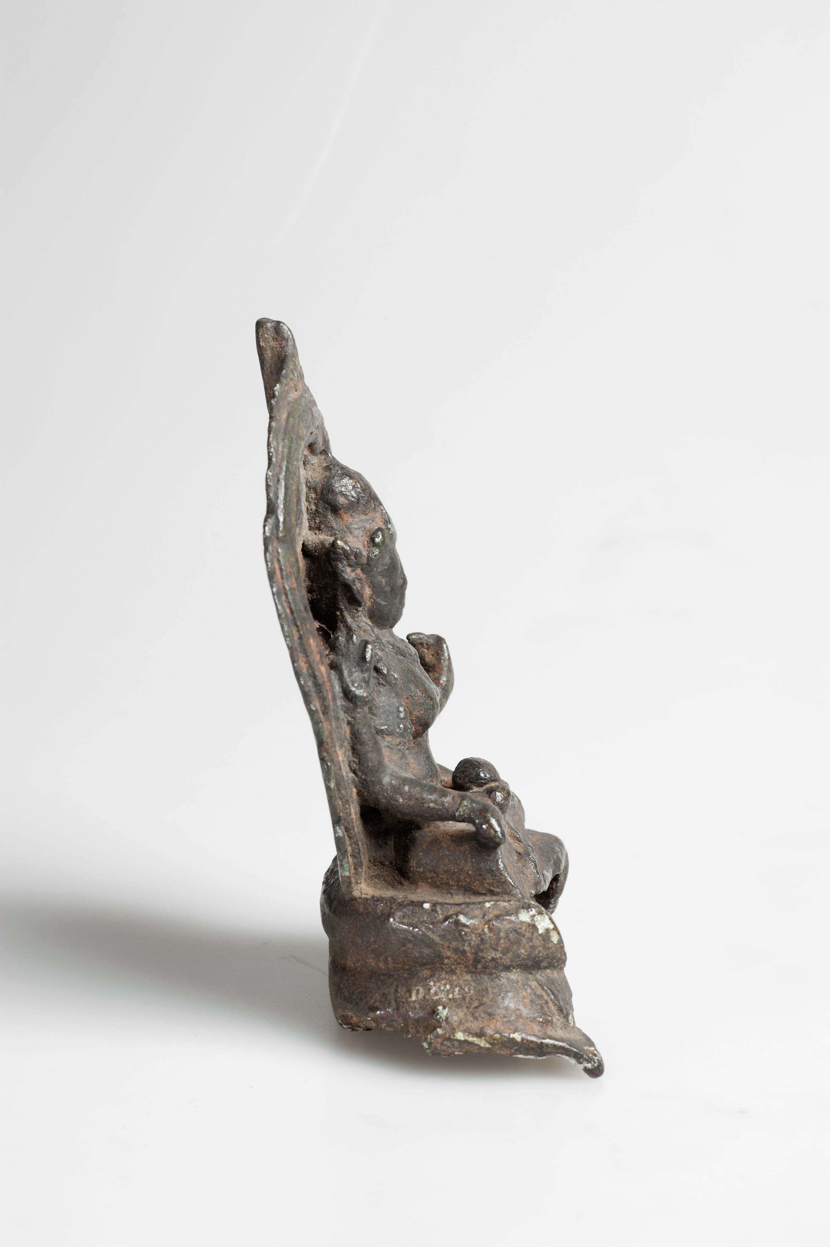Het is moeilijk te zien welke attributen deze zesarmige godin in haar handen droeg. Een van haar linkerhanden draagt een lotusbloem. Dat is een attribuut van de godin Lakshmi.