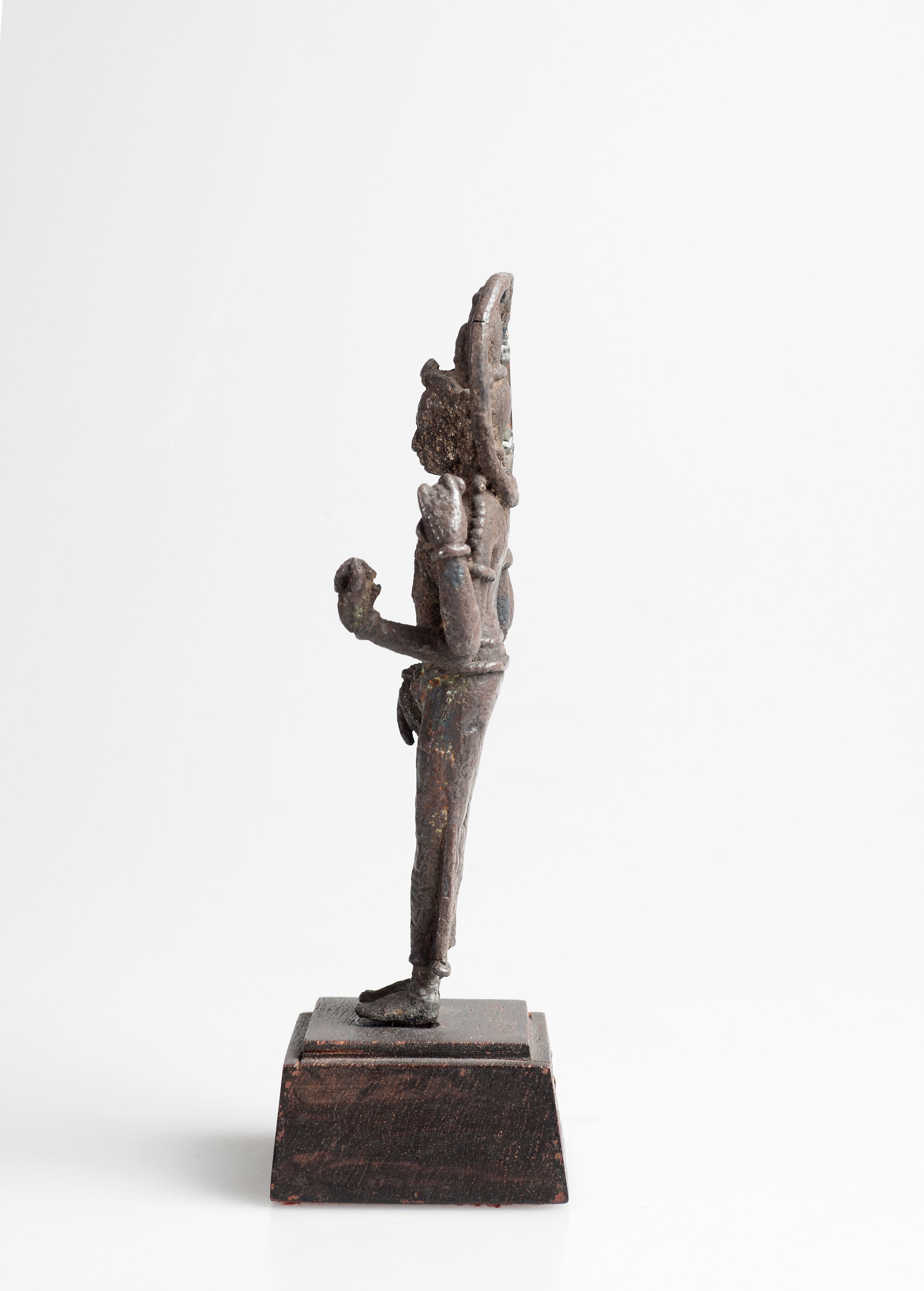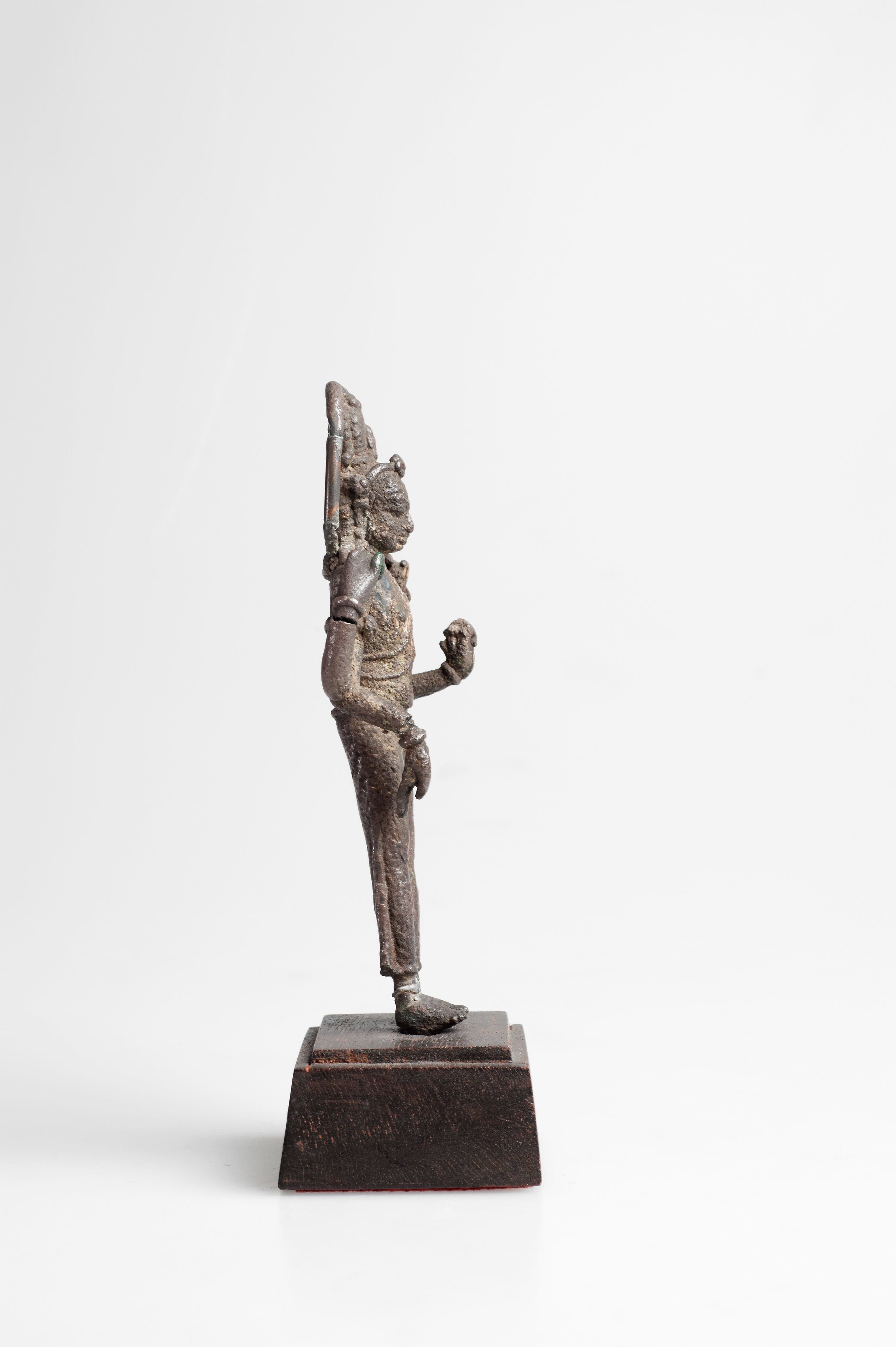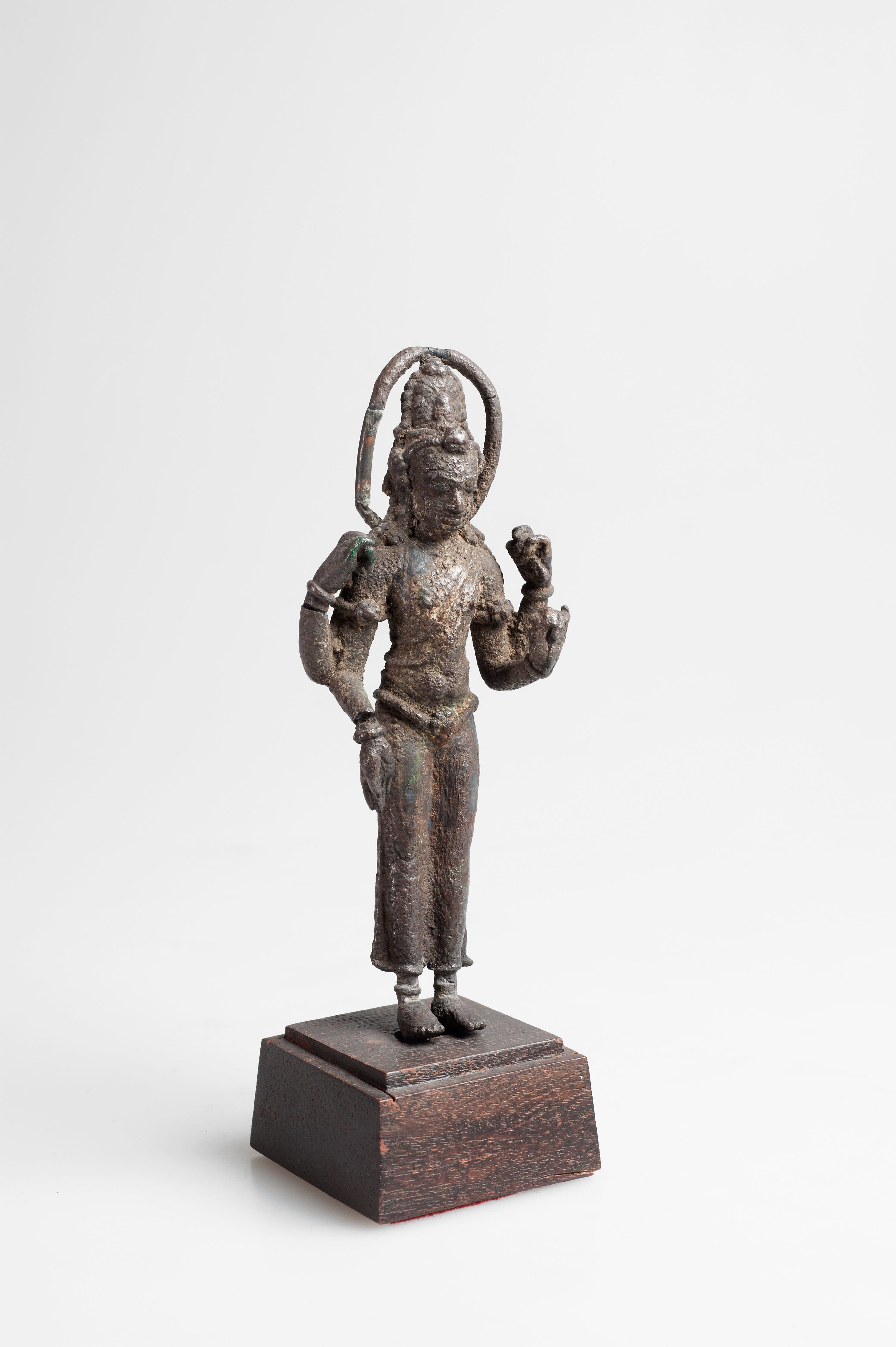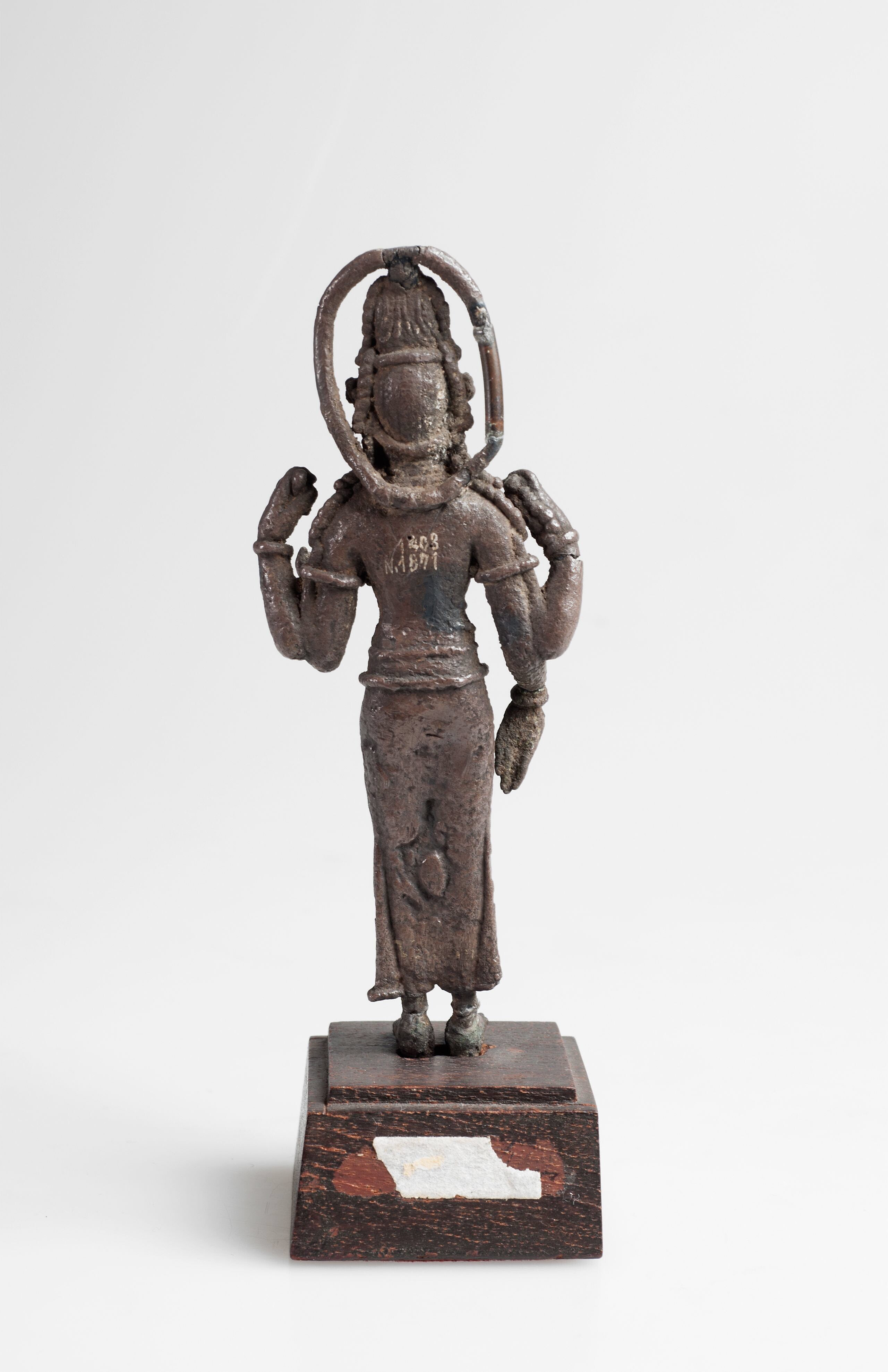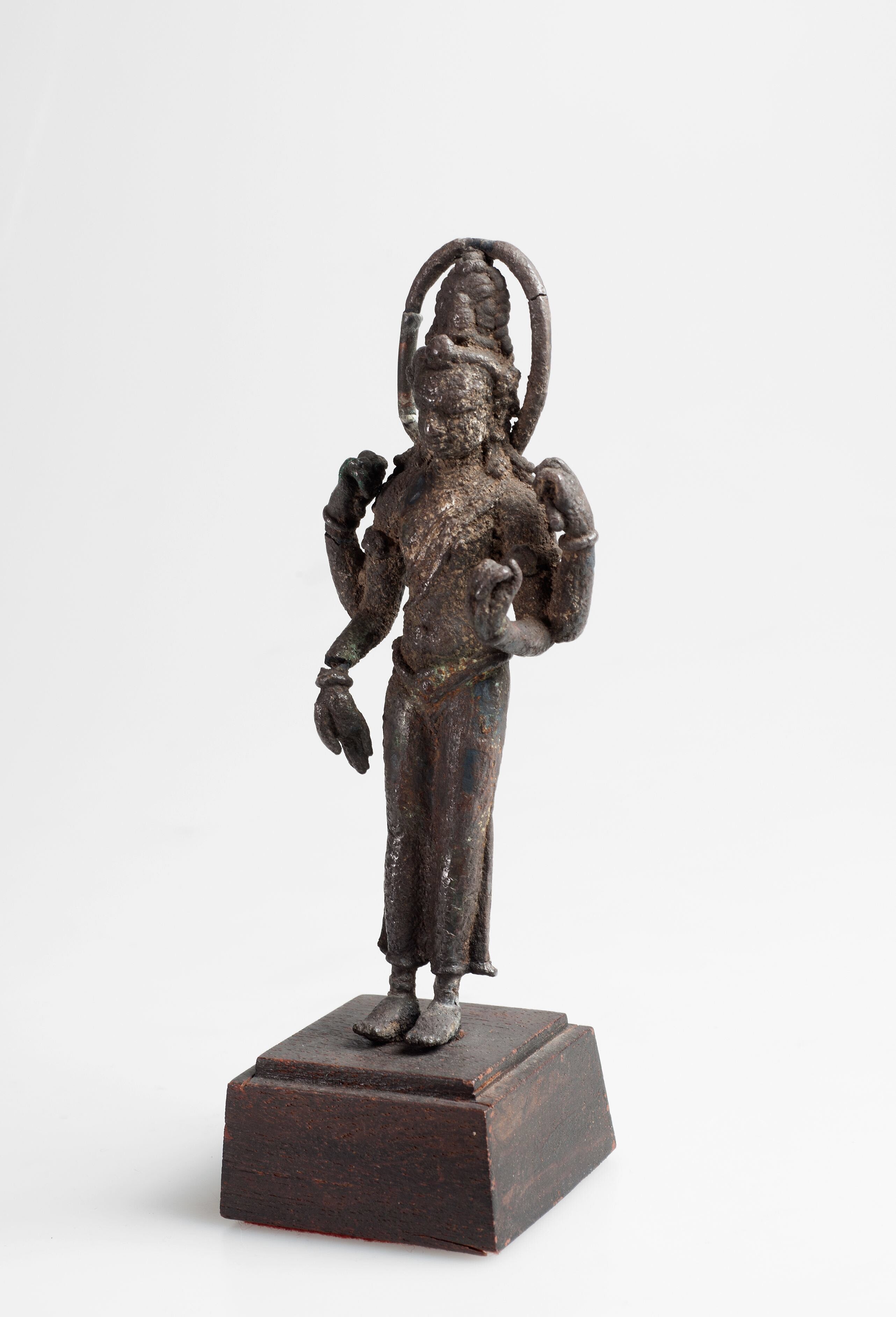 Deze staande Avalokiteshvara heeft vier armen. In zijn bovenste linkerhand ligt een boek. Tegen zijn haartooi is een kleine Boeddha Amitabha te zien.