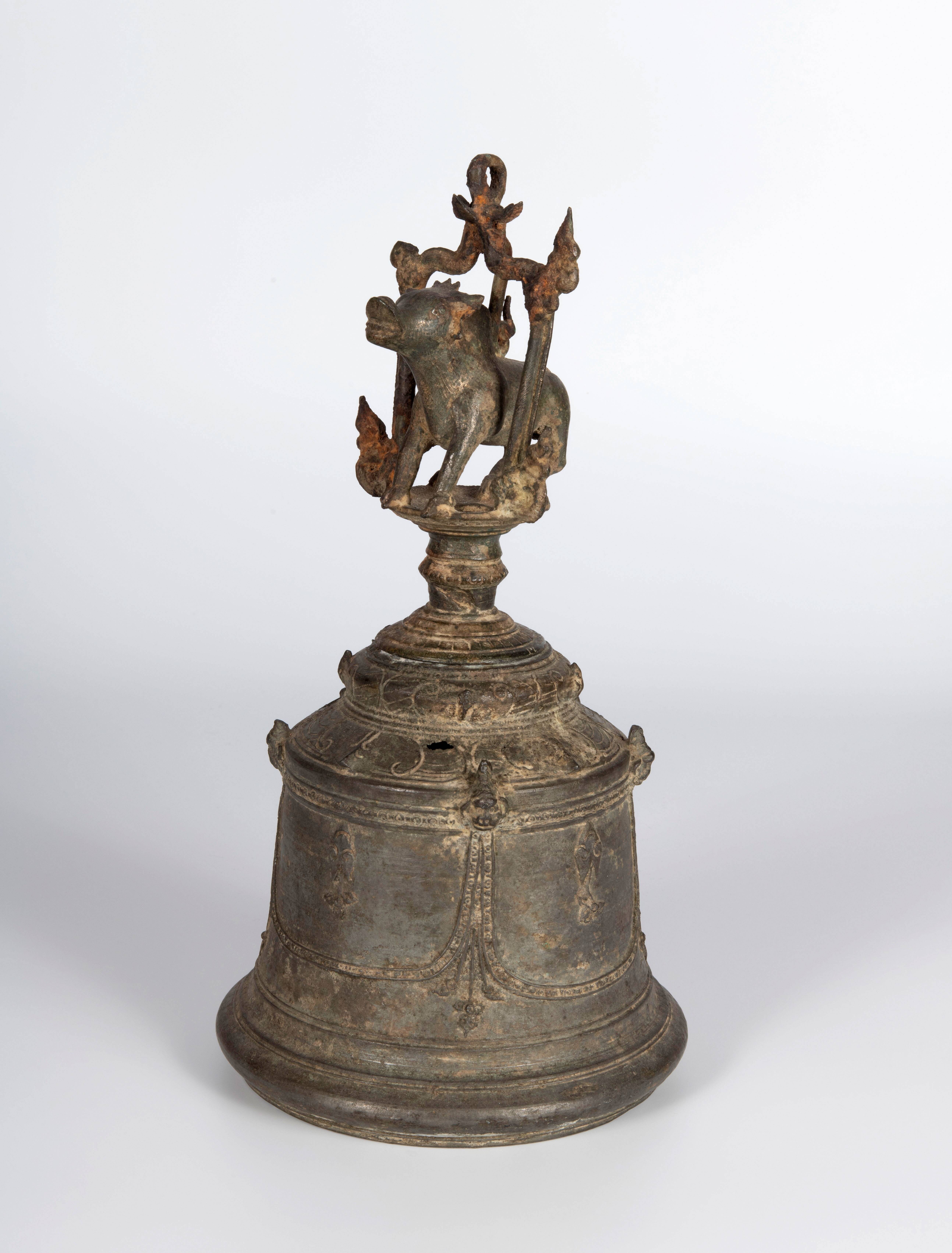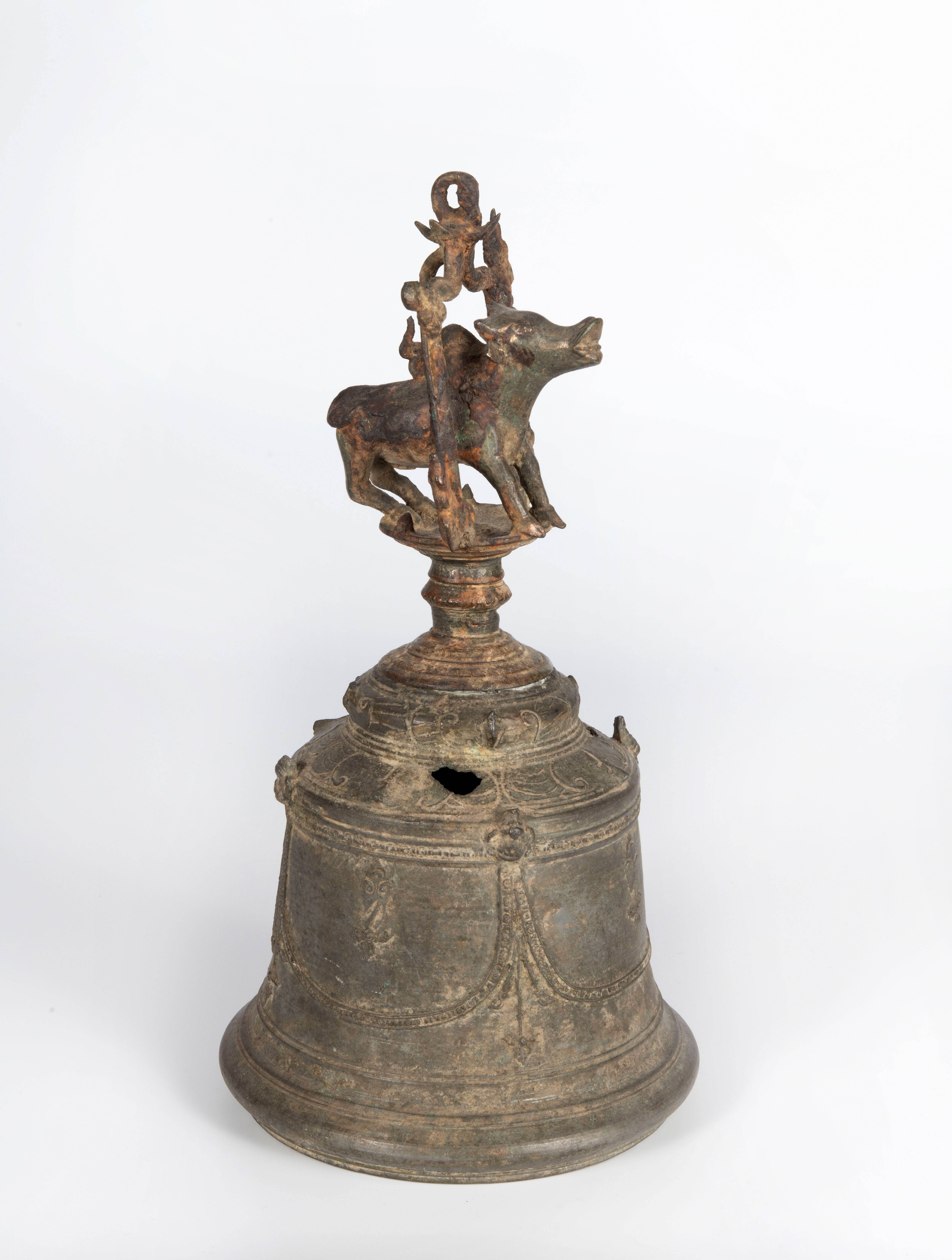 De buik van de bel heeft een guirlandemotief. Op de top is een stier. Dat zou erop kunnen duiden dat de bel oorspronkelijk in een hindoe tempel hing die gewijd was aan de god Shiva.