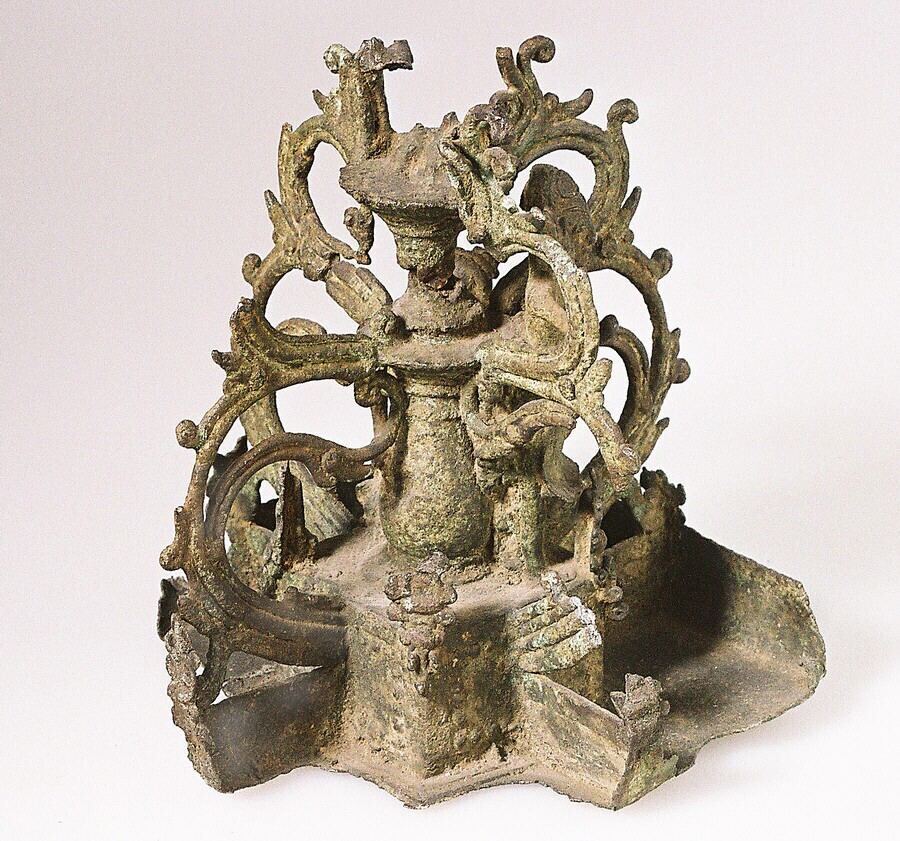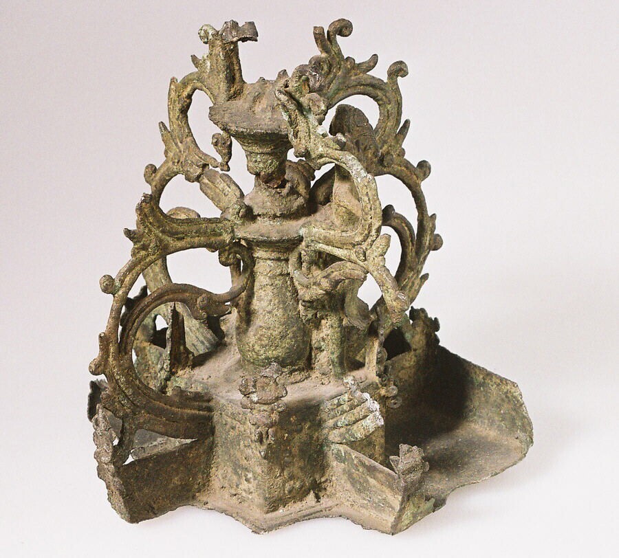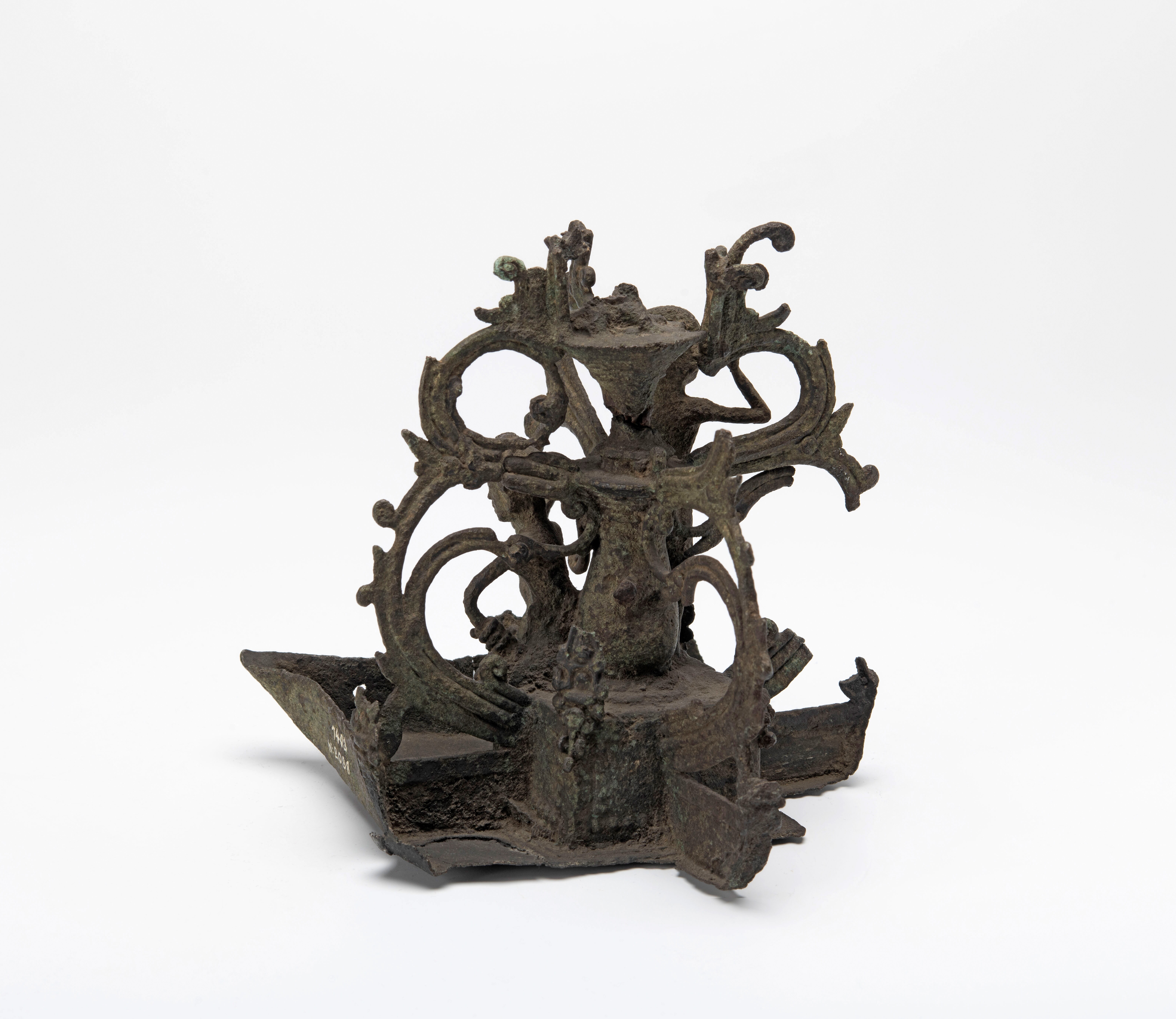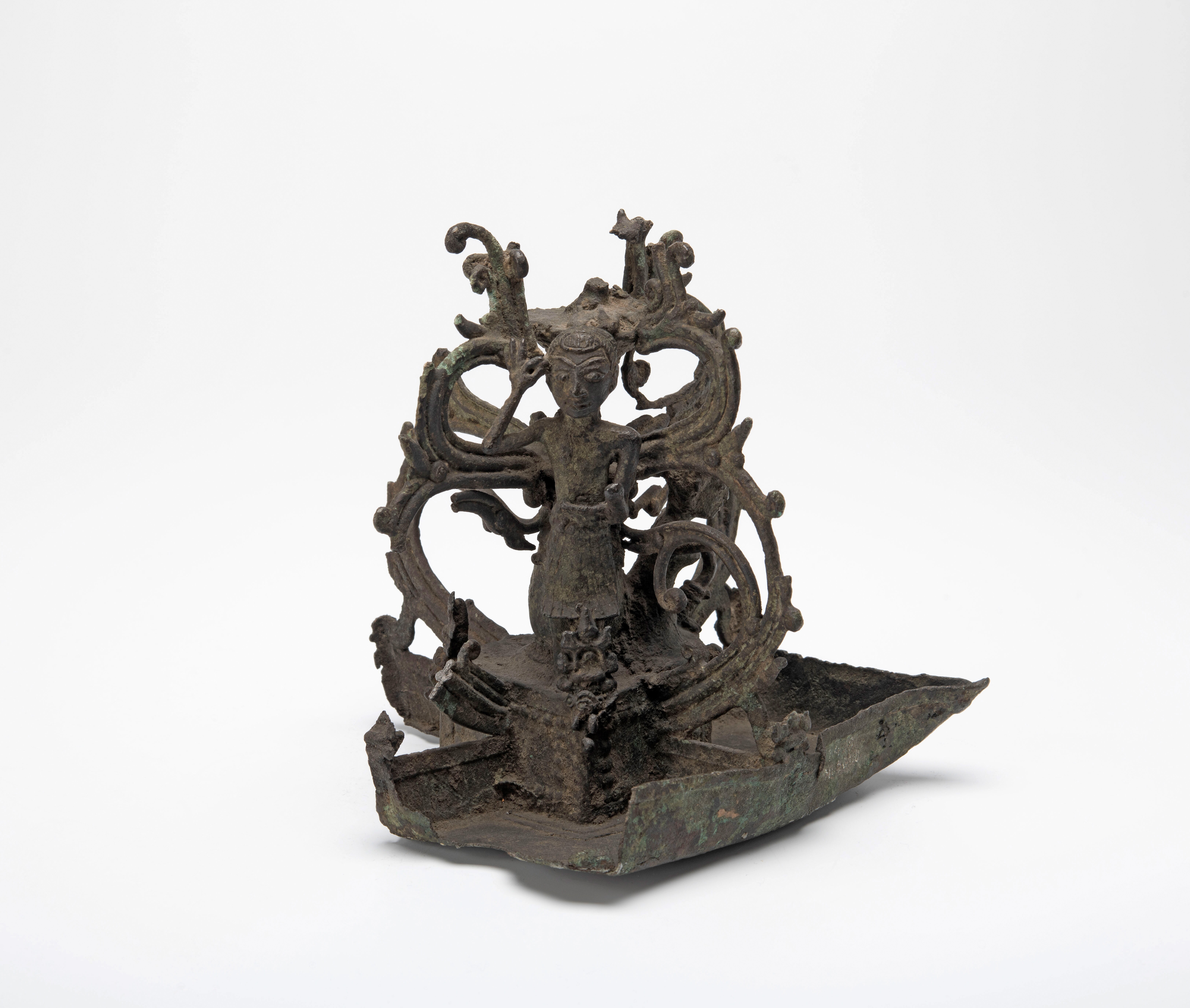 Deze olielamp had oorspronkelijk vier reservoirs. In het midden zijn krullerige bogen. Ertussen is een staande vrouwenfiguur afgebeeld.