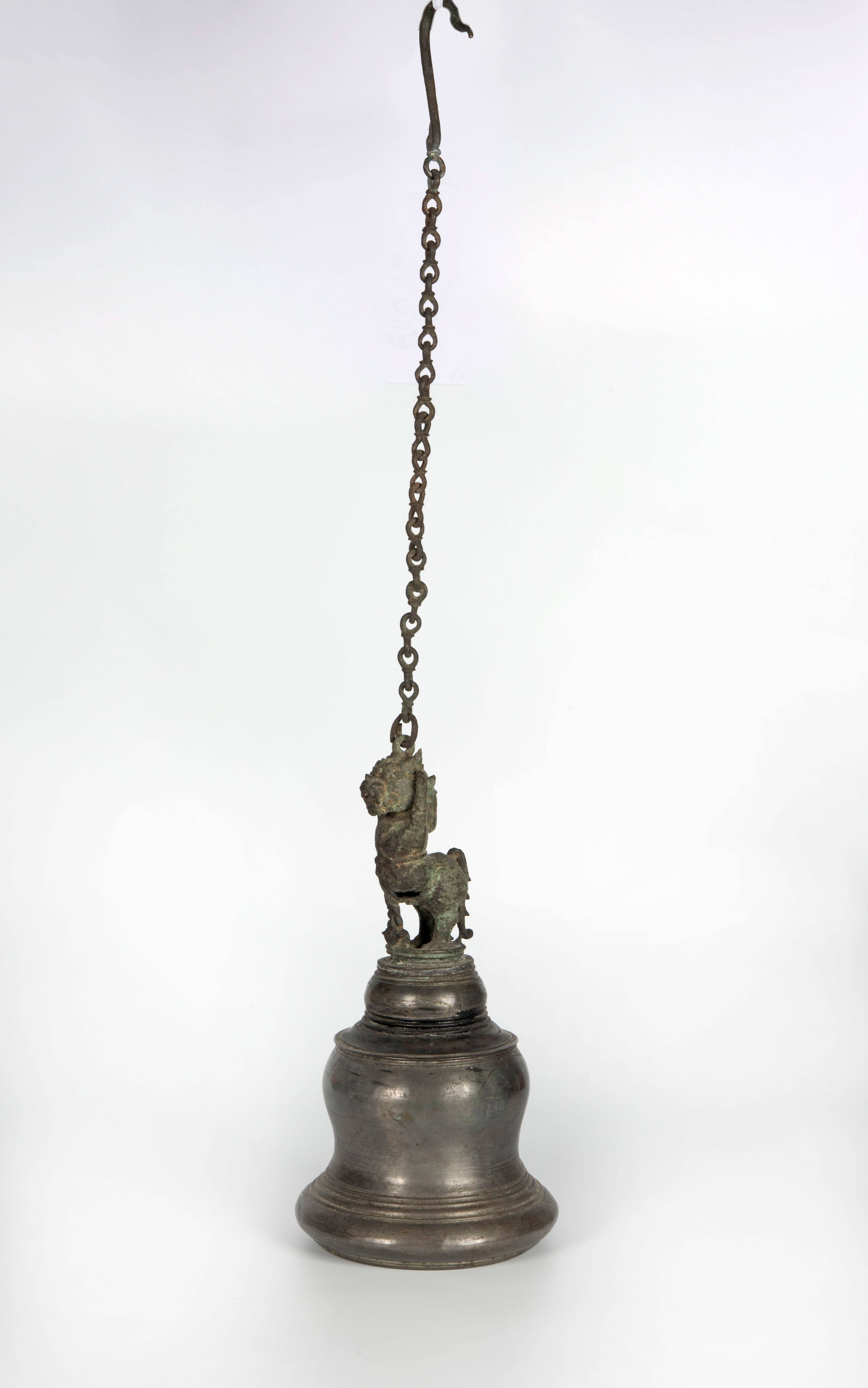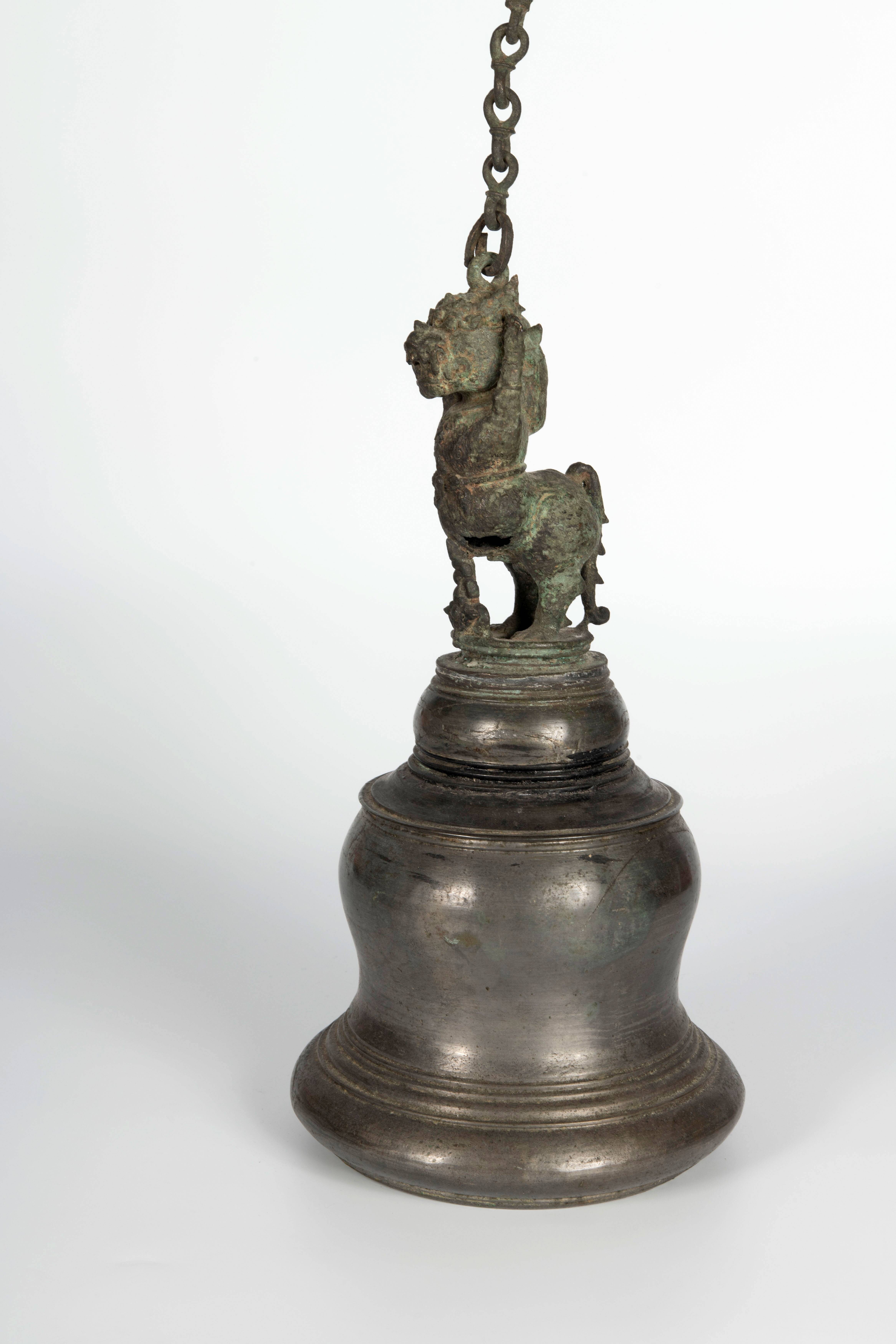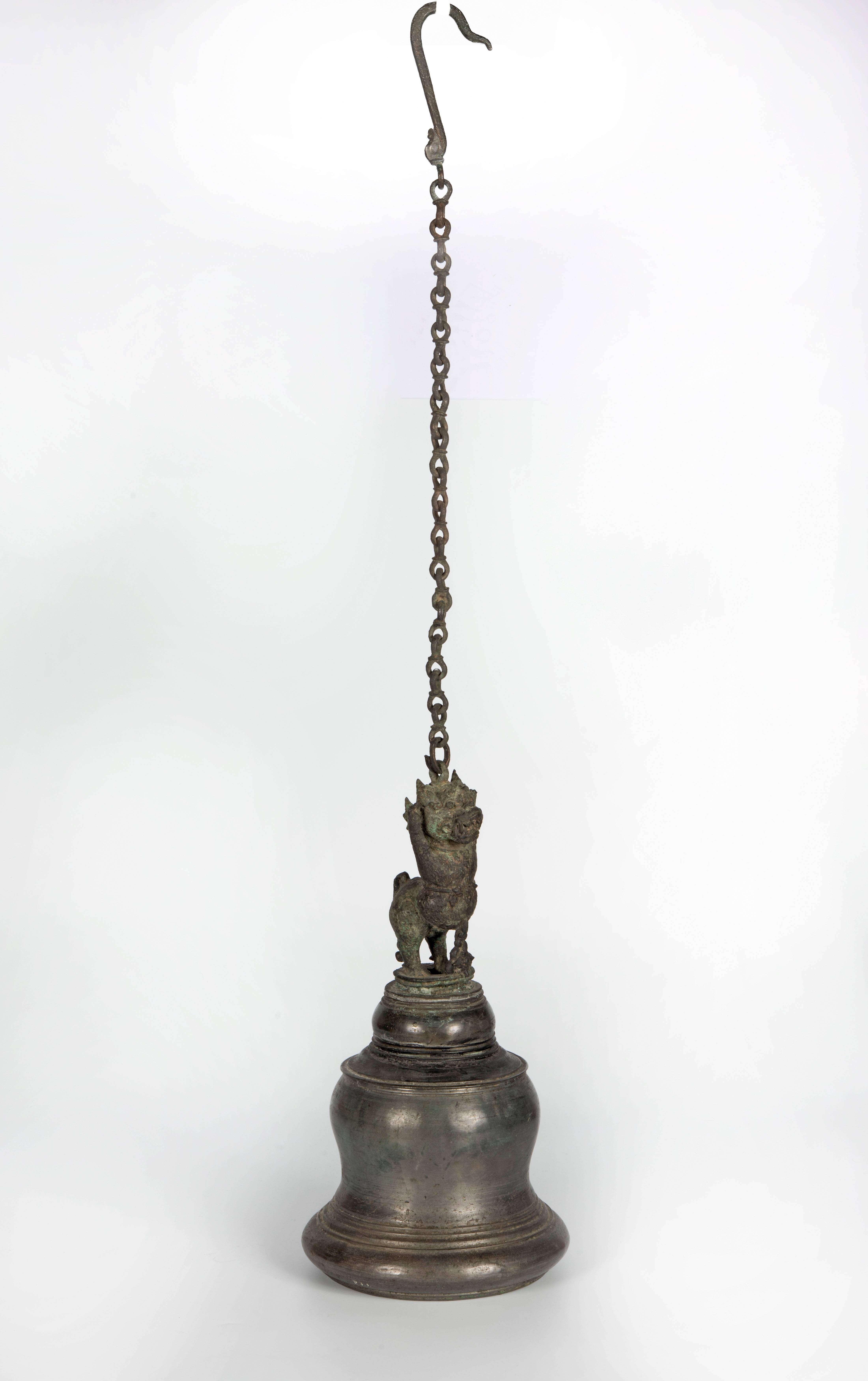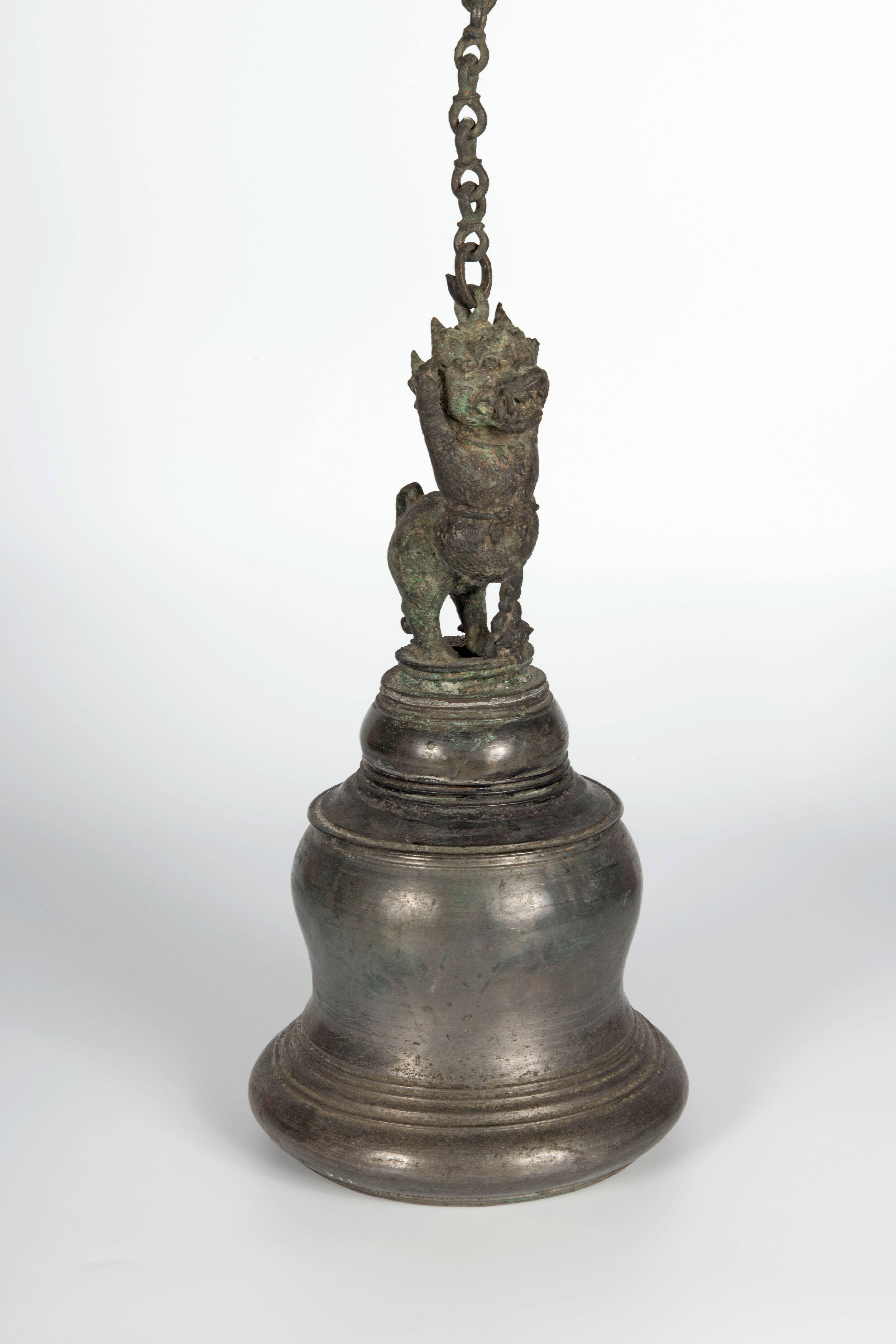 Op de bel is een leeuw met een ring waar de ketting aan hangt. De leeuw zou er op kunnen duiden dat deze bel oorspronkelijk in een boeddhistische tempel hing.
