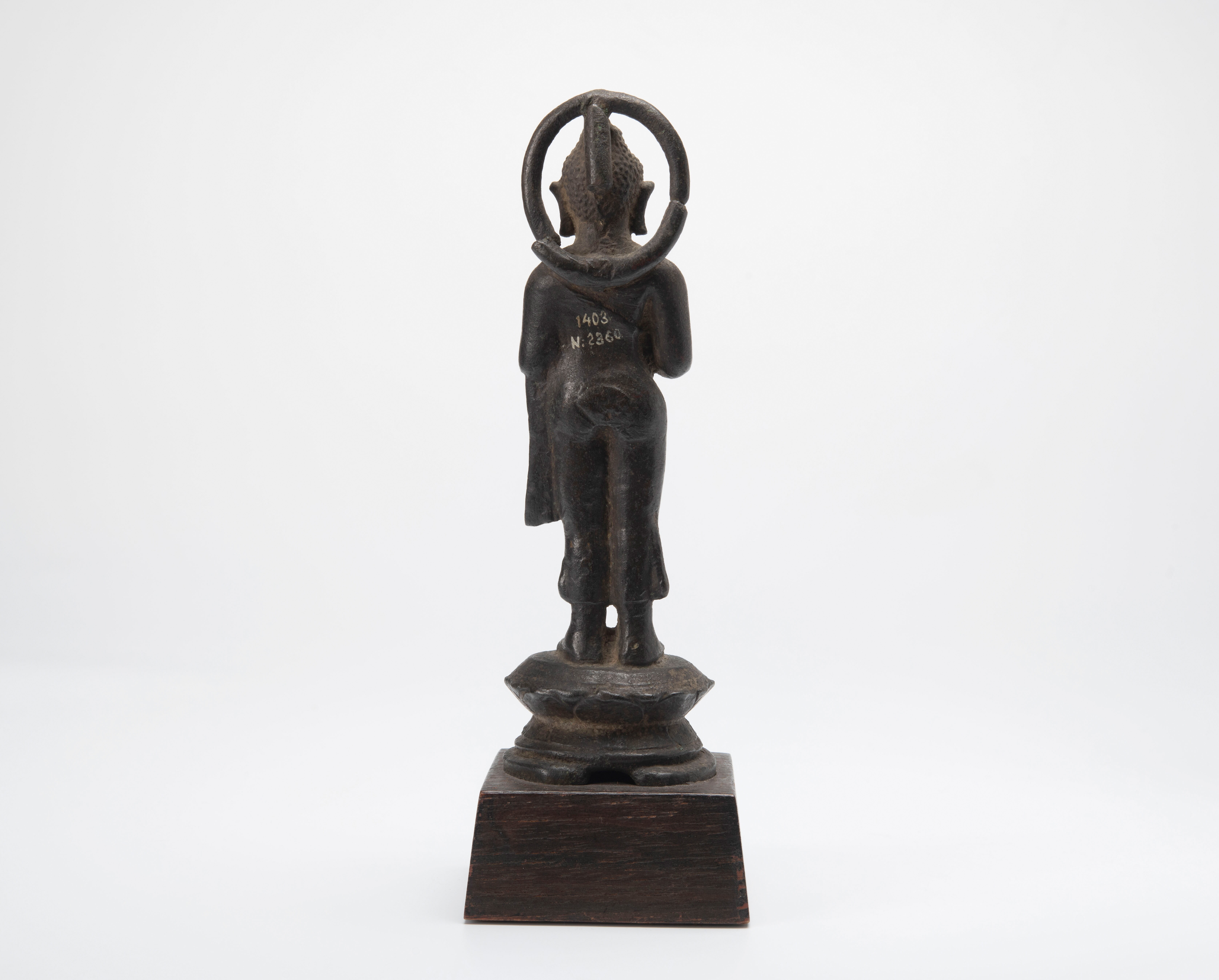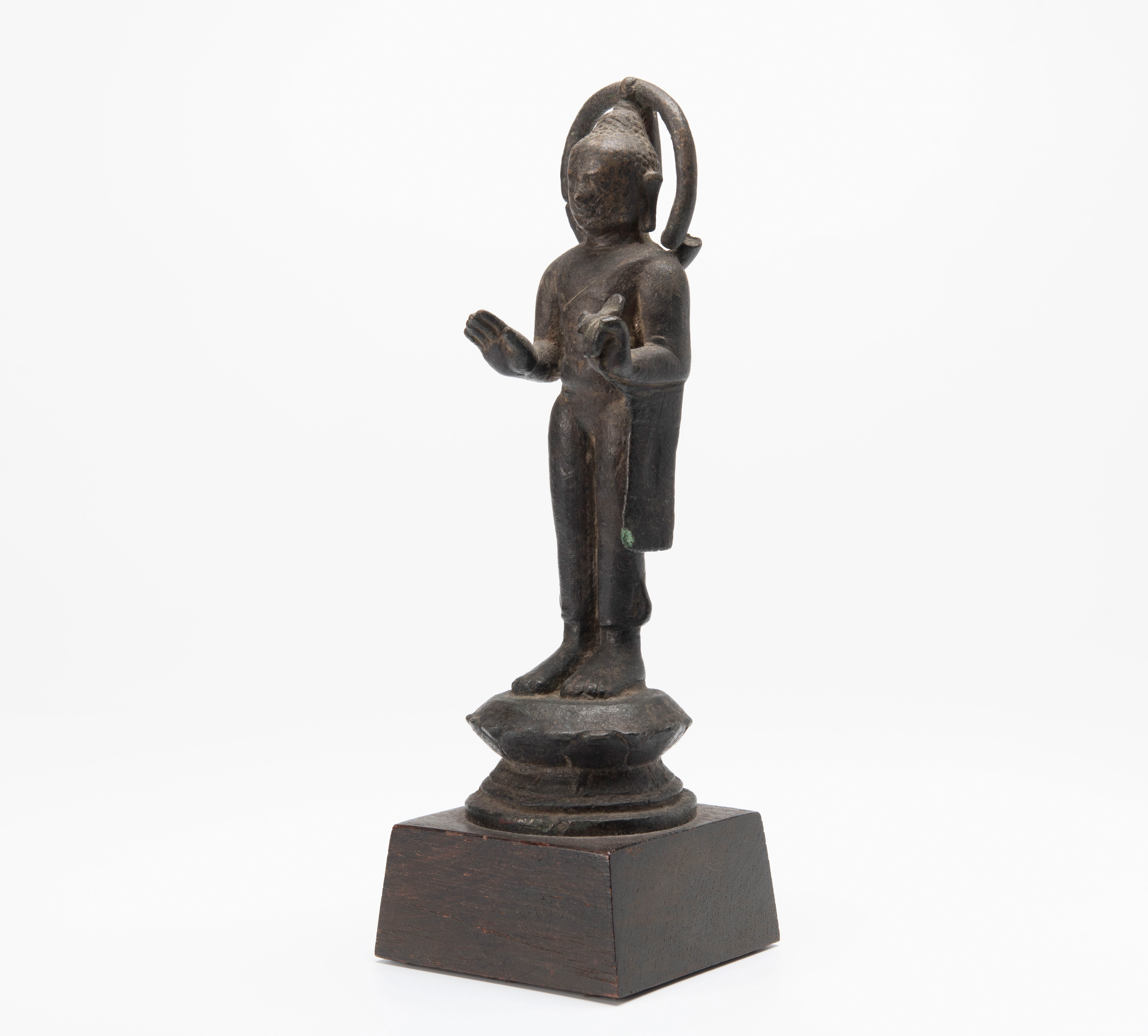 De Boeddha heeft de houding van geruststelling, abhaya-mudra. De stijl van dit beeldje lijkt op die van Zuid-India of Sri Lanka.