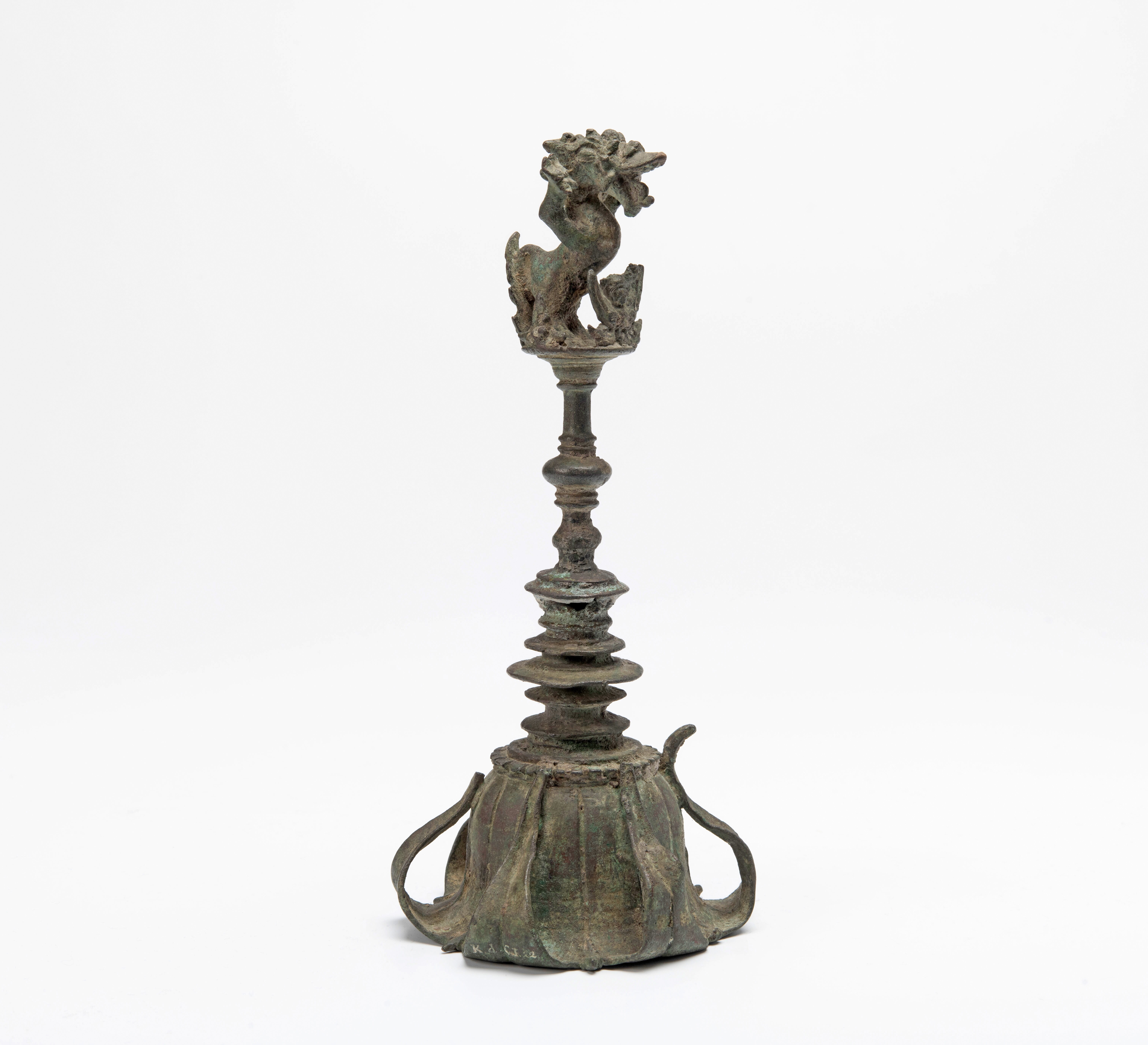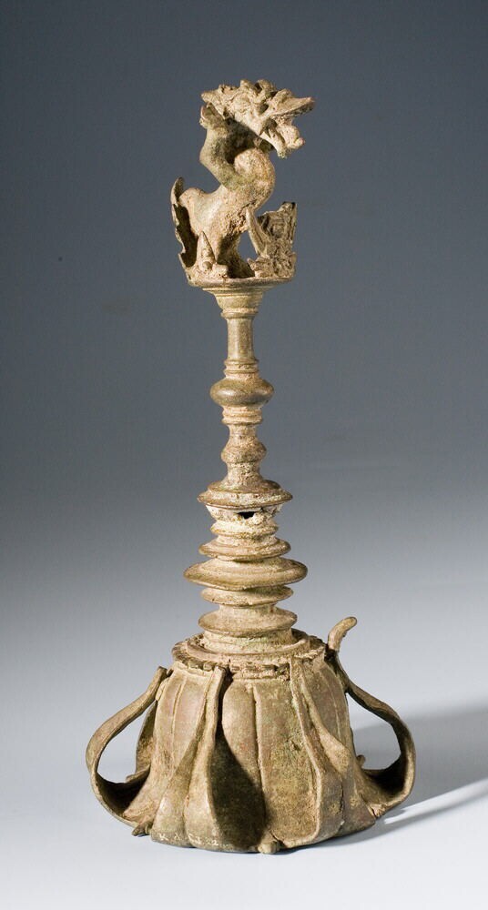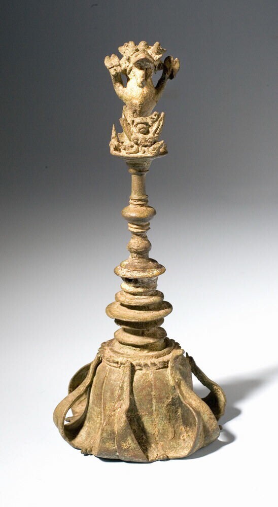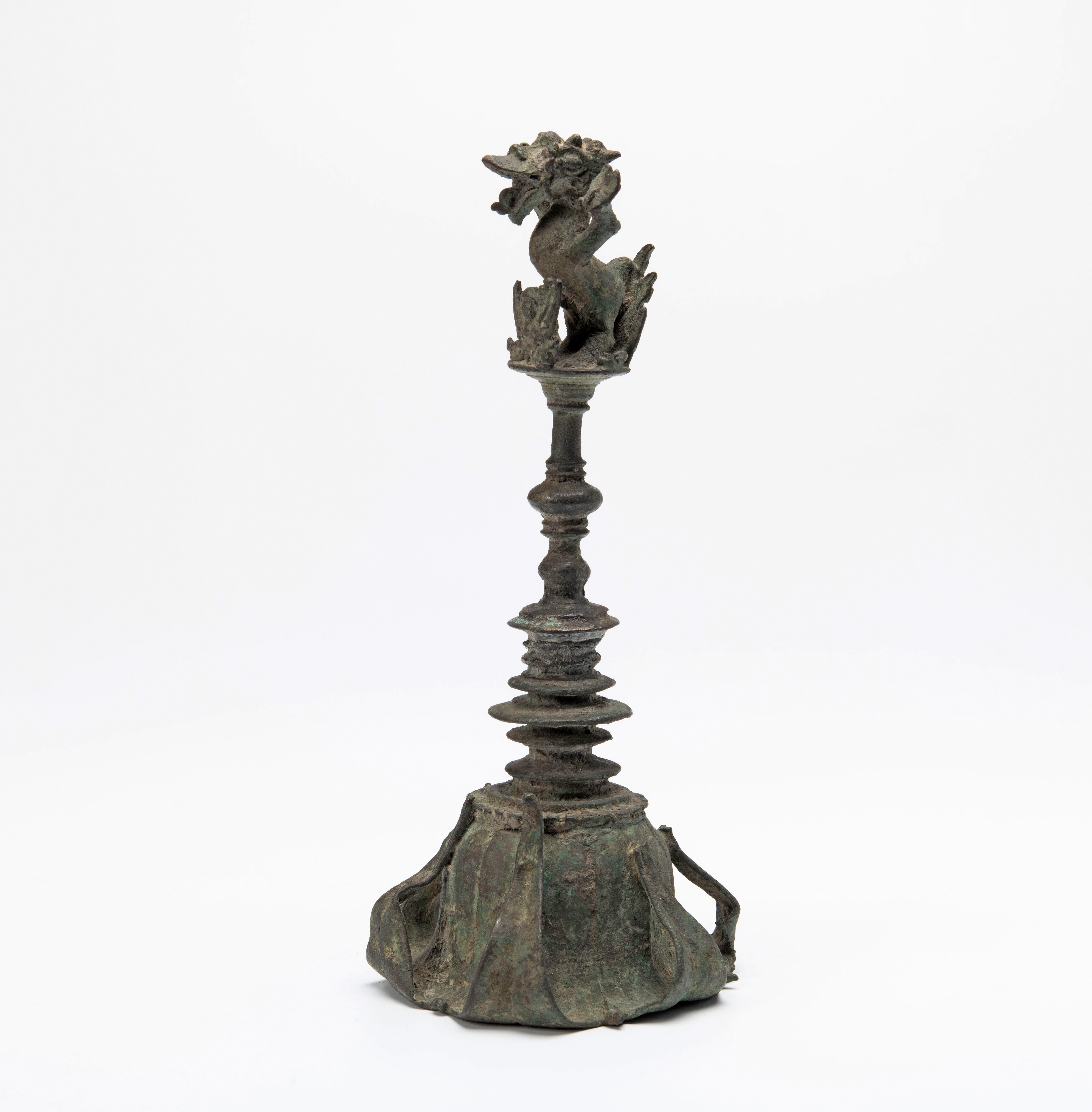 De buik van de bel is als een bloem met omgebogen bloemblaadjes vormgegeven. Op de top is een staande leeuw.