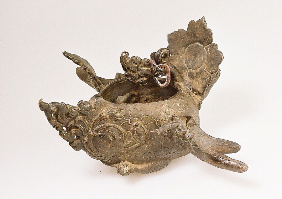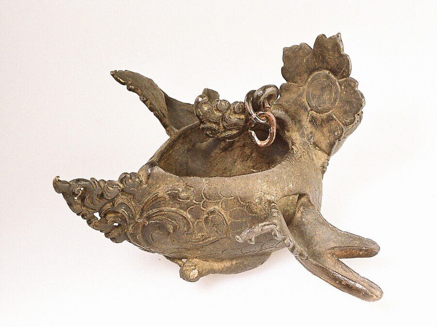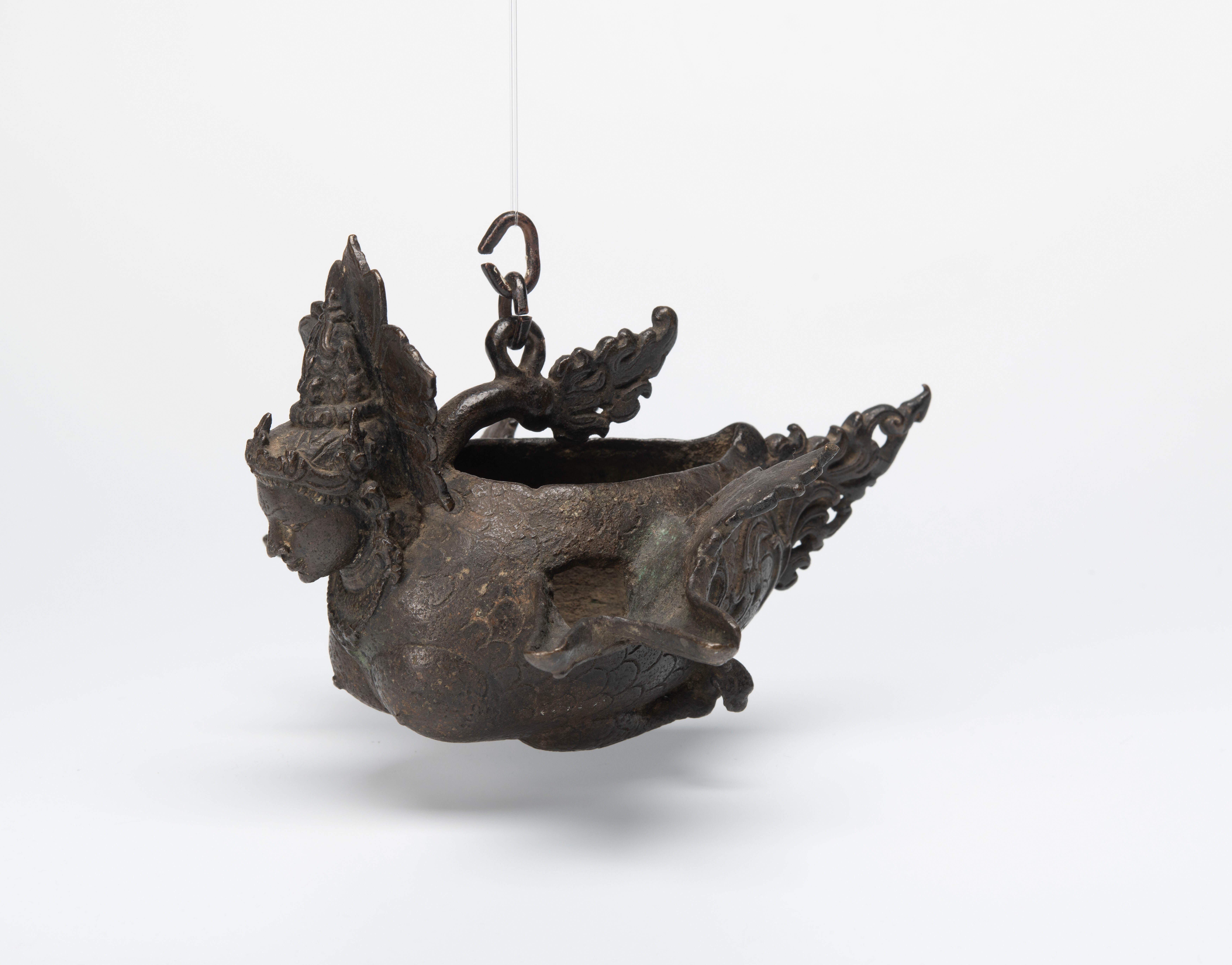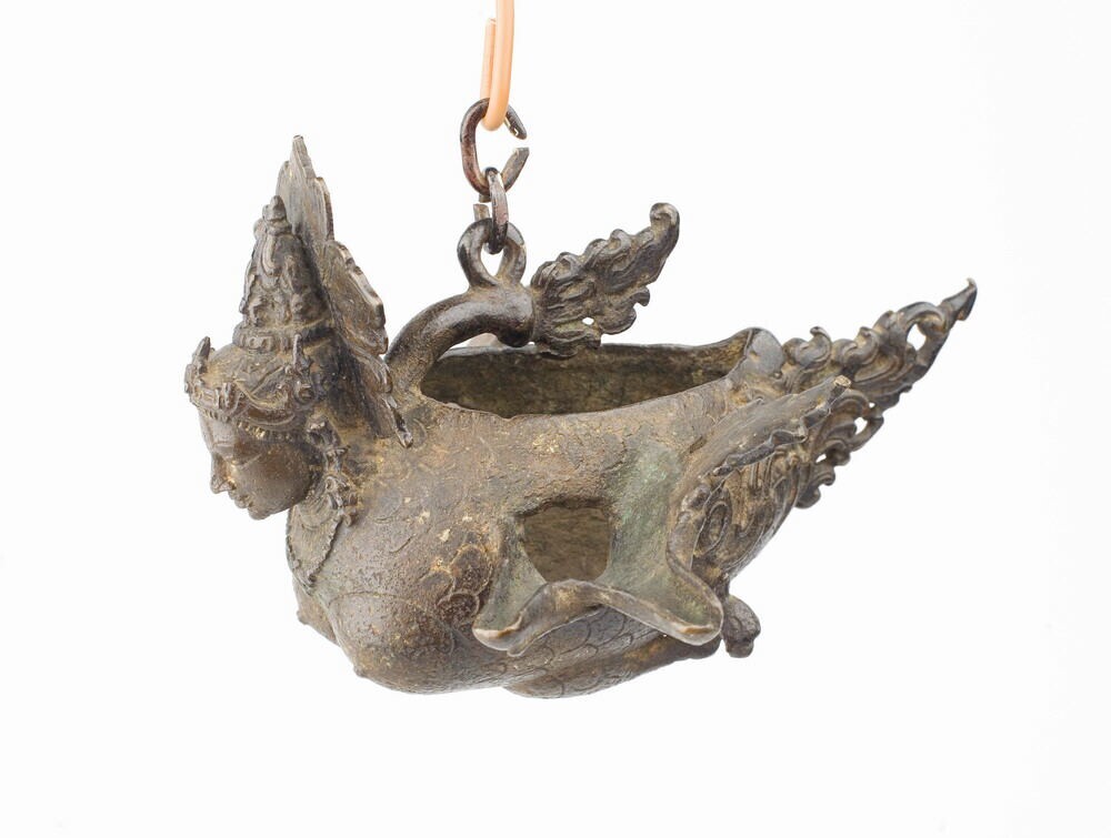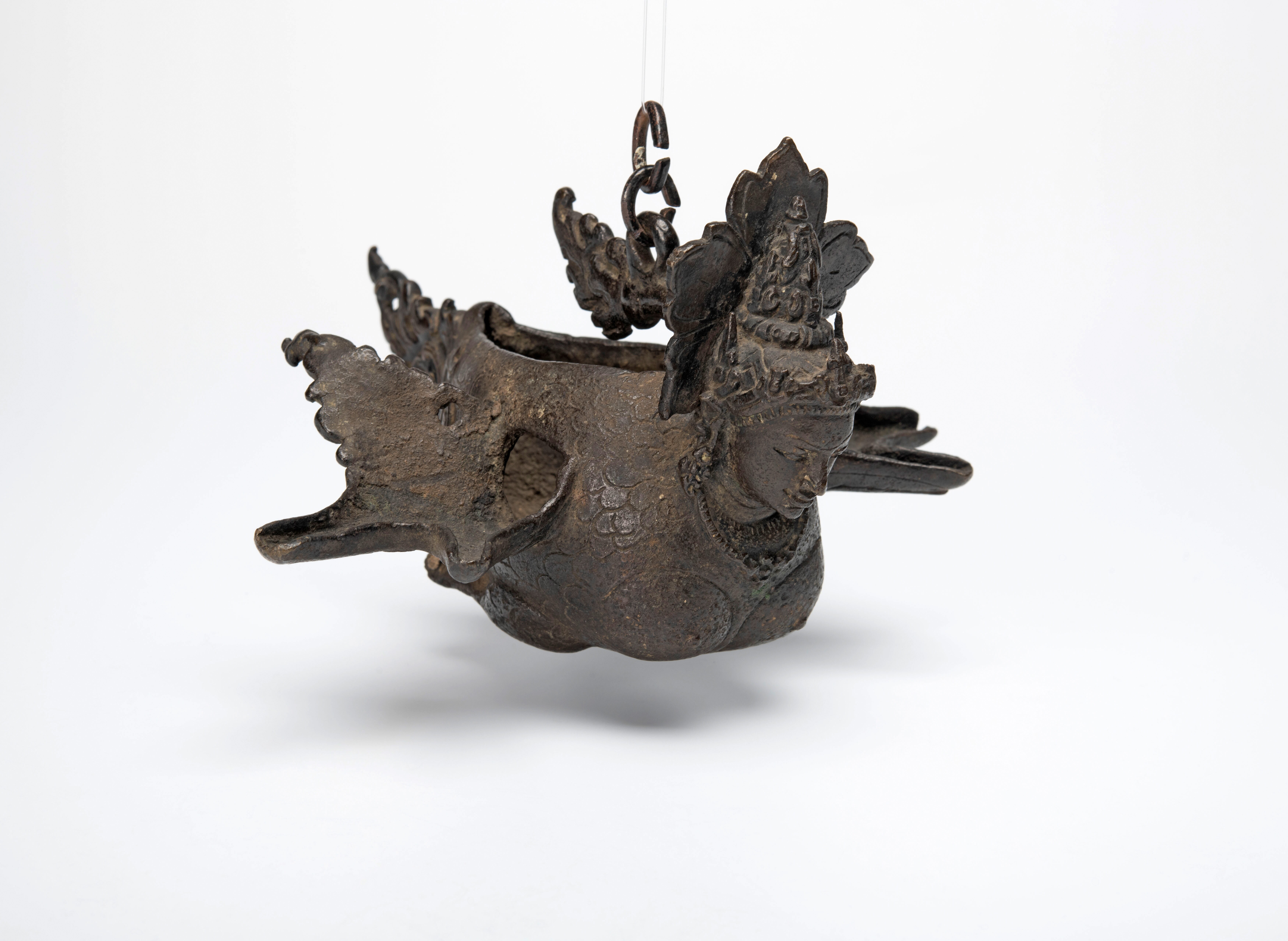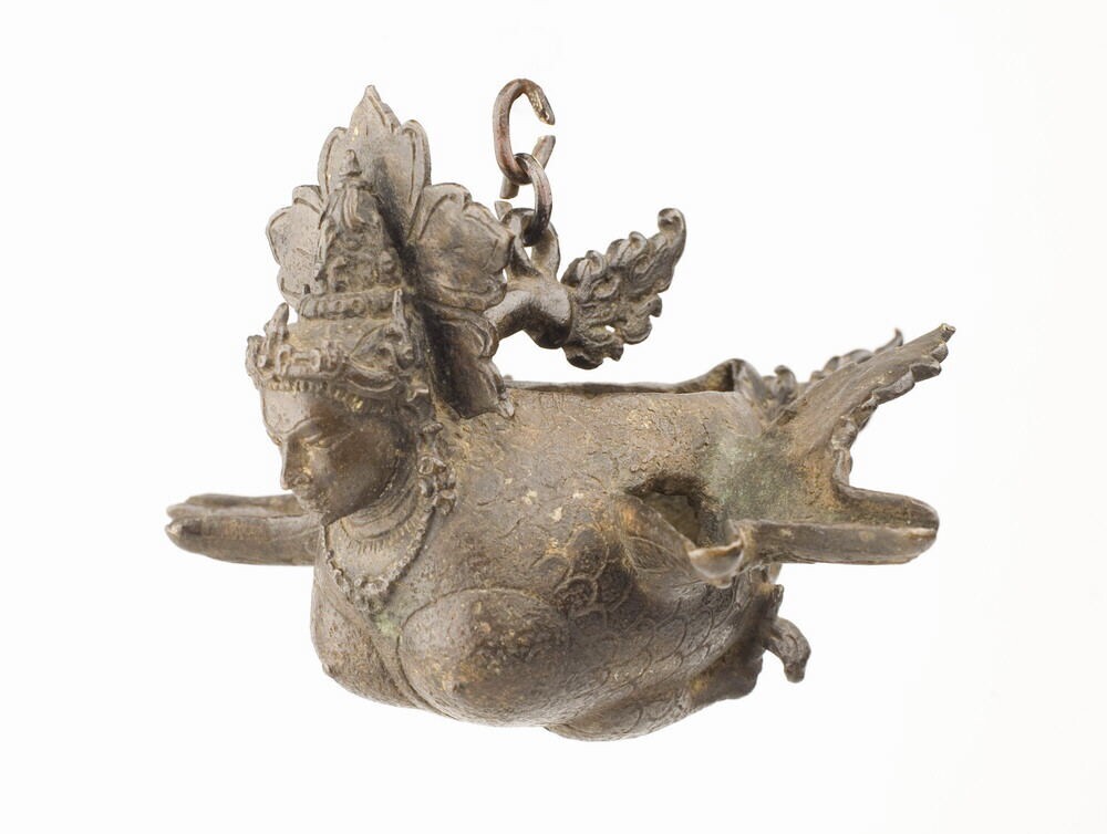 Olielamp in de vorm van een kinnari, een hemels wezen met het hoofd en de borsten van een vrouw en het lichaam, poten en vleugels van een vogel. Zo’n kinnari werd met liefde geassocieerd en is misschien daarom een passende vorm voor een lamp die in de nacht licht bracht.