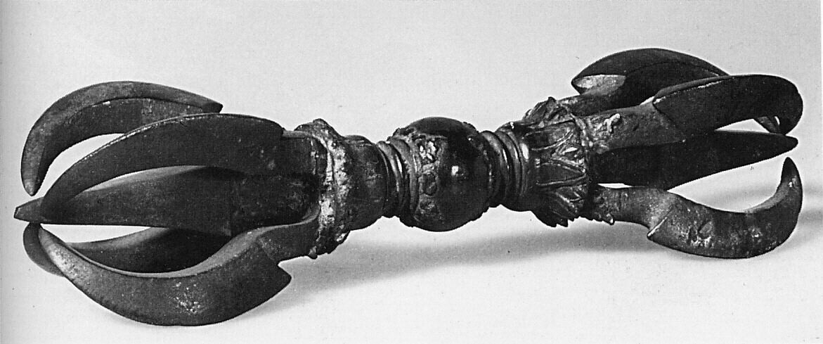 Buddhist priests use a vajra in certain rituals. The vajra is held in the right hand by the knob. In the left hand the priest is holding a bell - ghanta.