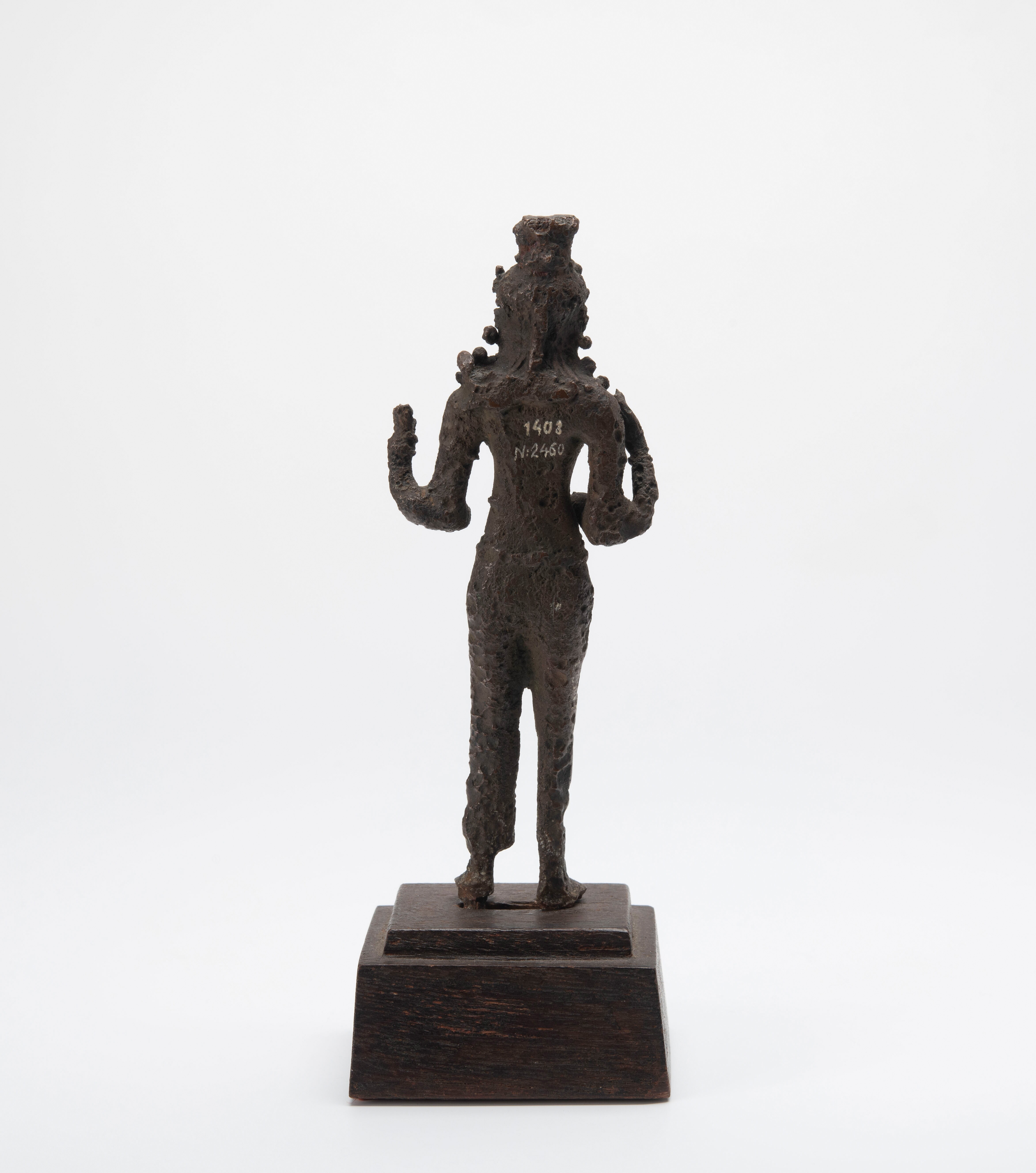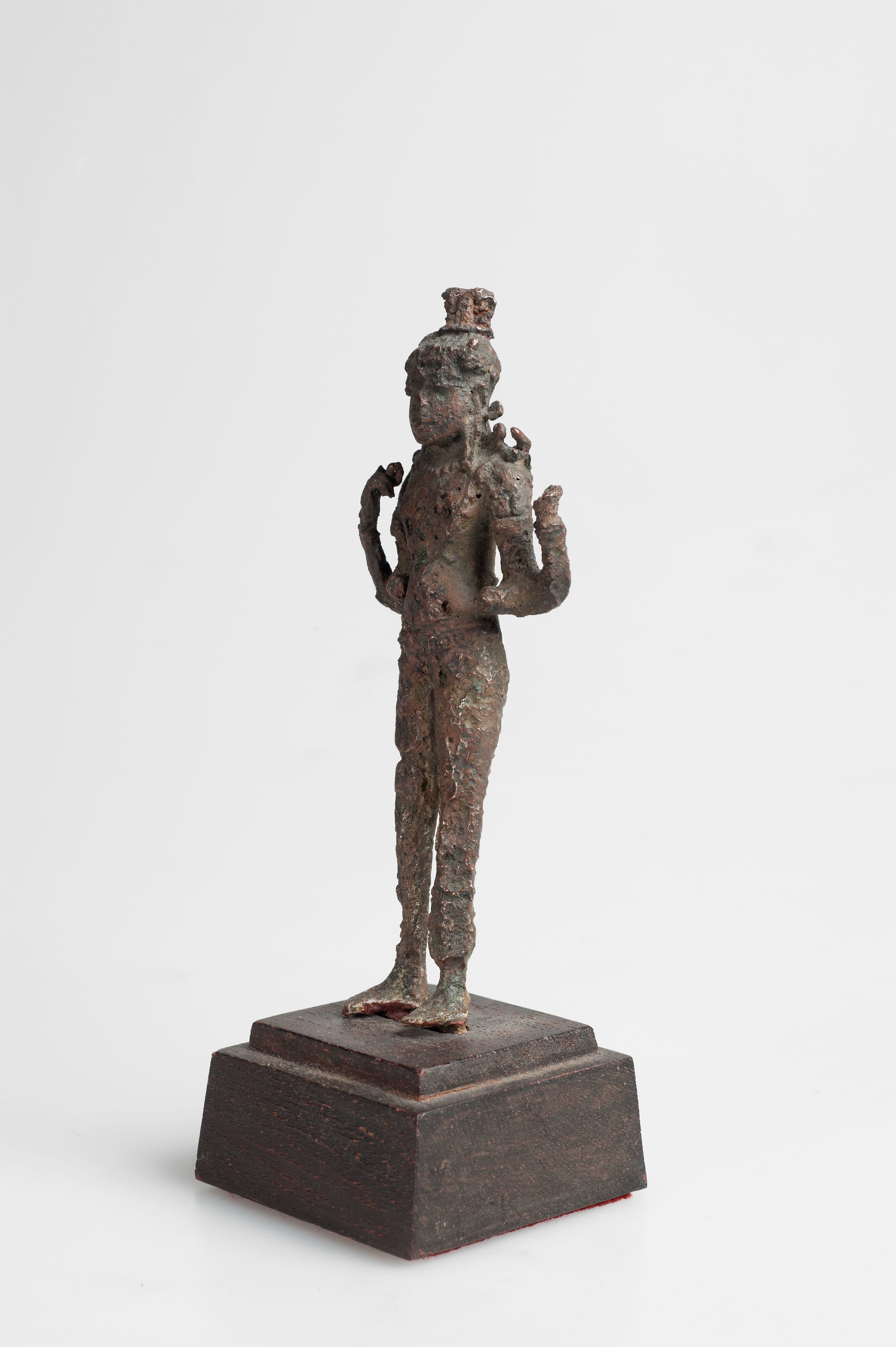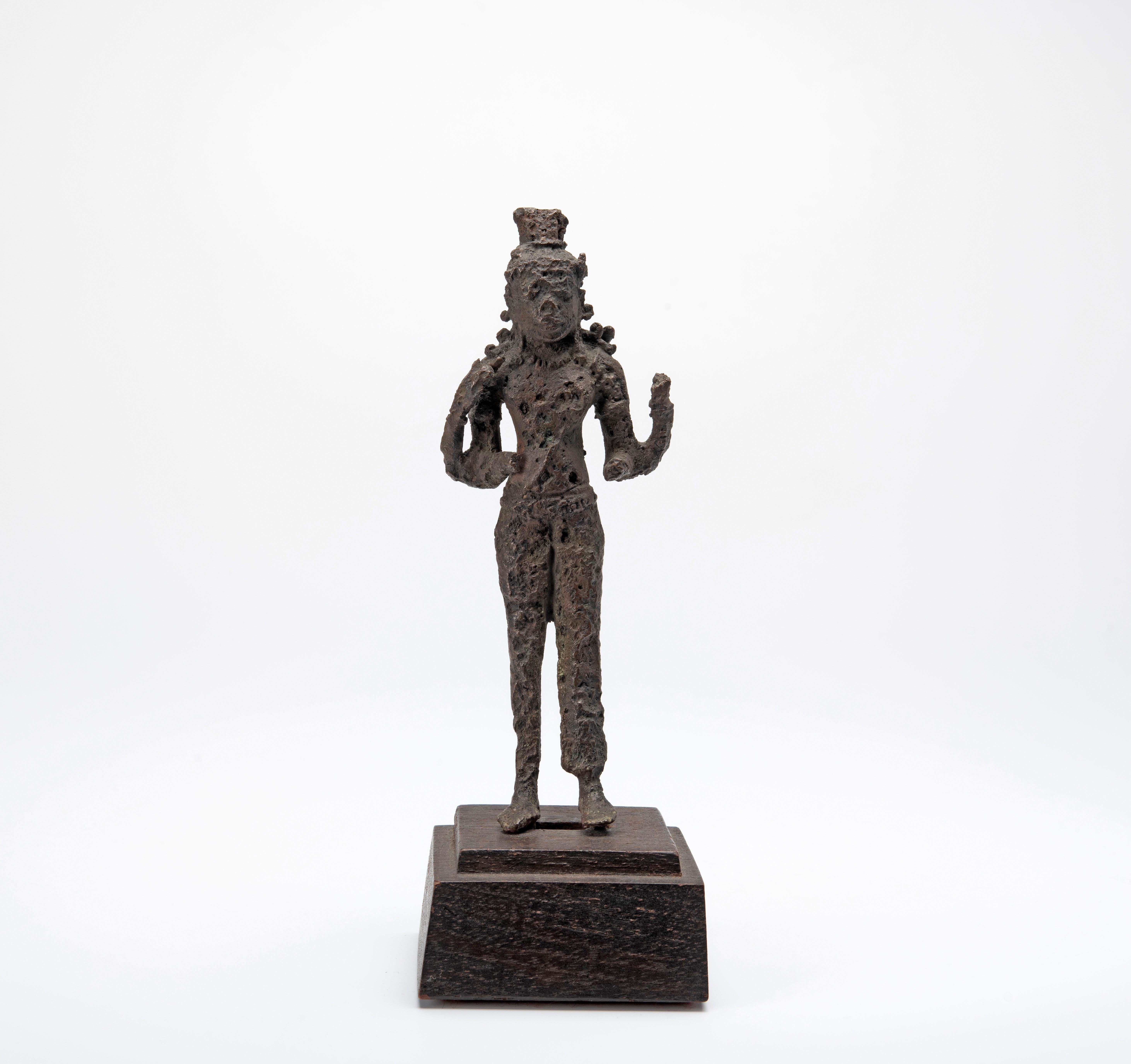 Staand beeldje met vier armen dat sterk verweerd is.