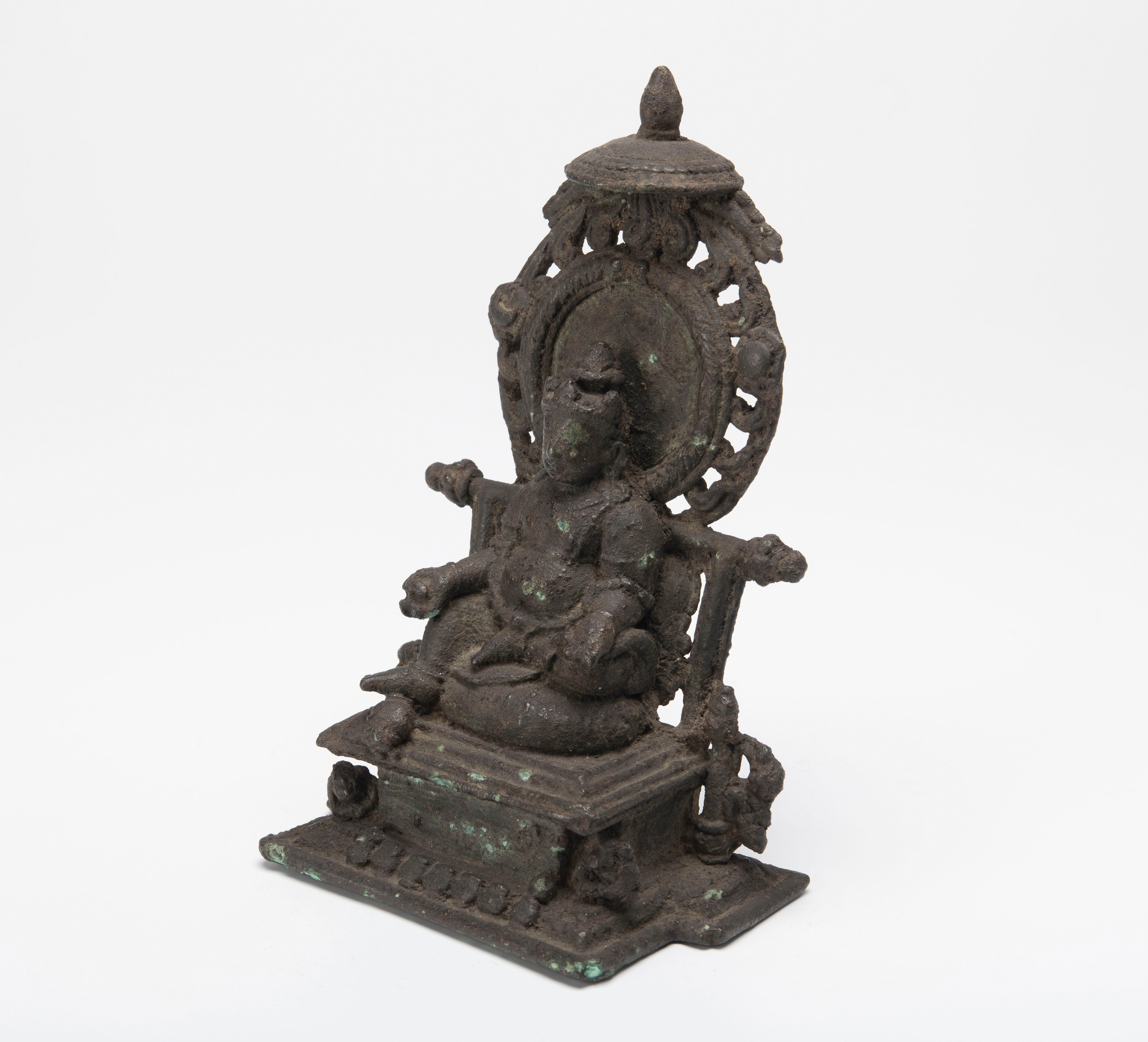 Zijn ene voet rust op een pot. In zijn rechterhand heeft hij een rond voorwerp, misschien een vrucht. In zijn andere hand lijkt een geldzak te zitten. Op het voetstuk van de troon zijn zeven kleine potjes te zien, als teken van zijn rijkdom. Mogelijk is dit beeldje uit India geïmporteerd. Het heeft allerlei kenmerken ...