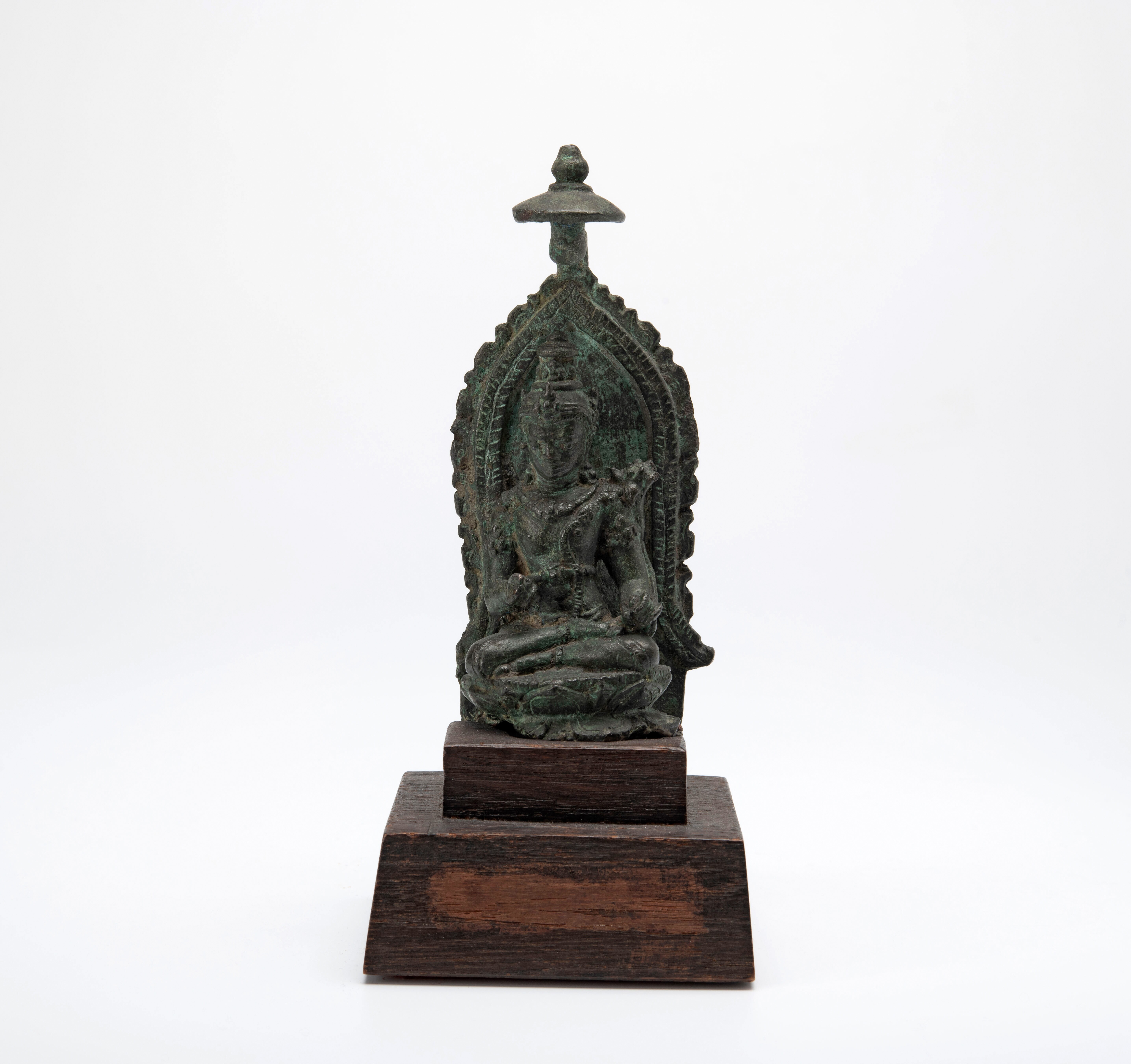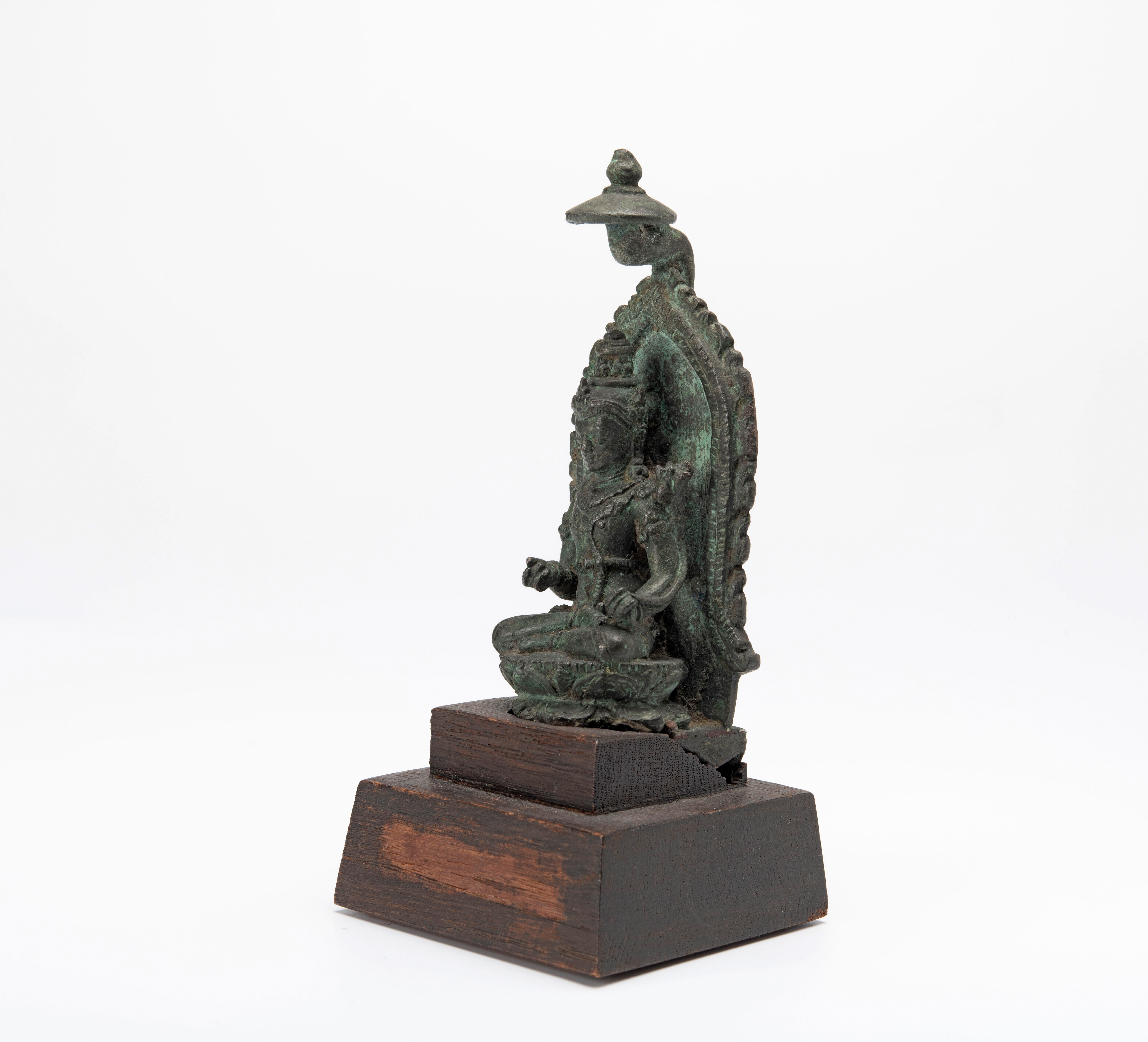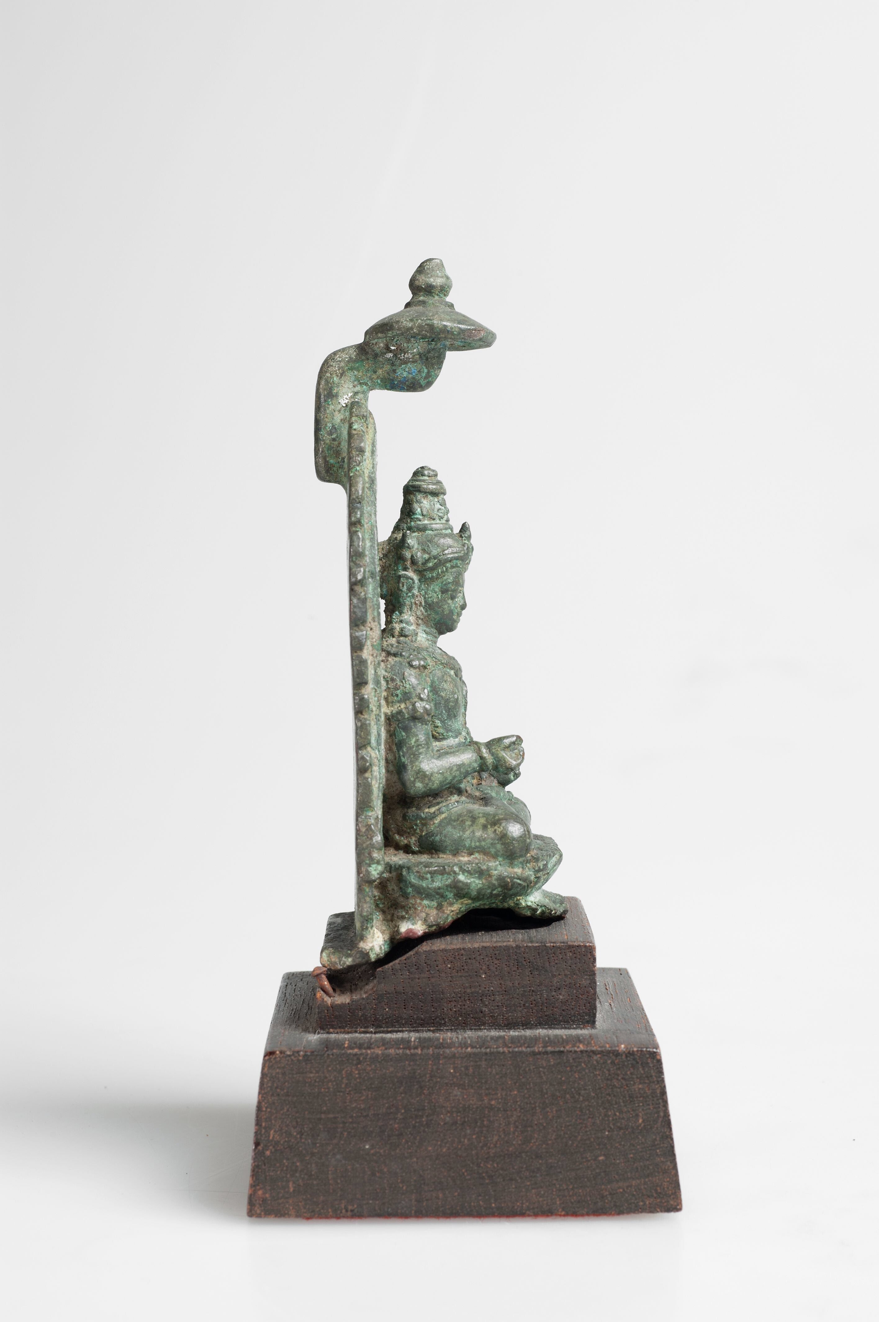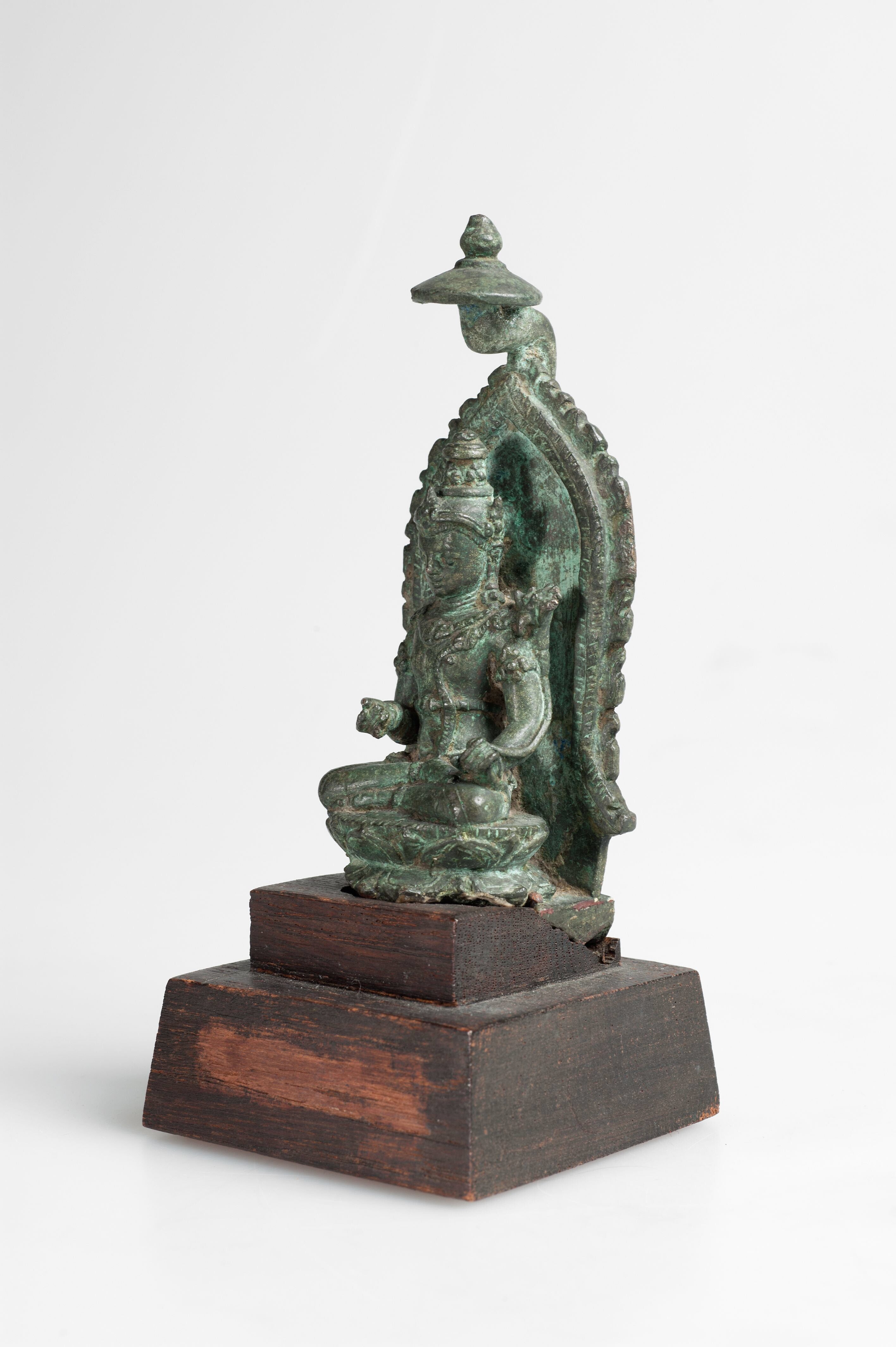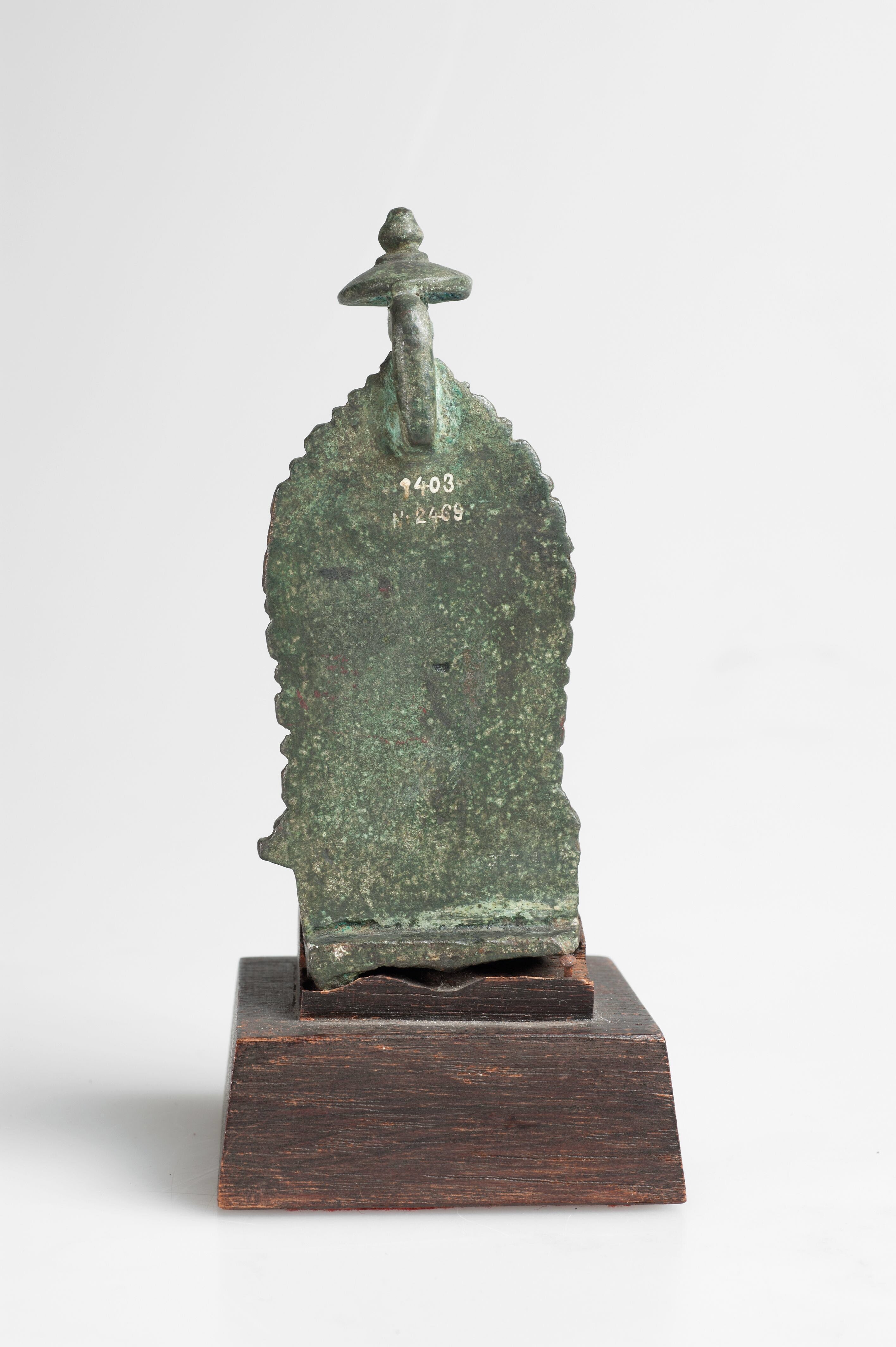 Dit beeldje zit met het ene been over het andere. Het heeft een achterstuk met een visgraatmotief en een simpel bladmotief en dateert daarom van rond de negende eeuw.