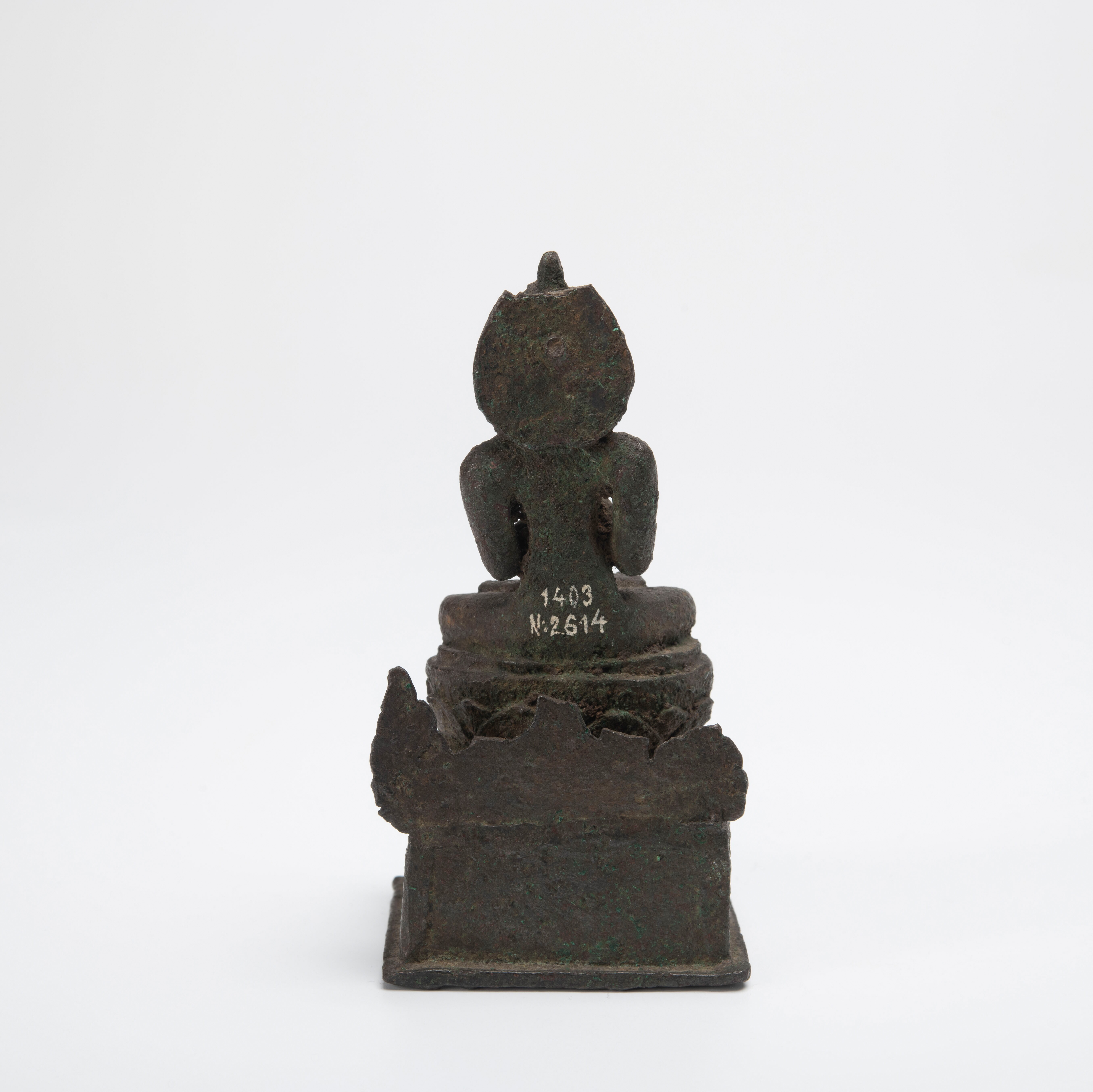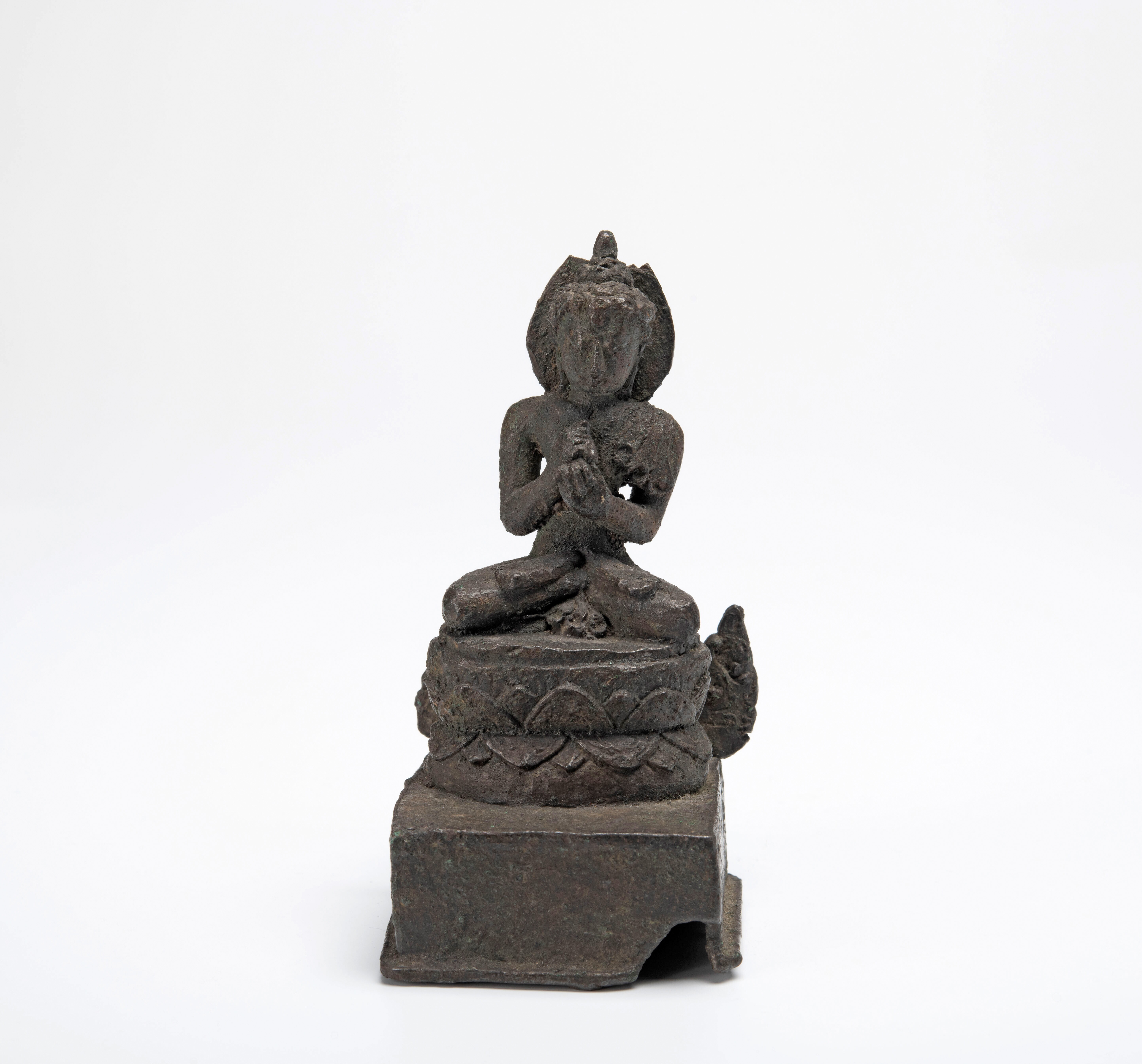 De Boeddha heeft zijn handen in de houding van bodhyagri-mudra, de handhouding van de hoogste wijsheid.