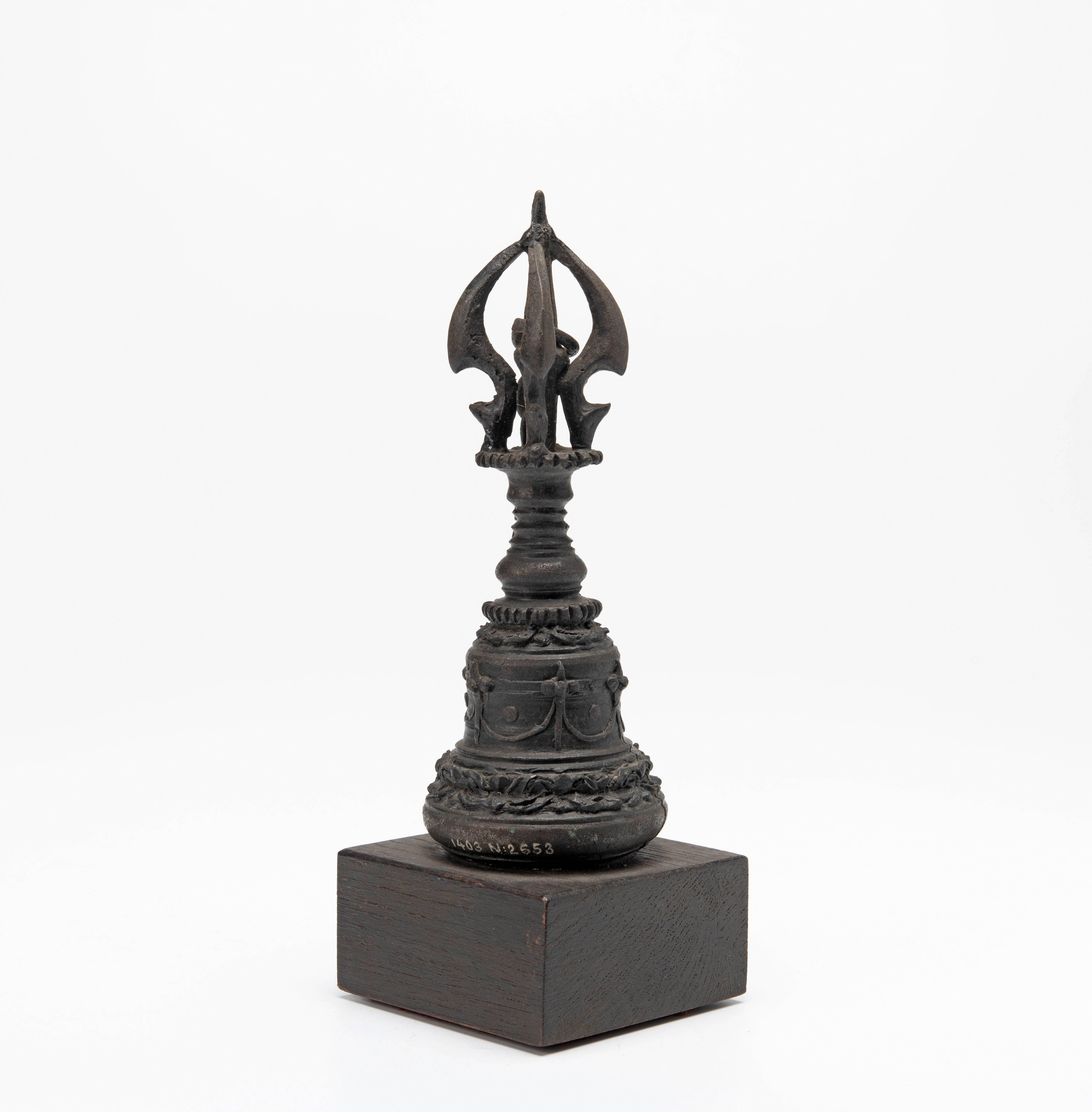 Deze handbel heeft een vajra-vormige top. Vreemd genoeg zit er ook een ketting aan.