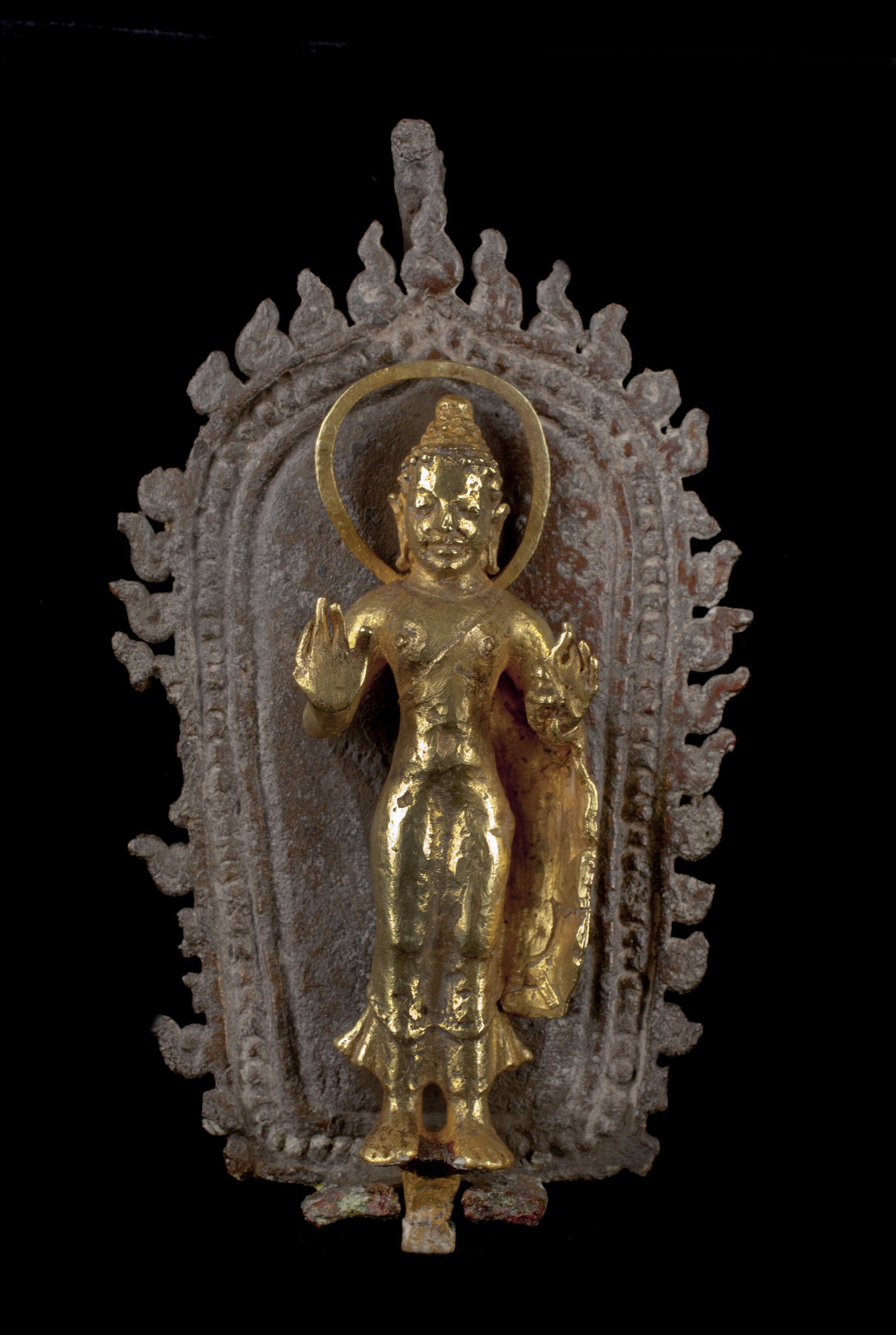 De boeddha is te herkennen aan de uitstulping op de schedel, de haarkrullen en de monnikspij. Hij staat rechtop, de beide handen op schouderhoogte naar voren gericht, en heeft een draadvormig aureool achter het hoofd. De rechterhand maakt het gebaar van geruststelling, de linkerhand houdt een punt van de monnikspij vast. De pij is zo ...
