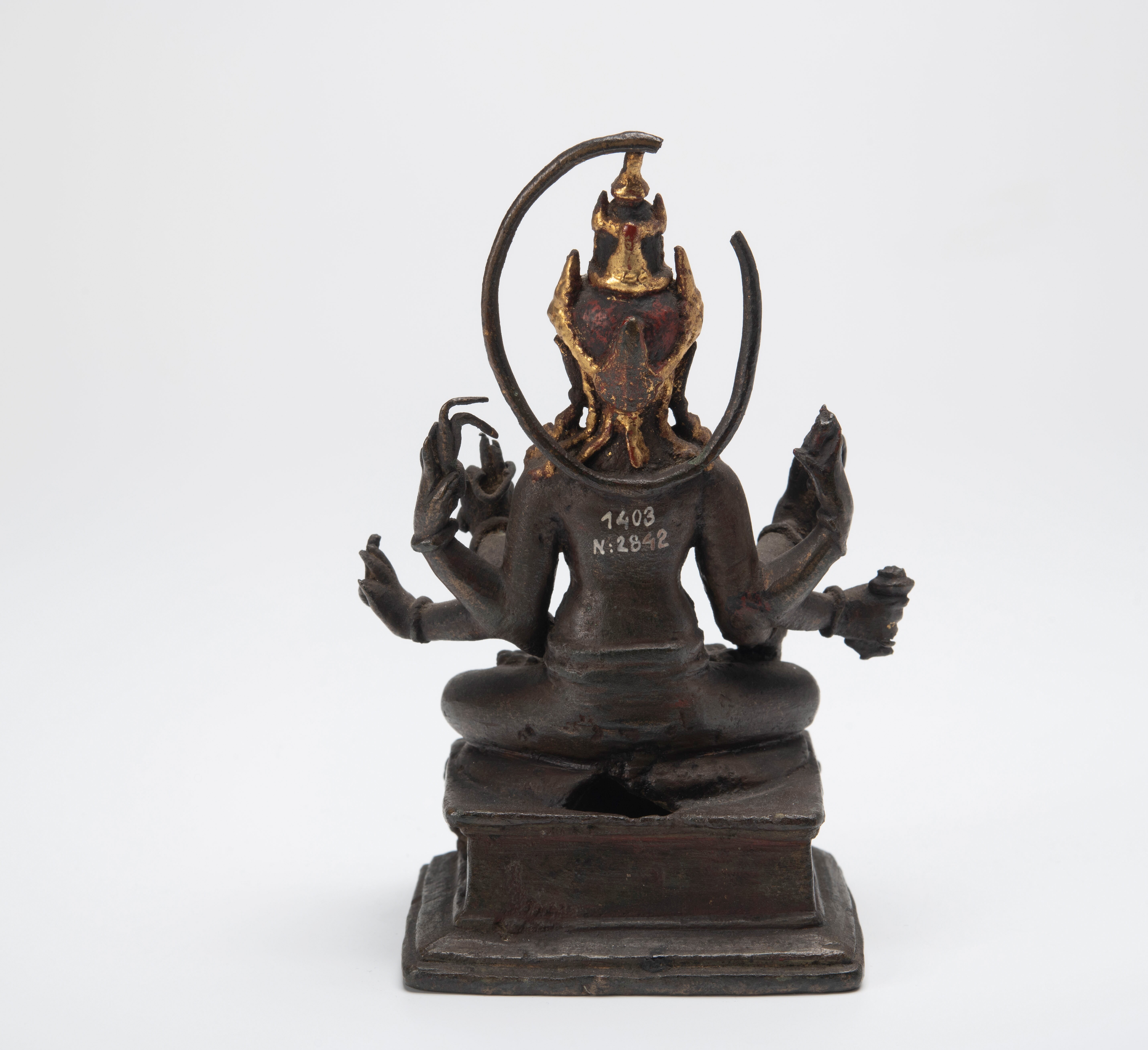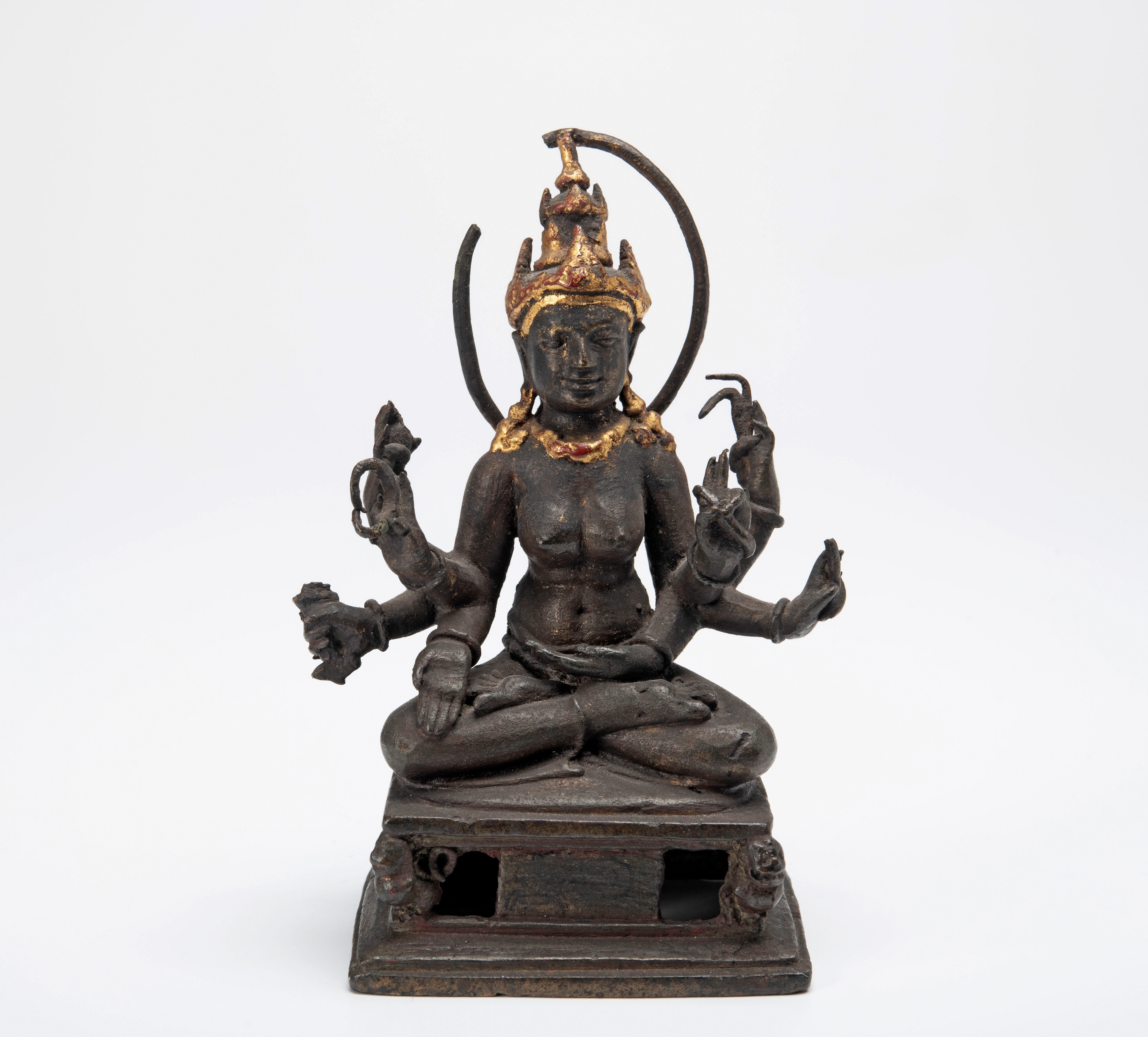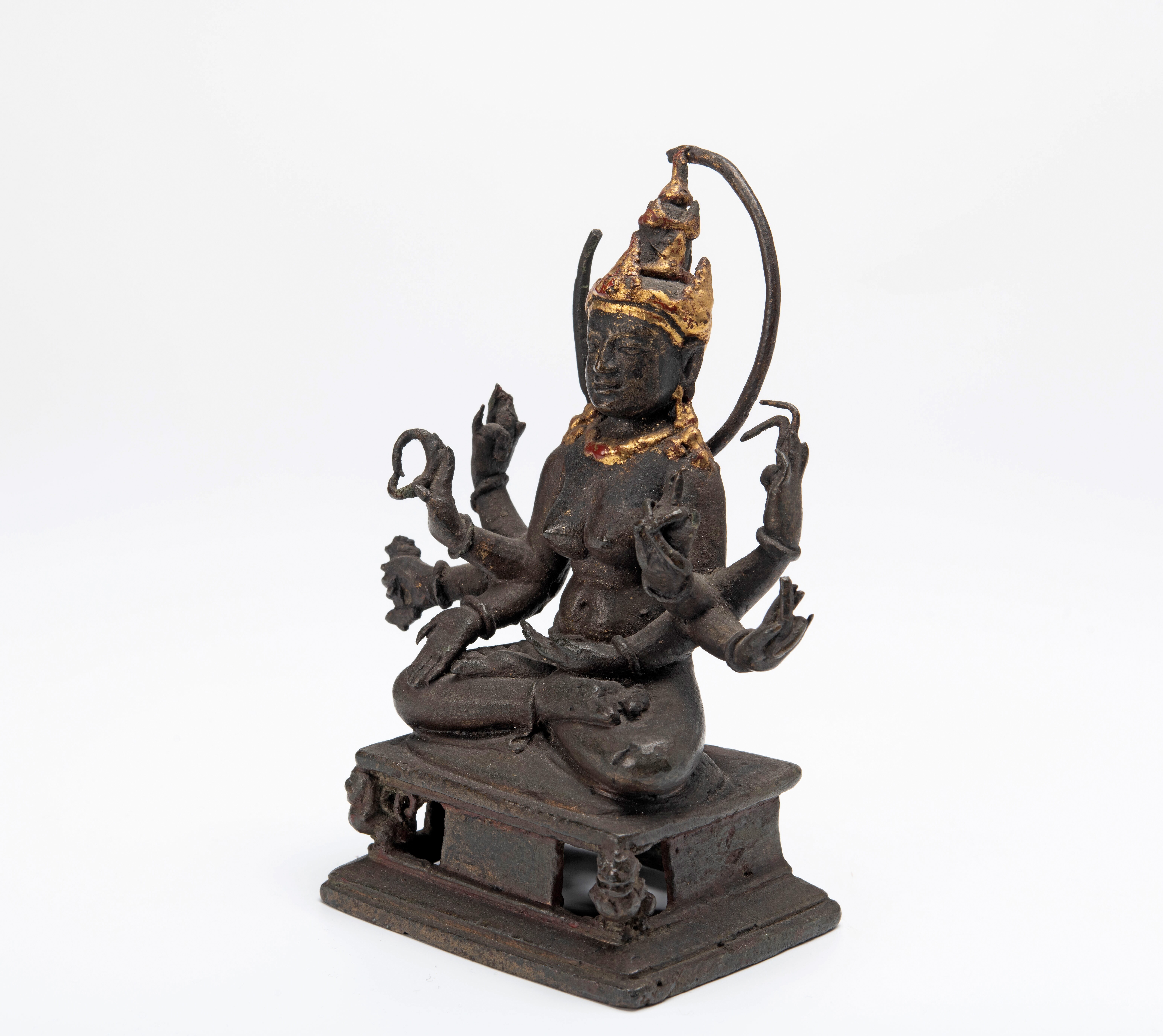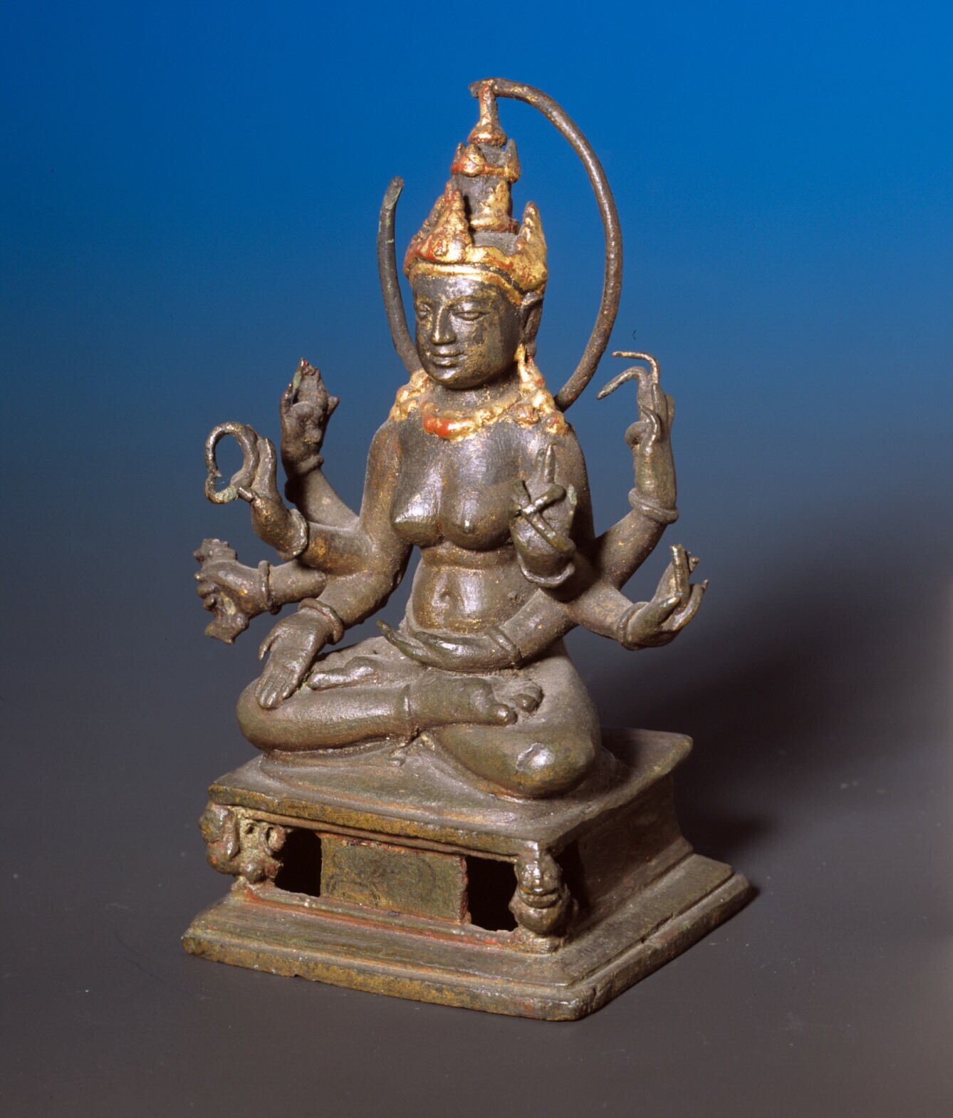 De identificatie van deze achtarmige godin staat nog niet precies vast. Helaas zijn veel van de attributen die ze in haar handen draagt kapot of niet meer aanwezig.