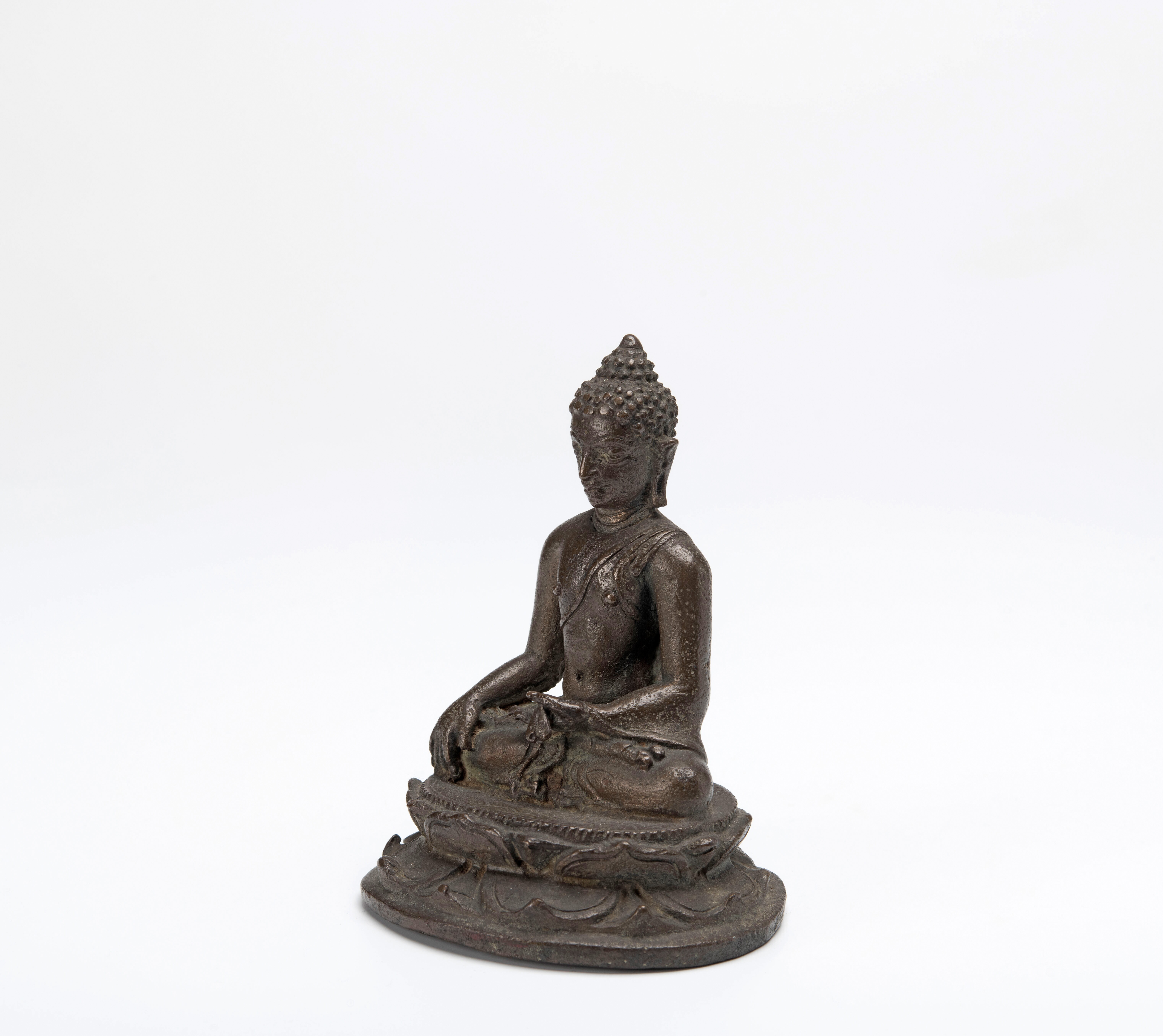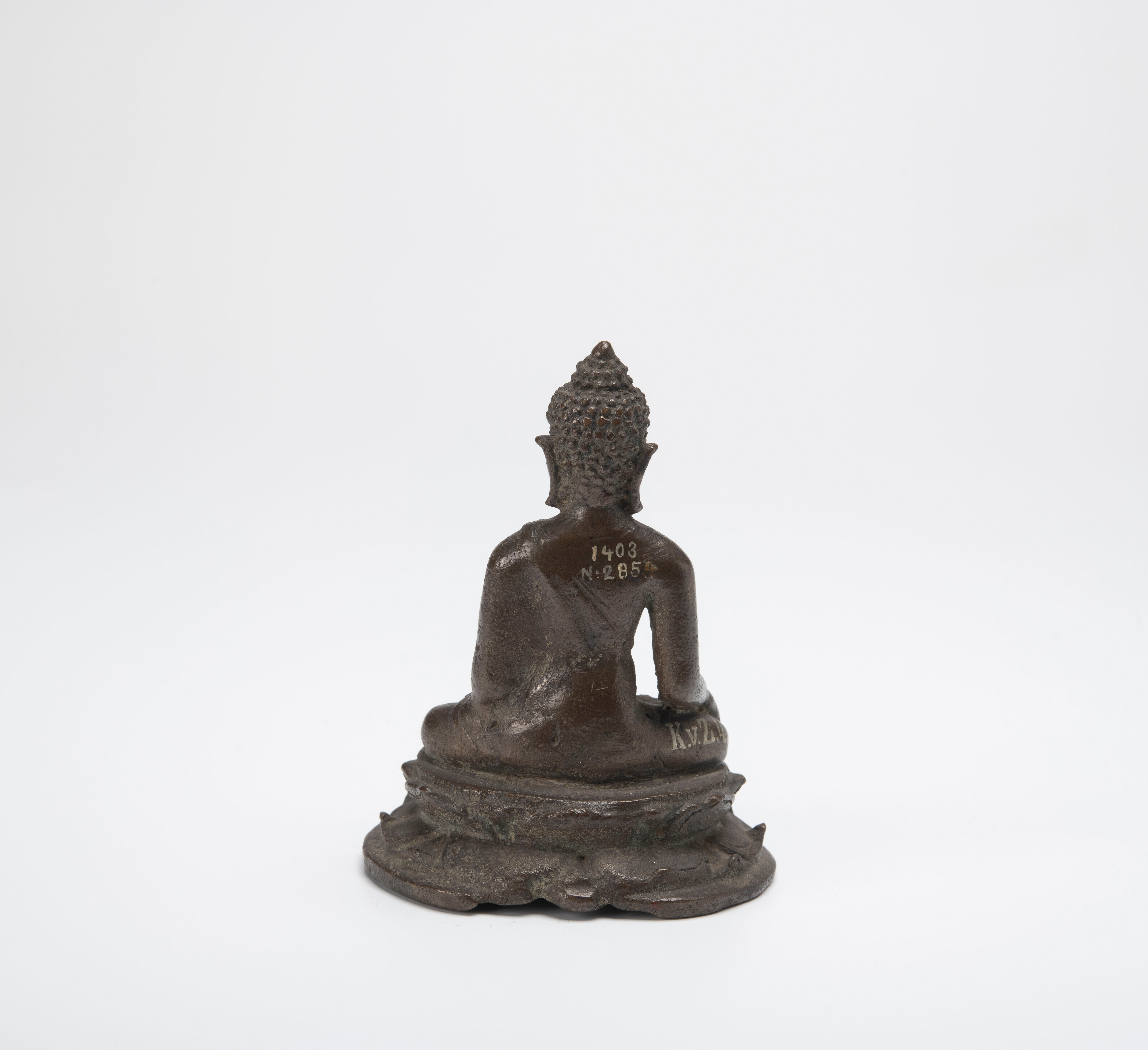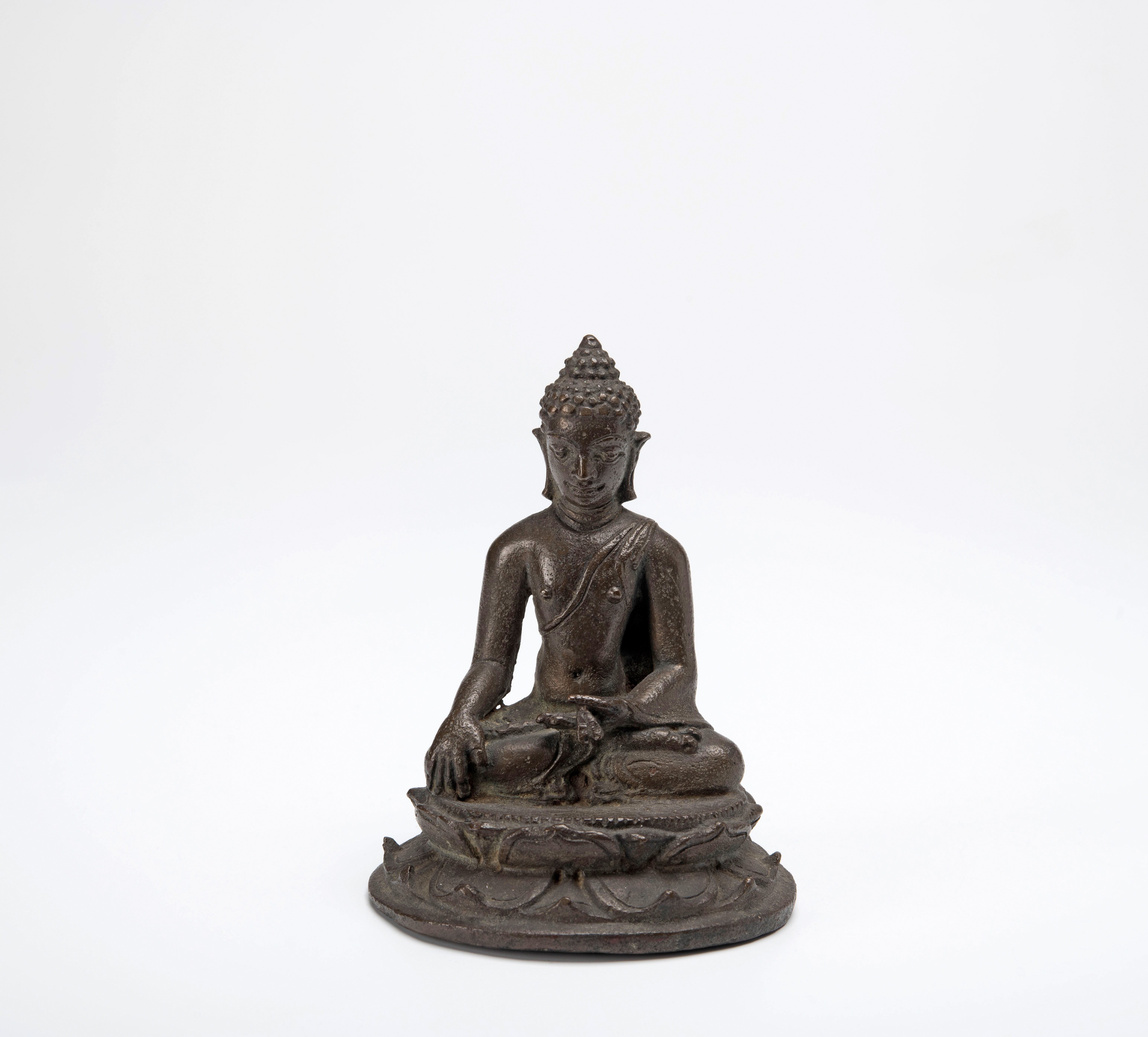 De Boeddha zit met gekruiste benen op een lotuszetel met zijn hand in de bhumisparsha-mudra.