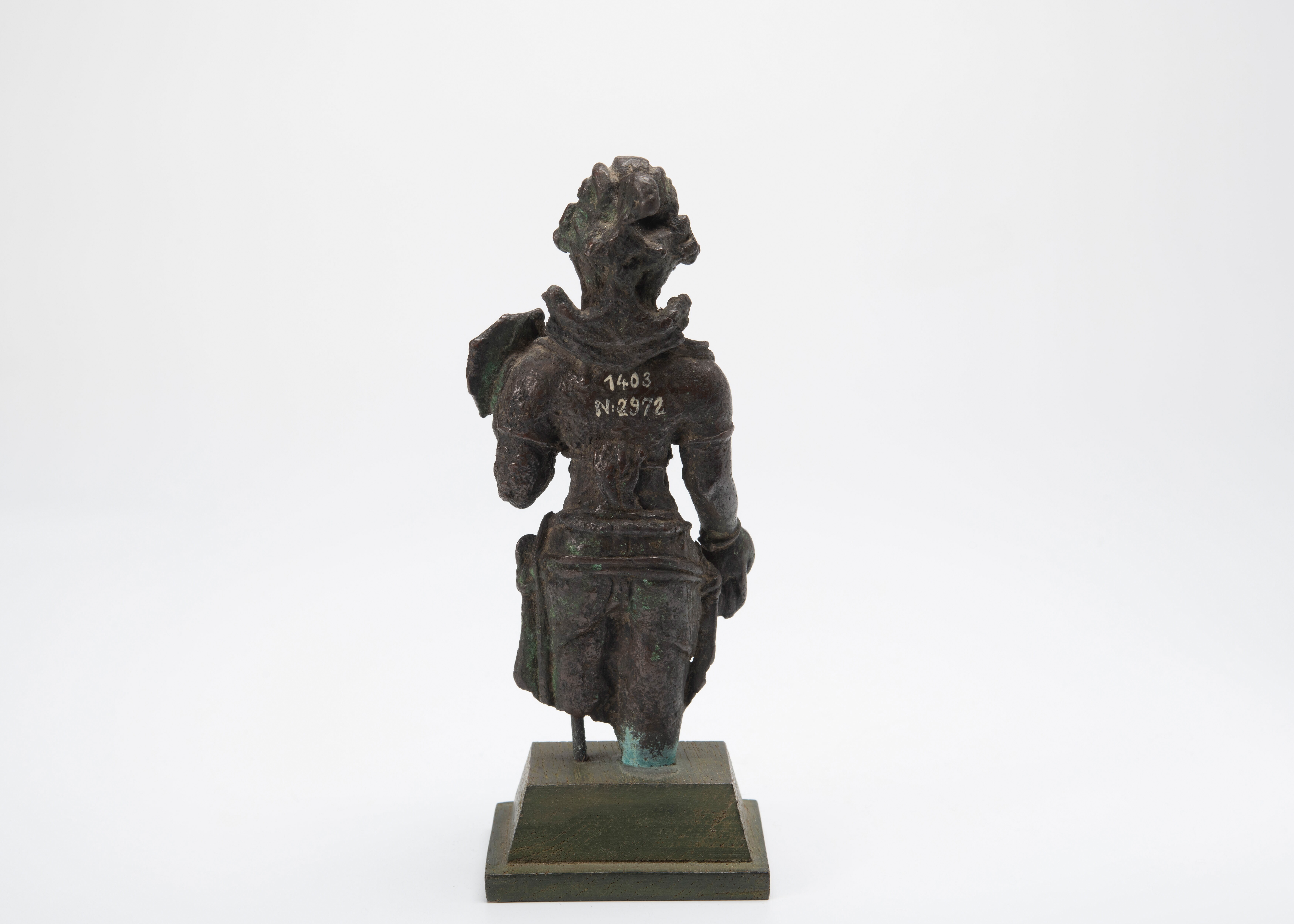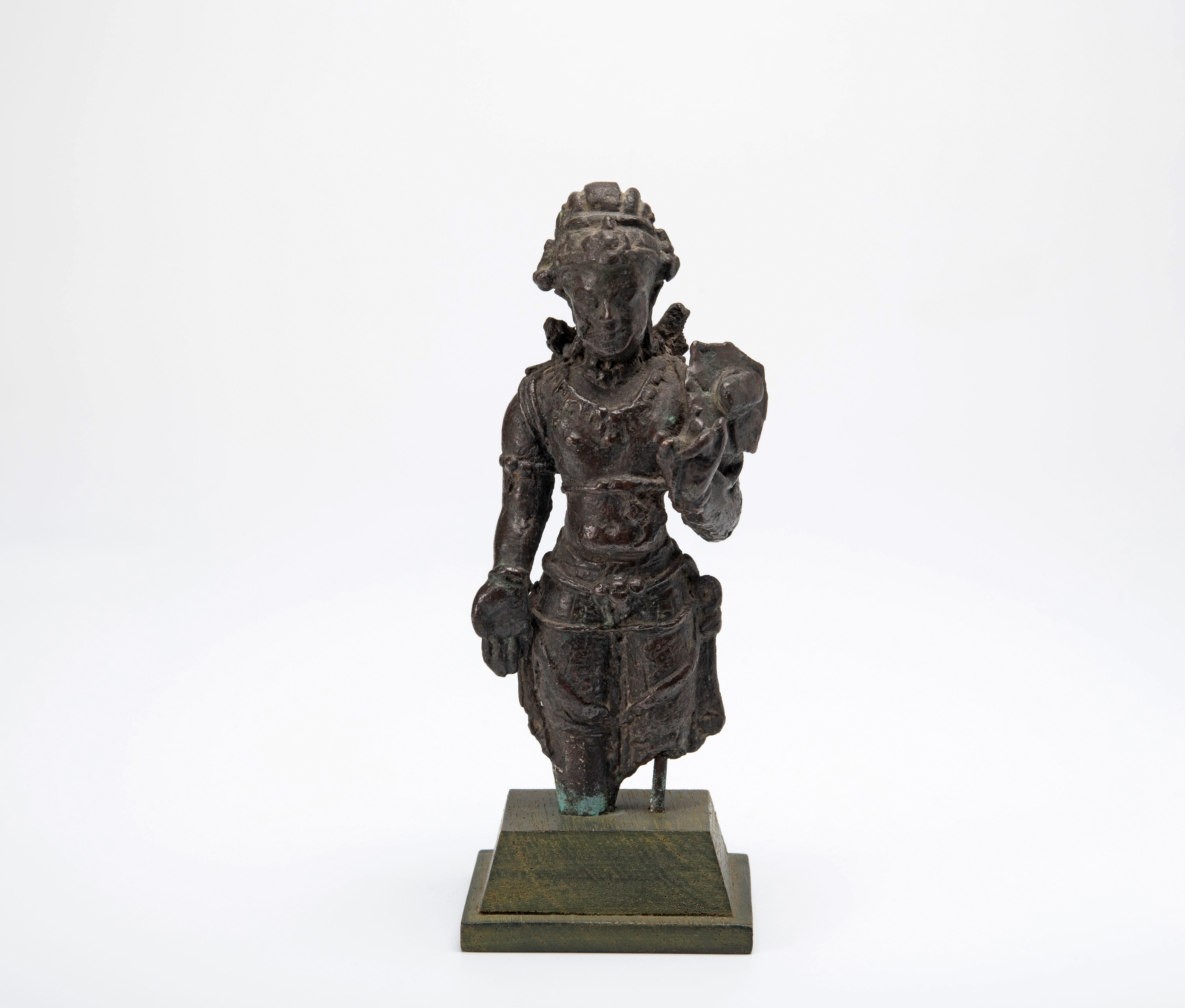Omdat dit beeldje juwelen draagt, zou het een Bodhisattva kunnen zijn. De rechterhand is in de houding van geven, varada-mudra. Veel Bodhisattva’s hebben die handhouding. De andere hand houdt een grote lotusbloem vast. Die zou kunnen duiden op Avalokiteshvara, maar dan zouden we ook een klein Boeddhafiguurtje in zijn haartooi verwachten en die is niet ...