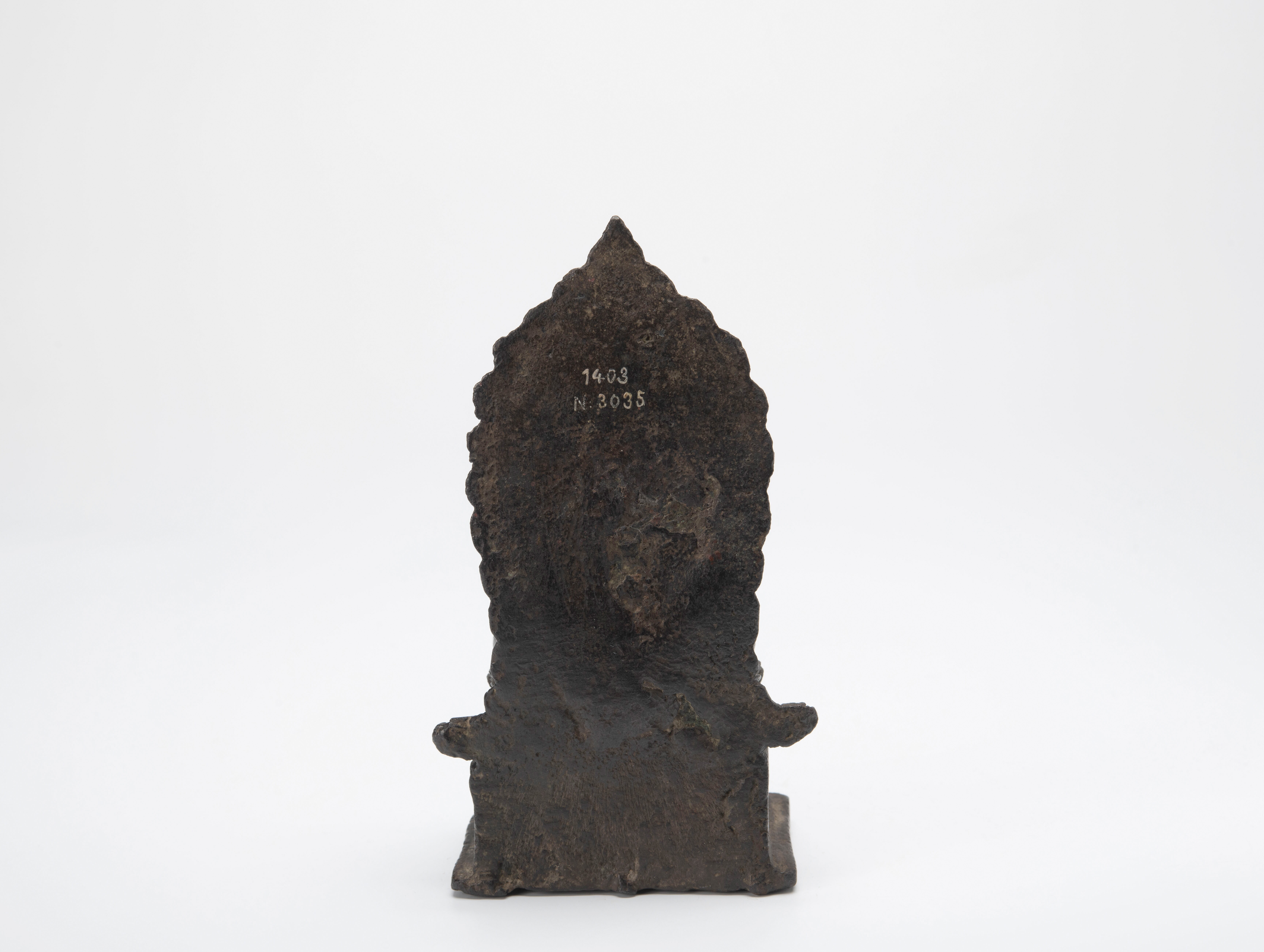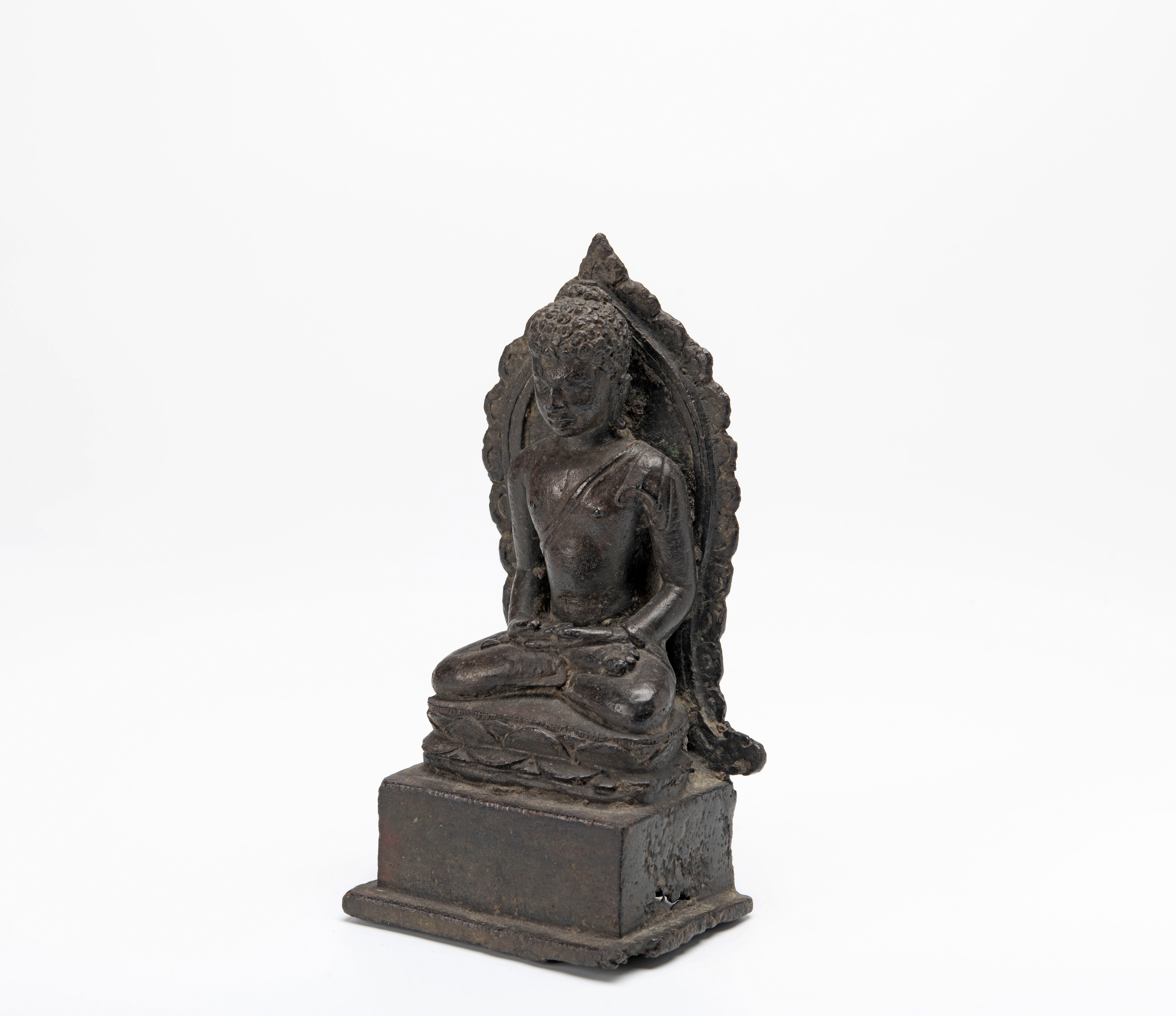 Dit beeldje heeft de handen in de houding van meditatie, dhyana-mudra. Het heeft wat vreemde elementen: de uitstulping op het hoofd, ushnisha, is ver op het achterhoofd geplaatst, wat meestal niet het geval is, en de rand van het achterstuk, met halfronde motieven, is niet bekend van andere beeldjes.