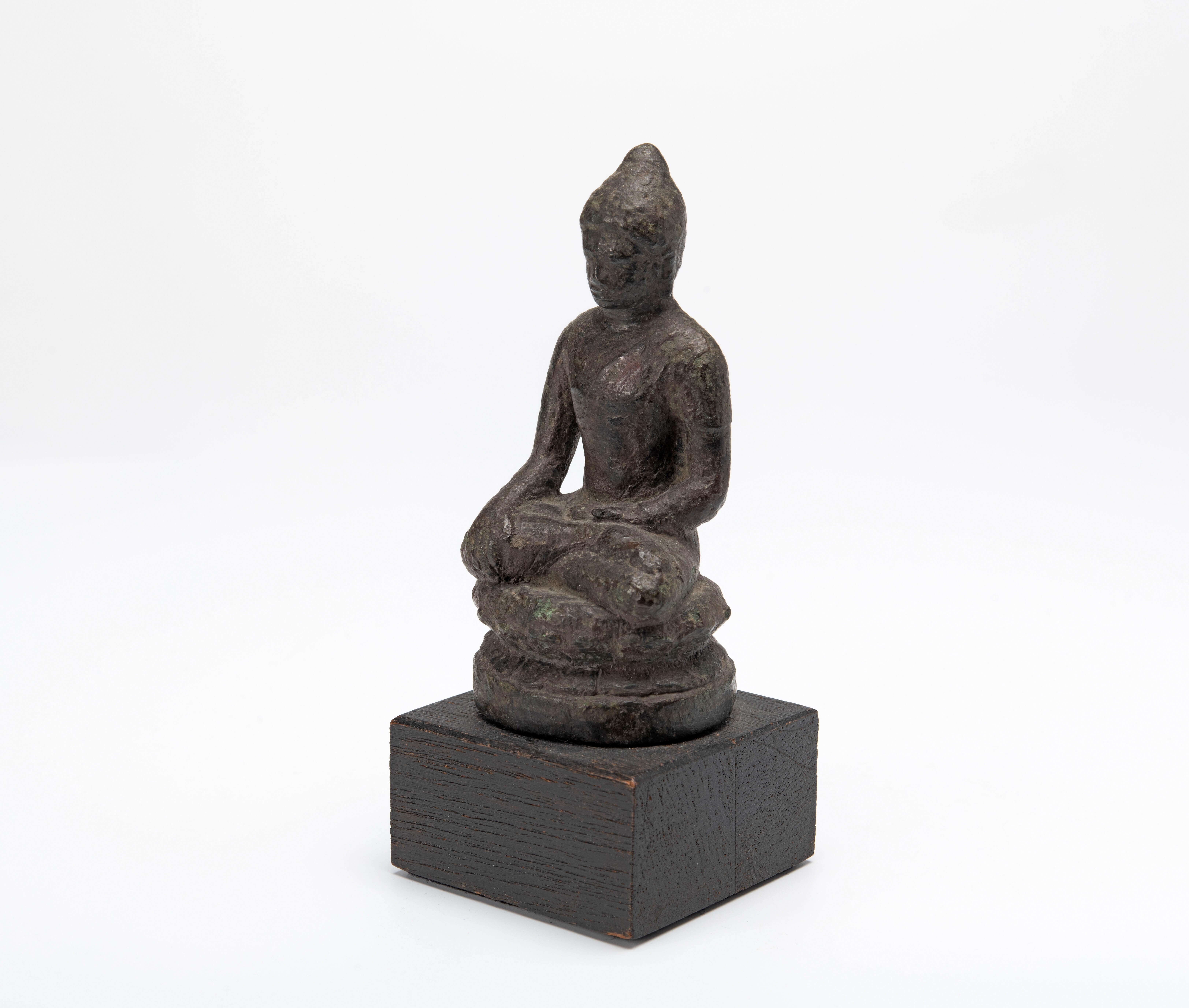 De Boeddha zit met gekruiste benen op een lotuszetel met zijn hand in de bhumisparsha-mudra.