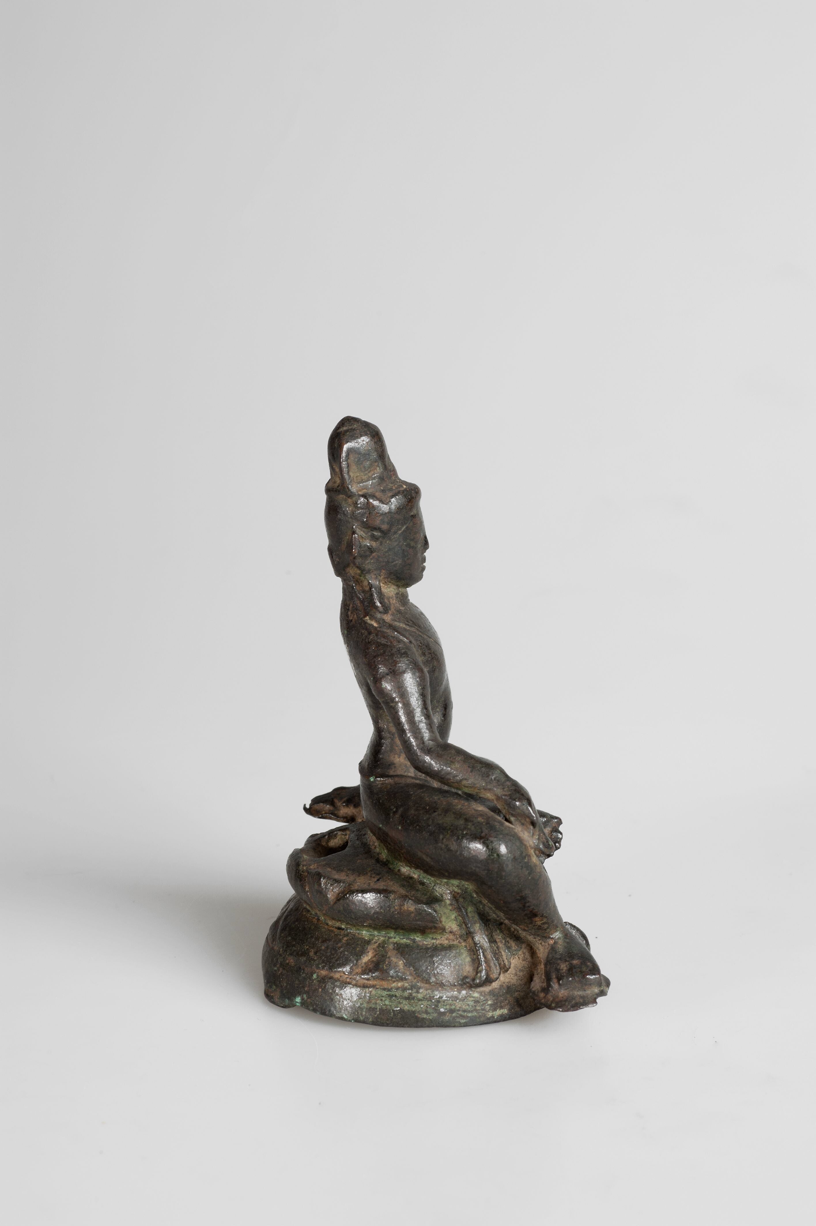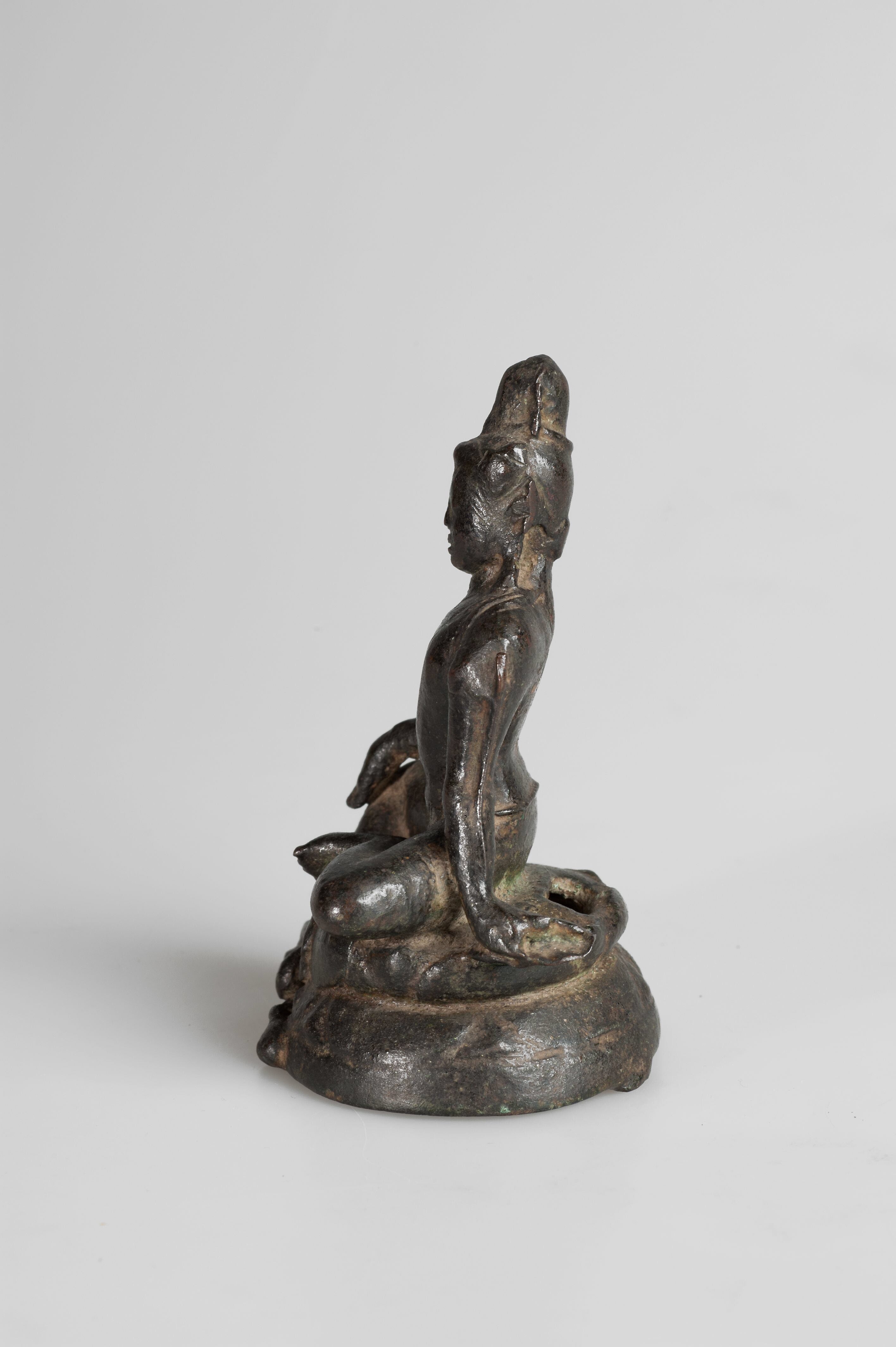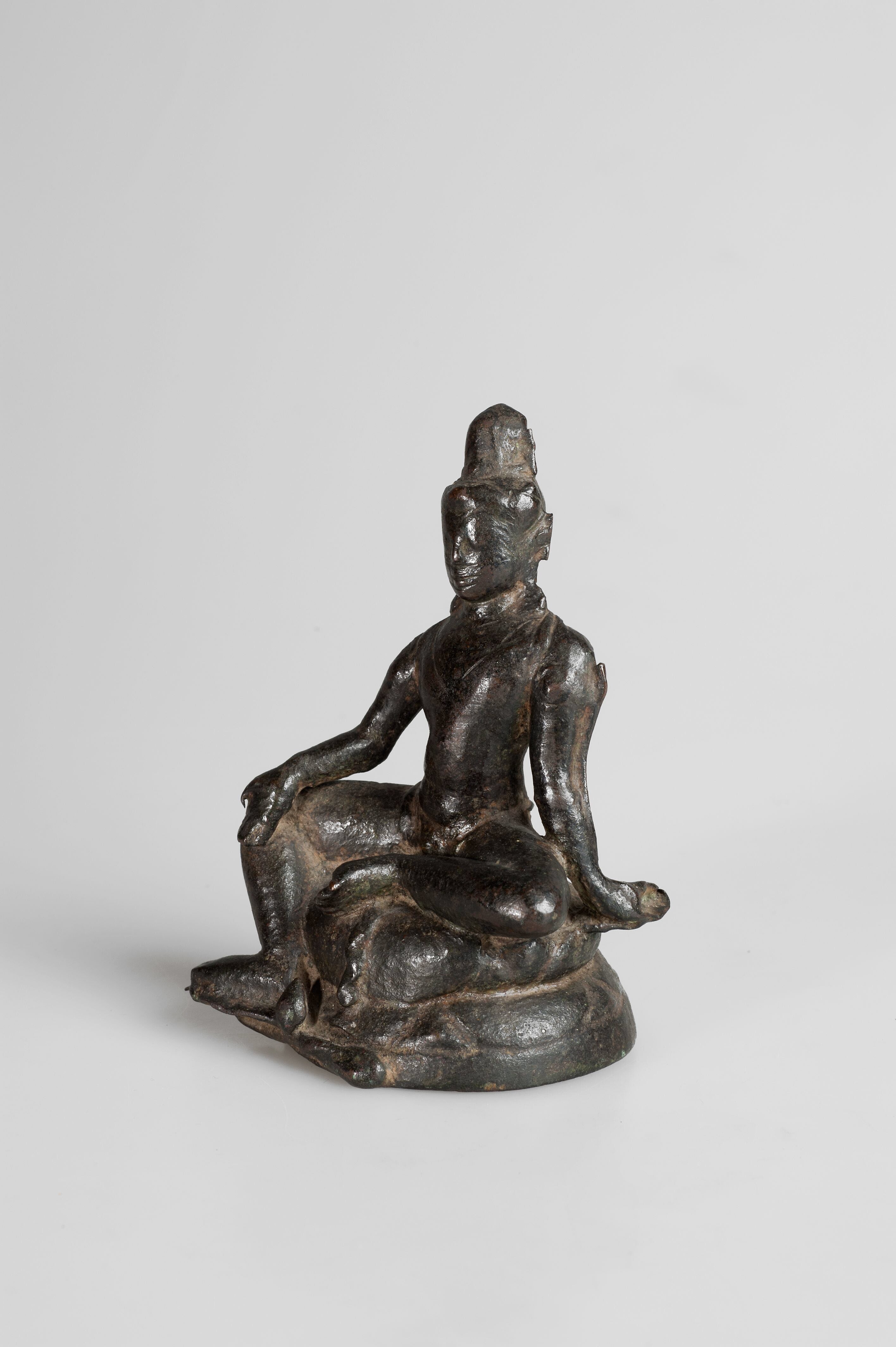 Avalokiteshvara zit met zijn ene been op de lotuszetel en de andere naar beneden, lalitasana.