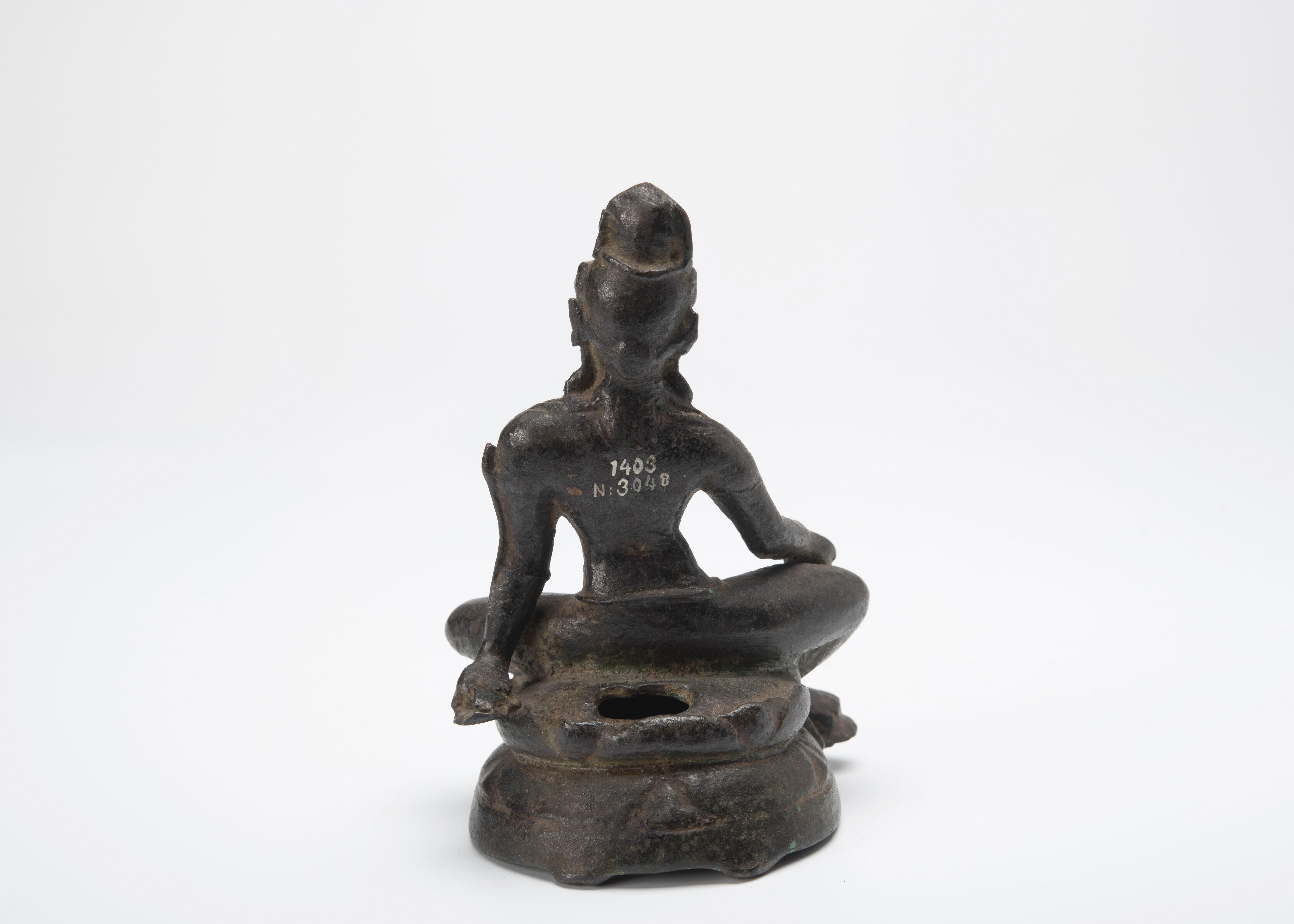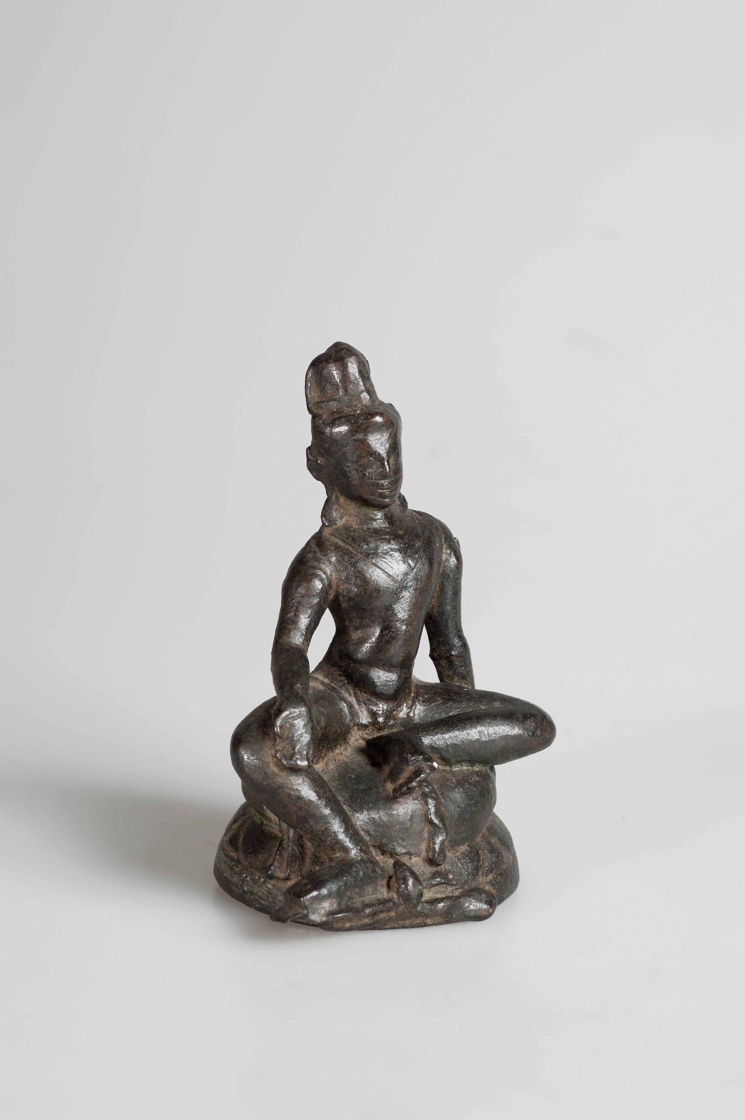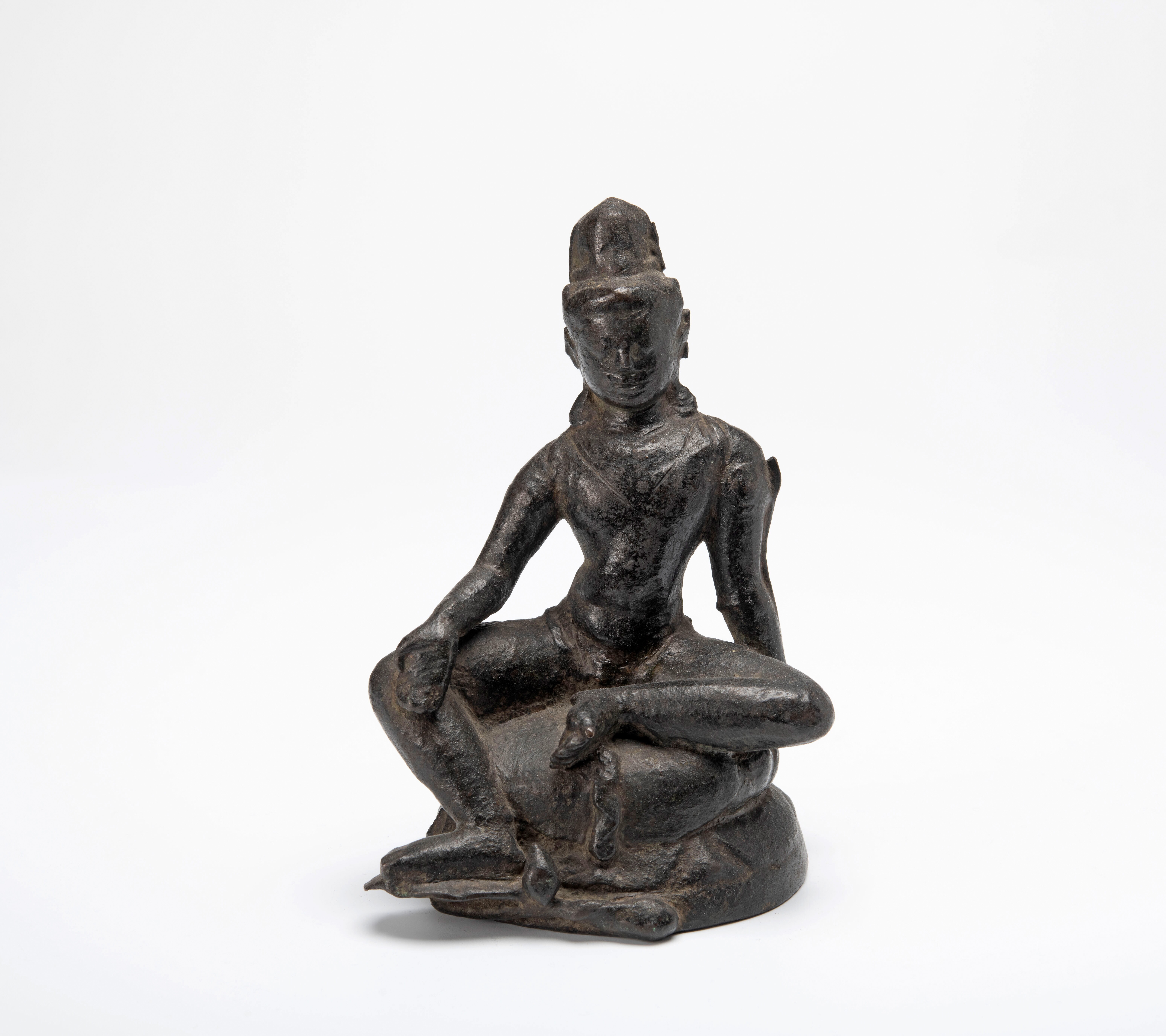Avalokiteshvara zit met zijn ene been op de lotuszetel en de andere naar beneden, lalitasana.