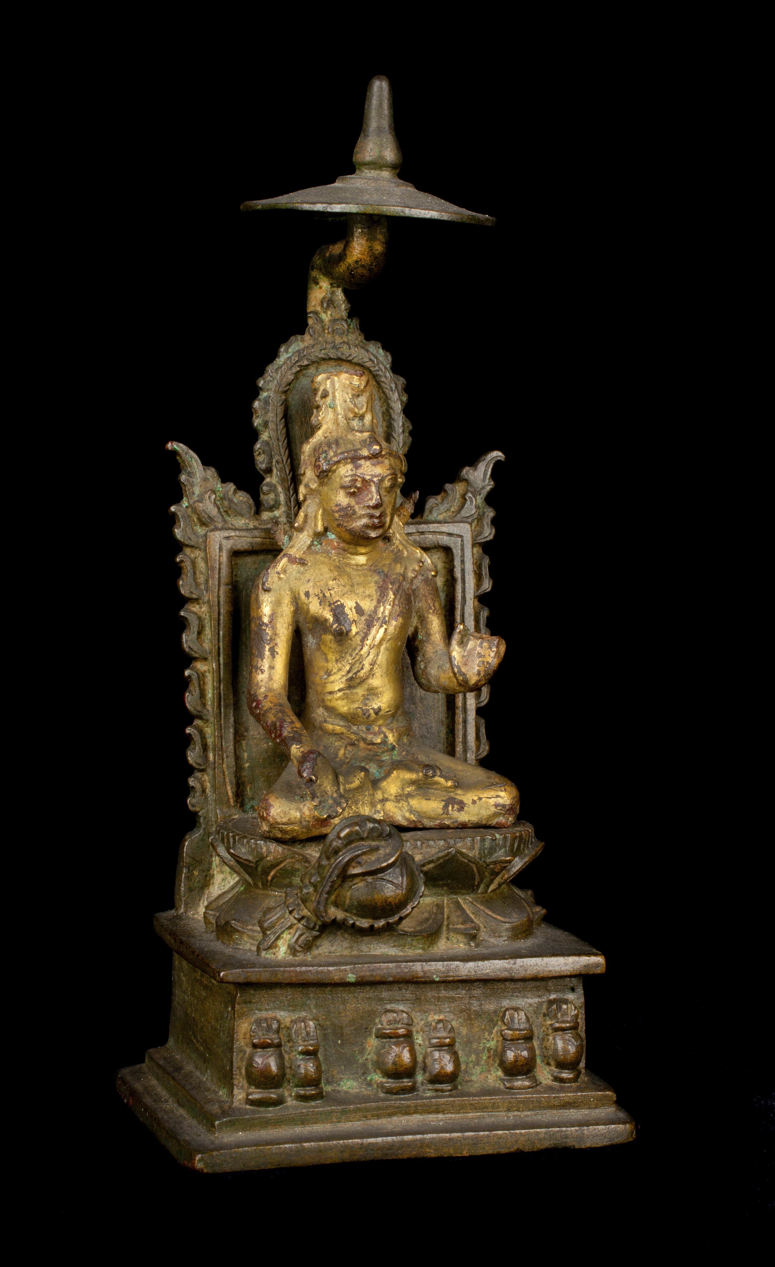 Het beeldje en de troon horen niet bij elkaar. Het vergulde beeldje representeert waarschijnlijk de Bodhisattva Avalokiteshvara. De troon is echter die van de god van de rijkdom. De troon heeft ronde potten, gevuld met parelsnoeren en andere juwelen, als verwijzing naar deze god van rijkdom.