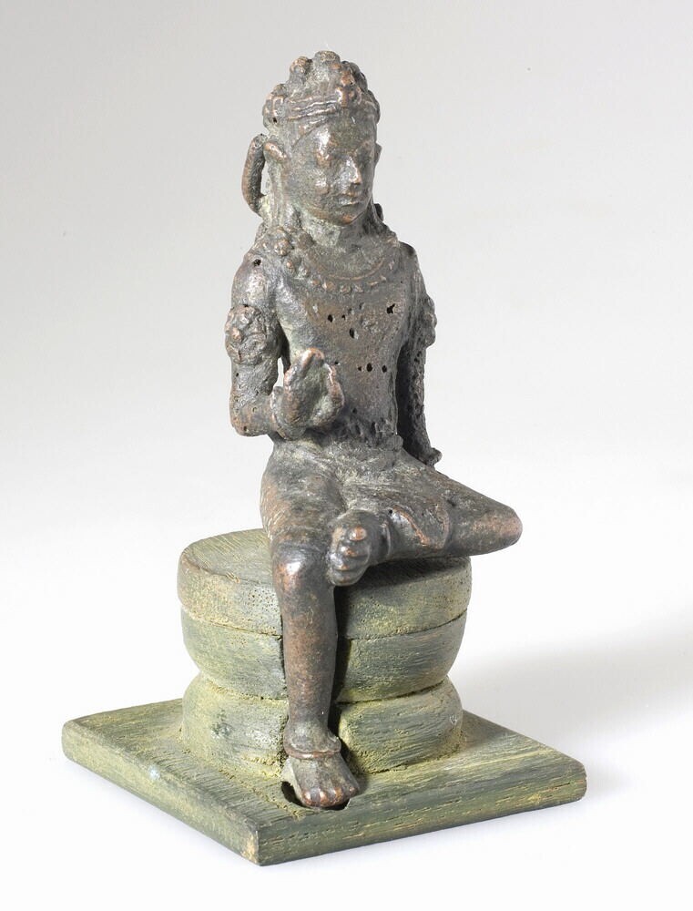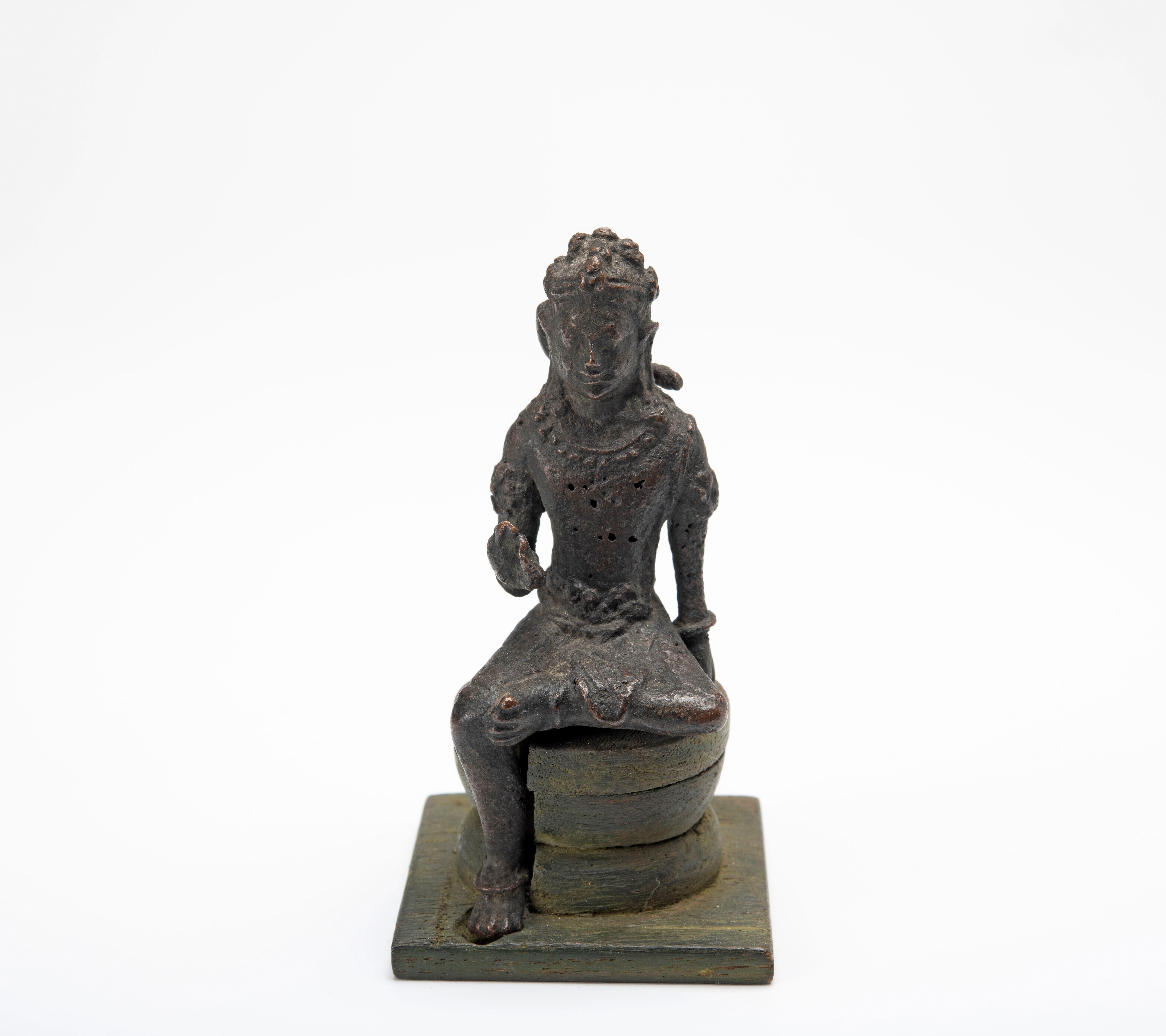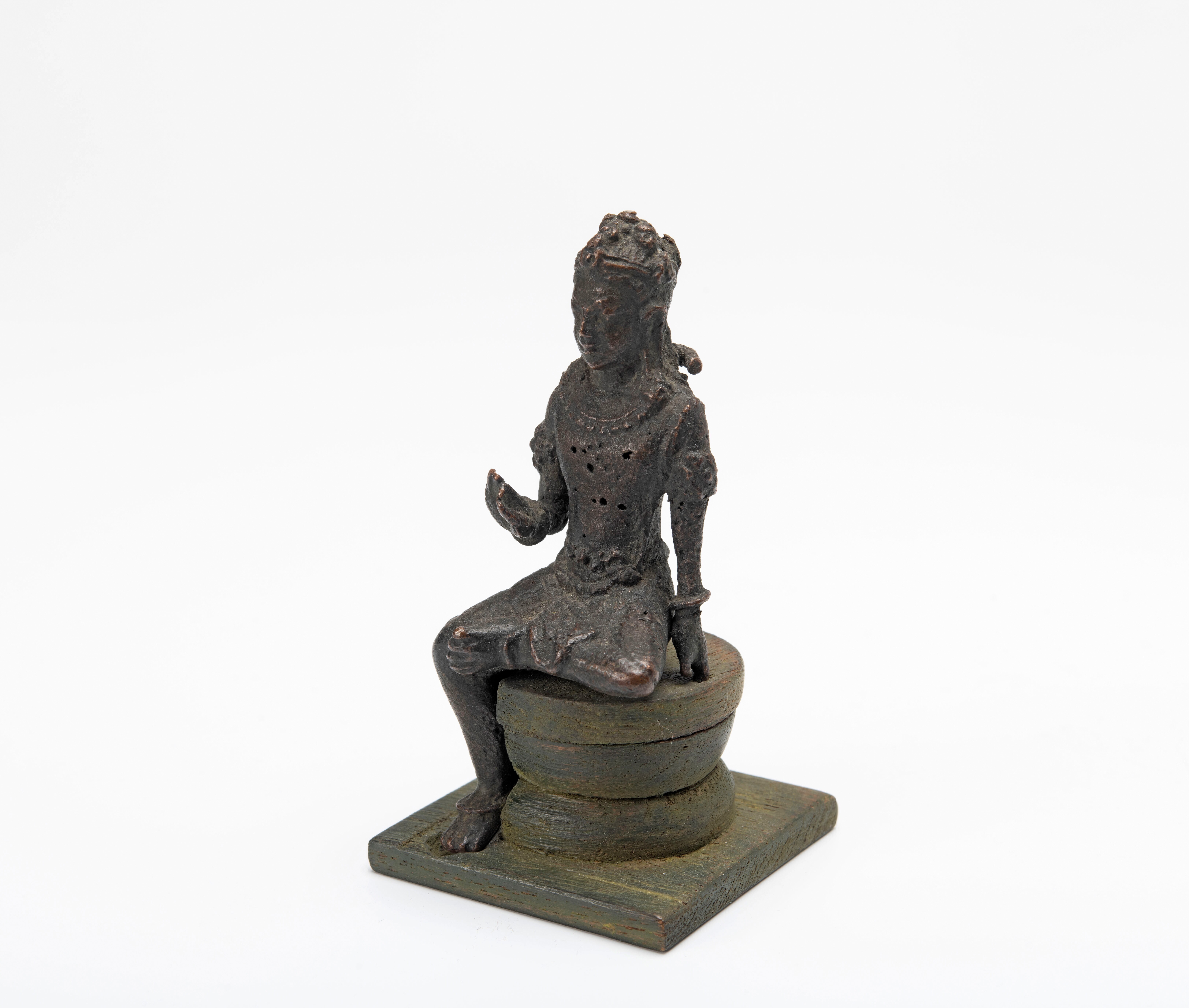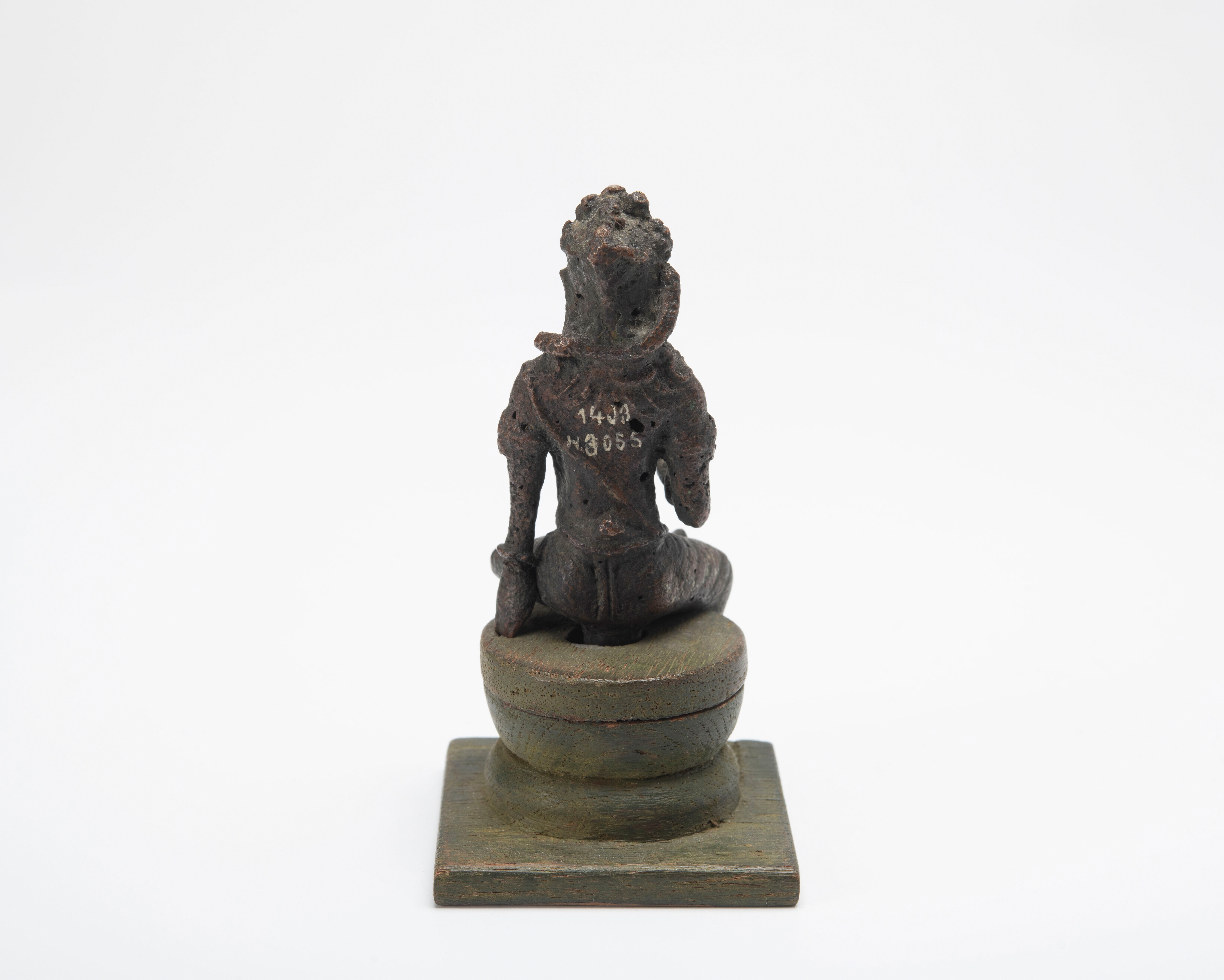 Dit verweerde beeldje staat beschreven als Avalokiteshvara, maar het zou ook de Bodhisattva Manjushri kunnen zijn, die gekenmerkt wordt door drie of vijf haarstrengen die op het hoofd opbollen.