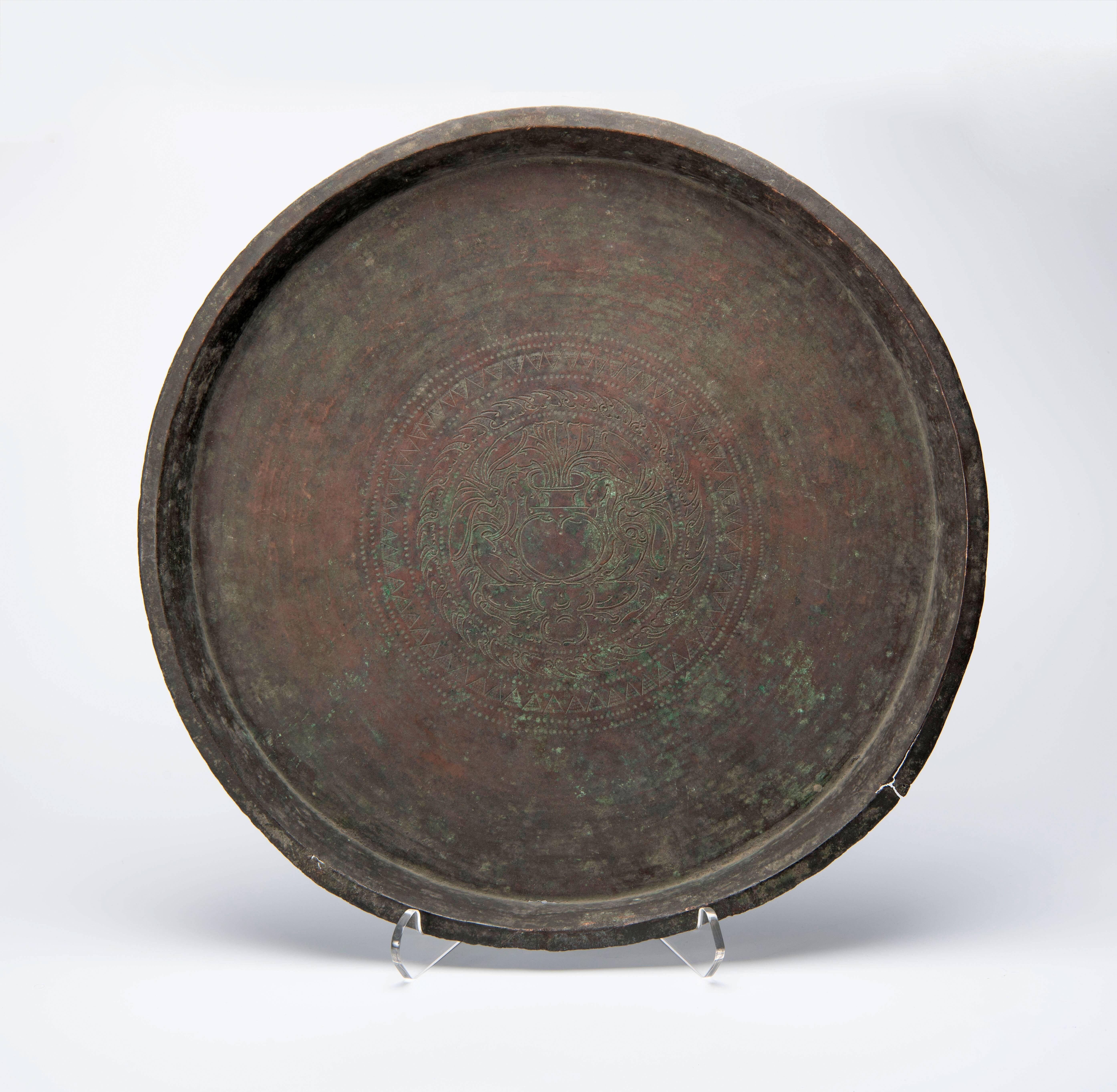 In het midden van deze schaal is een vaas met bloemen gegraveerd. Het is een gelukbrengend motief.