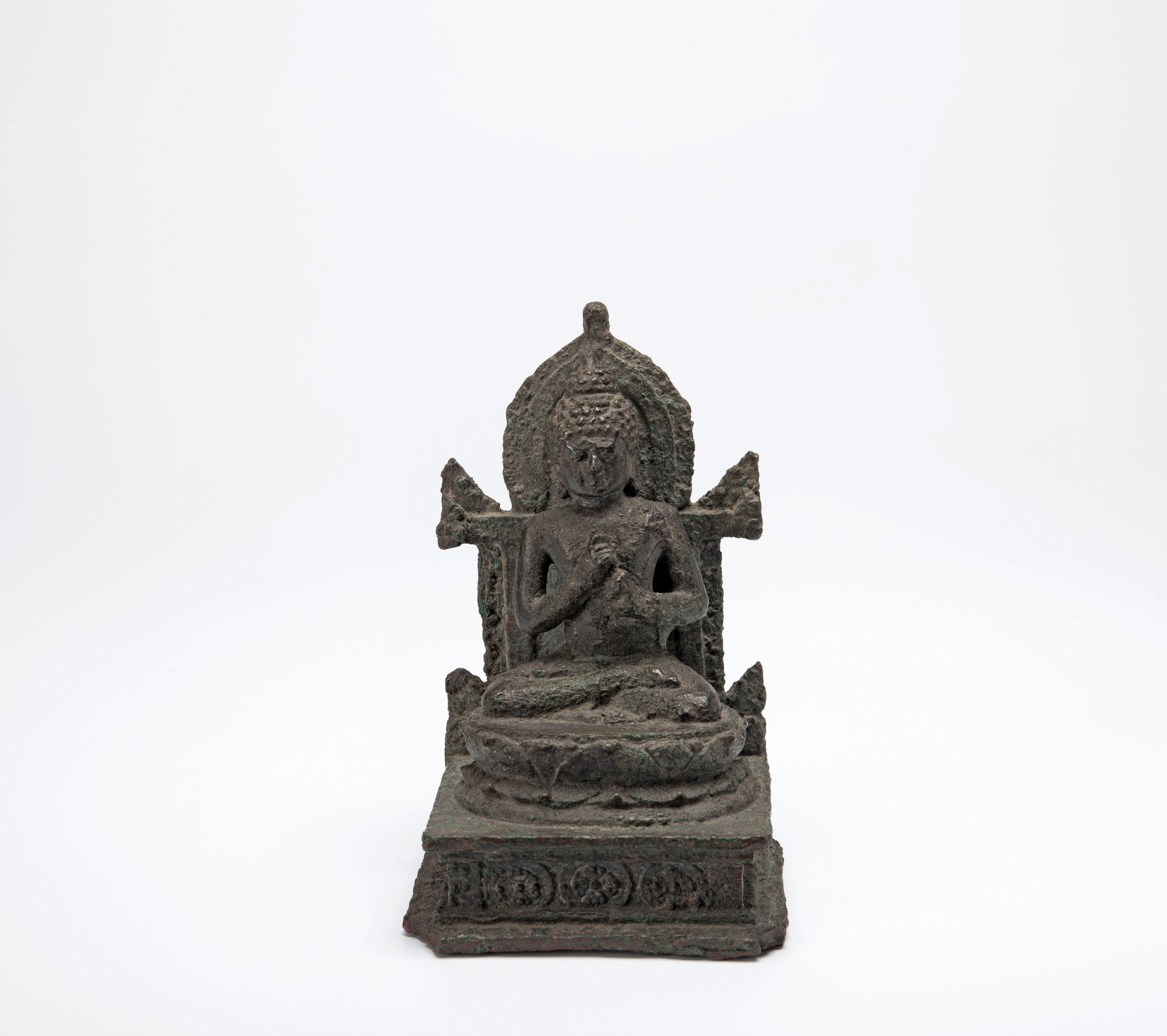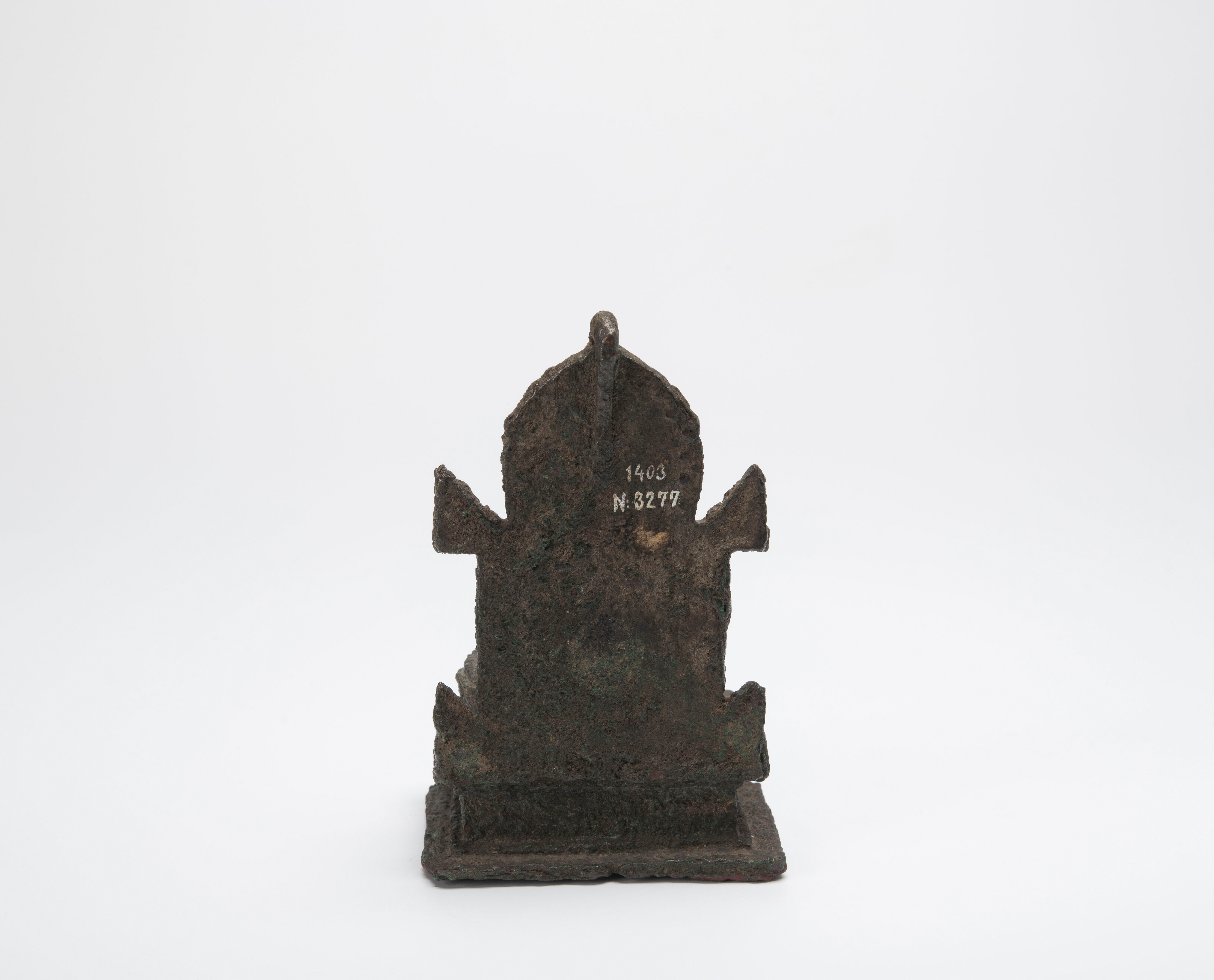 Dit beeldje toont een krullerige bladerrand om het achterstuk, wat erop duidt dat het van na de 9e eeuw dateert.