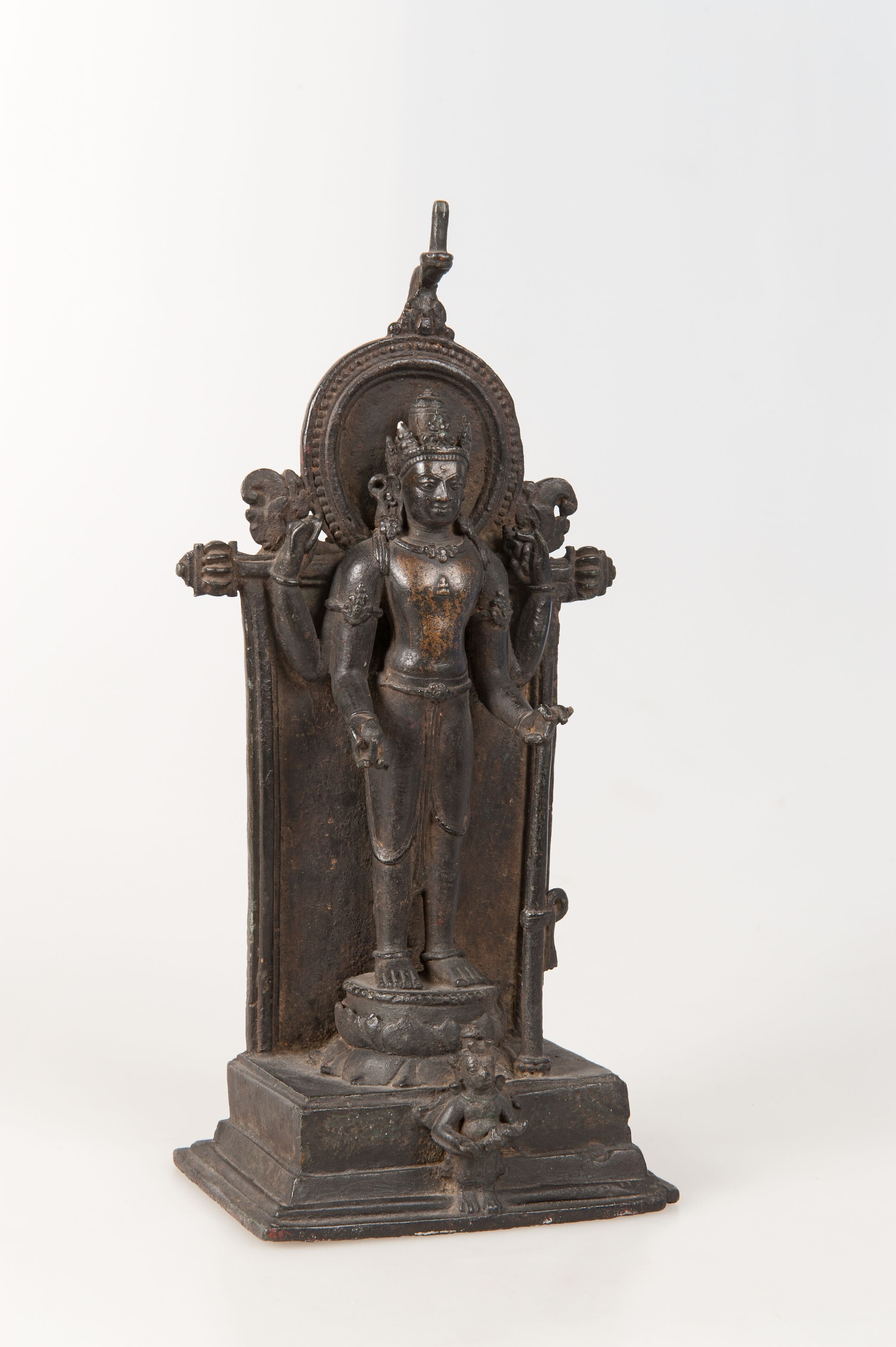 In zijn bovenste rechterhand draagt Vishnu een discus, cakra. In zijn onderste rechterhand zit een bolletje aarde, bhu. In zijn onderste linkerhand houdt hij een knots, gada, vast. In zijn bovenste linkerhand zit een schelphoorn. Dit beeldje toont Indiase kenmerken. Het werd mogelijk vanuit India geïmporteerd. Op het voetstuk zit Garuda, de mythische adelaar die ...