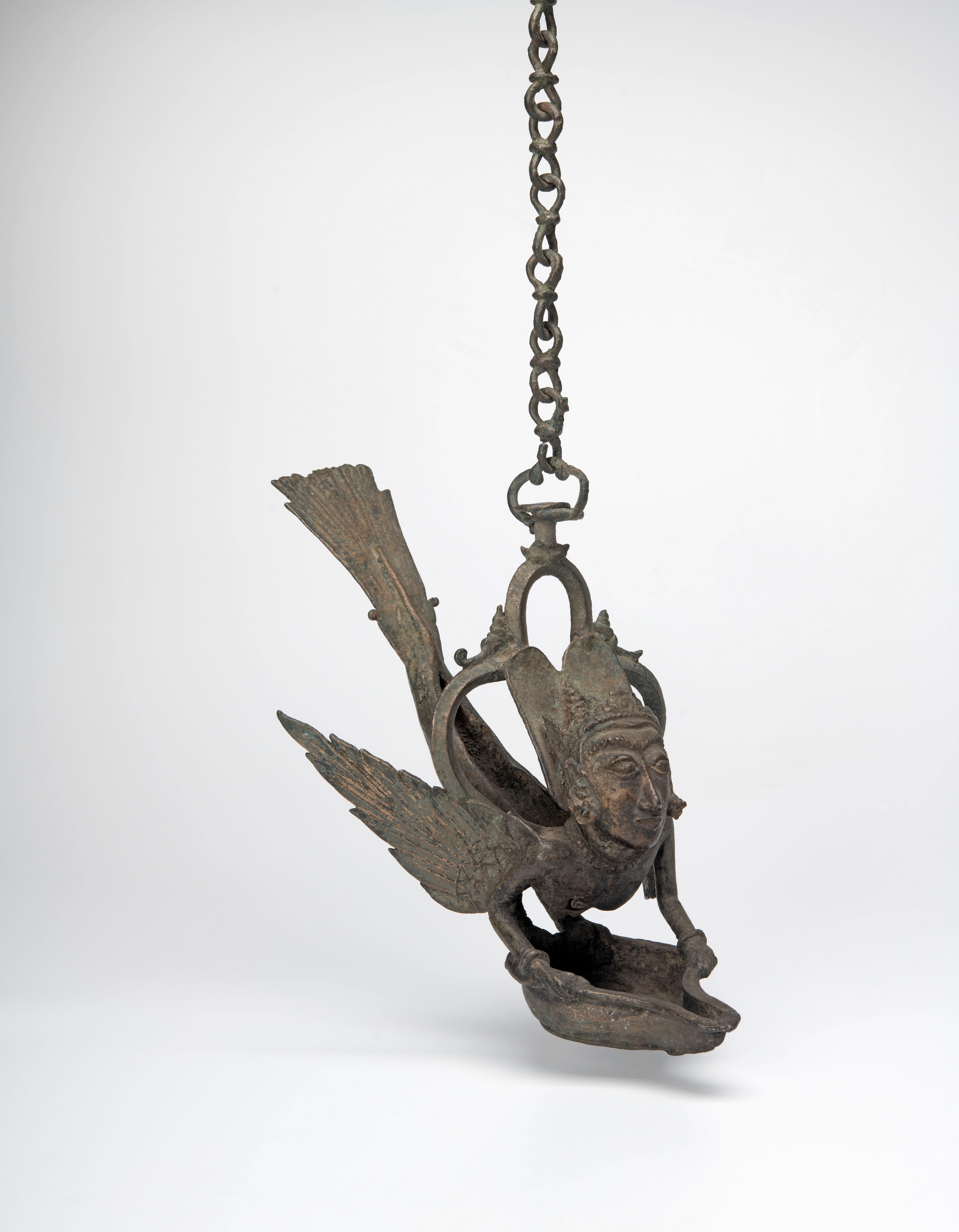 Het reservoirtje voor de olie wordt vastgehouden door een kinnari, een hemels wezen met het hoofd en de borsten van een vrouw en het lichaam, poten en vleugels van een vogel.