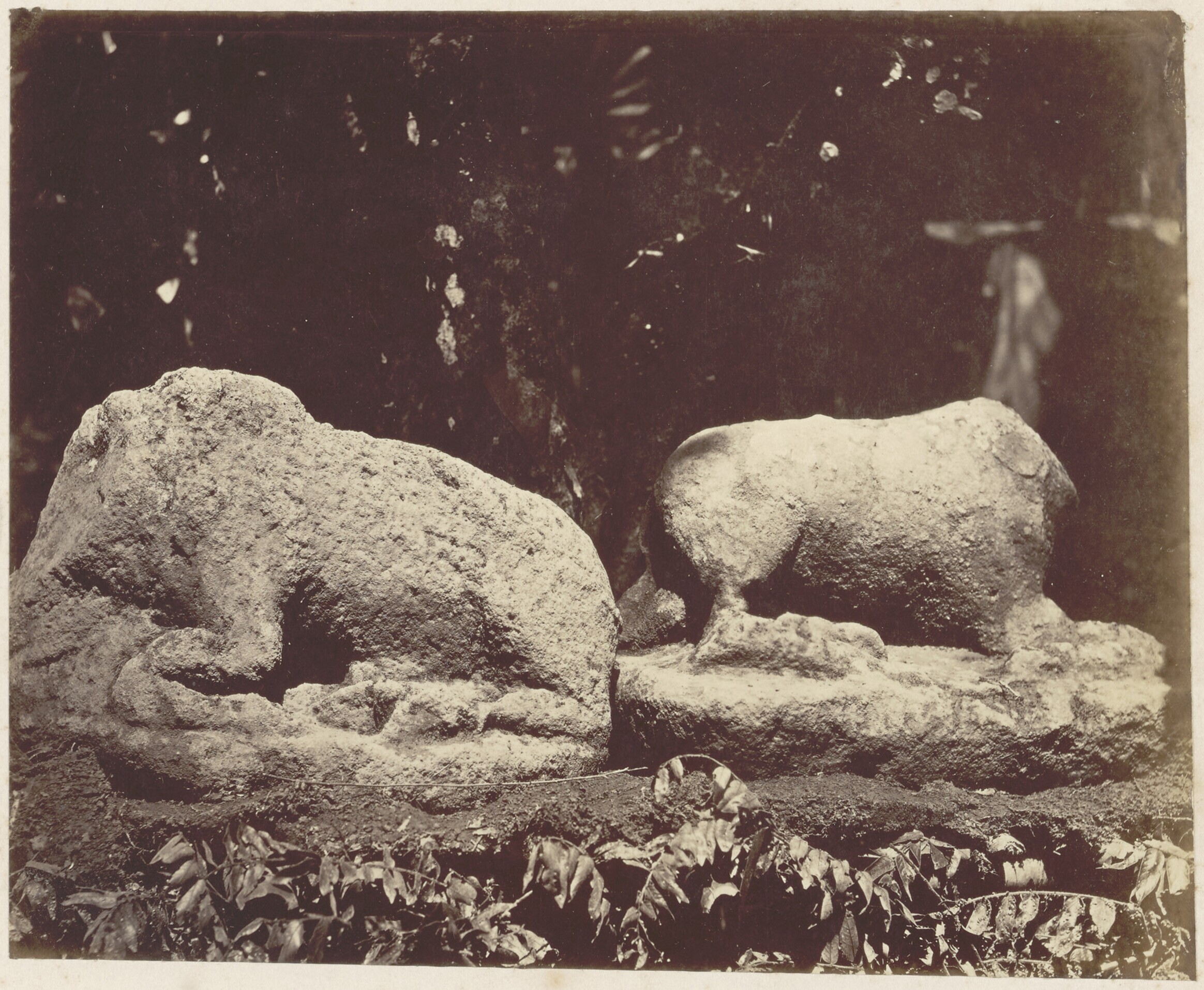 Een foto van twee stenen beelden (Nandi's) in Tjoepoe bij Bandoeng