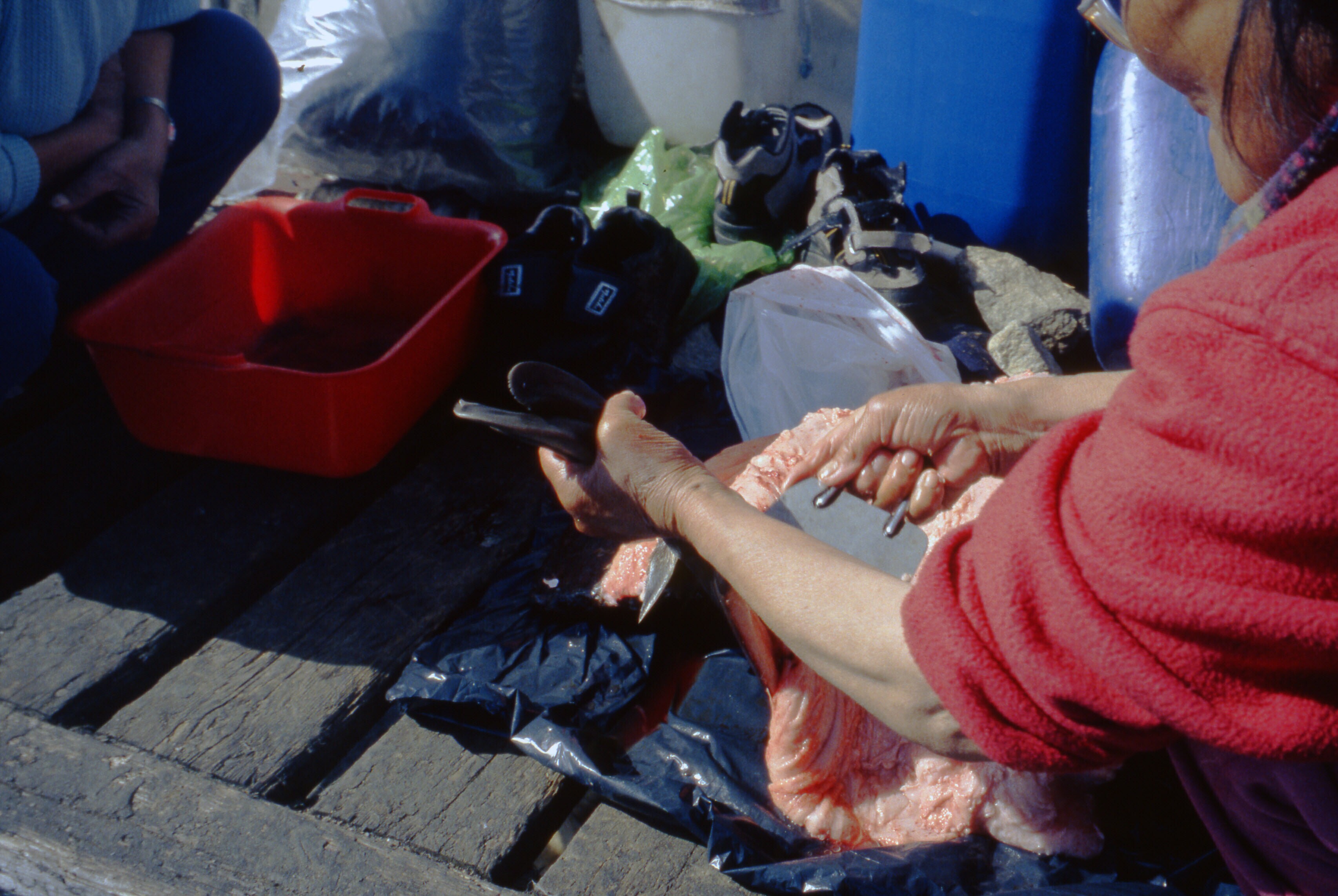 Buijs dia's 2001: Zeehondenhuid schrapen Asta Thomassen. Ulrike + kleinzoon (baby)