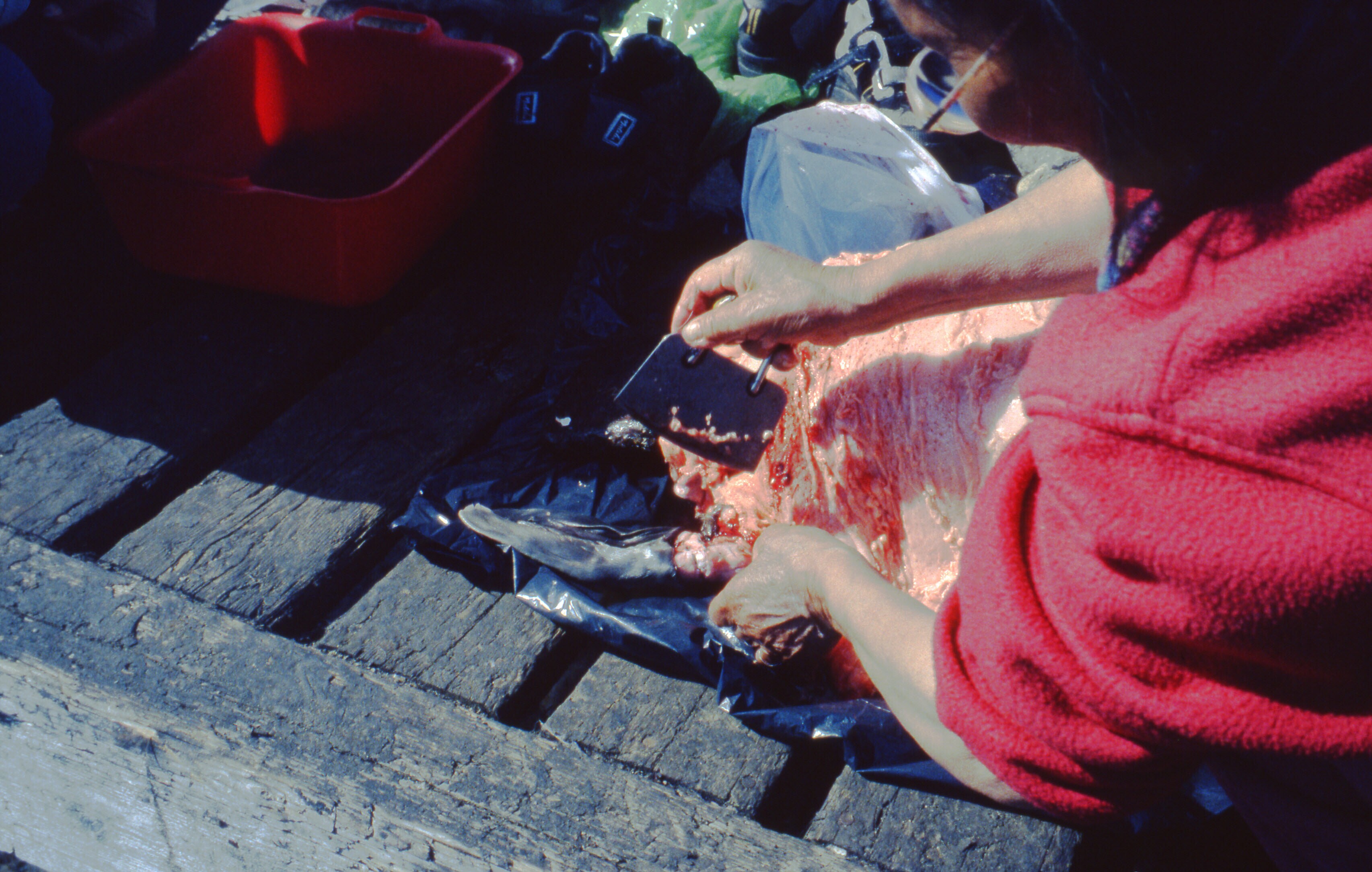 Buijs dia's 2001: Zeehondenhuid schrapen Asta Thomassen. Ulrike + kleinzoon (baby)
